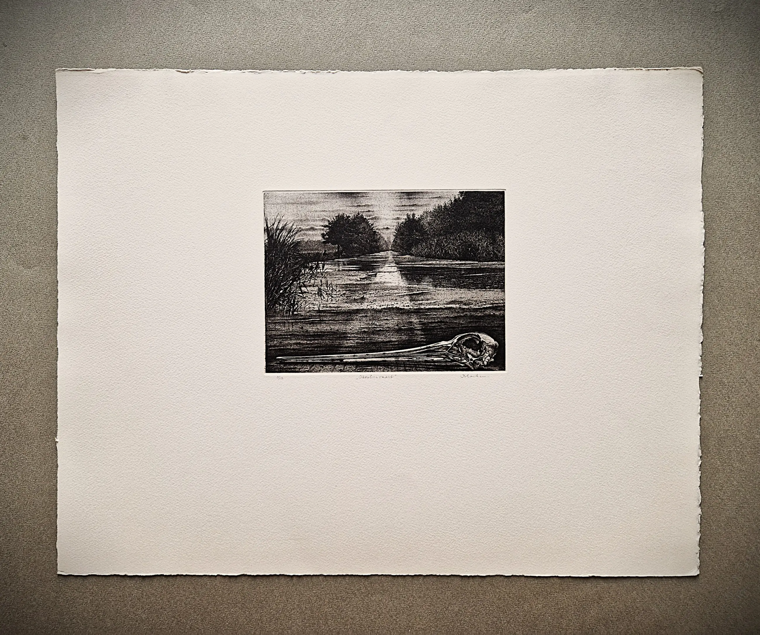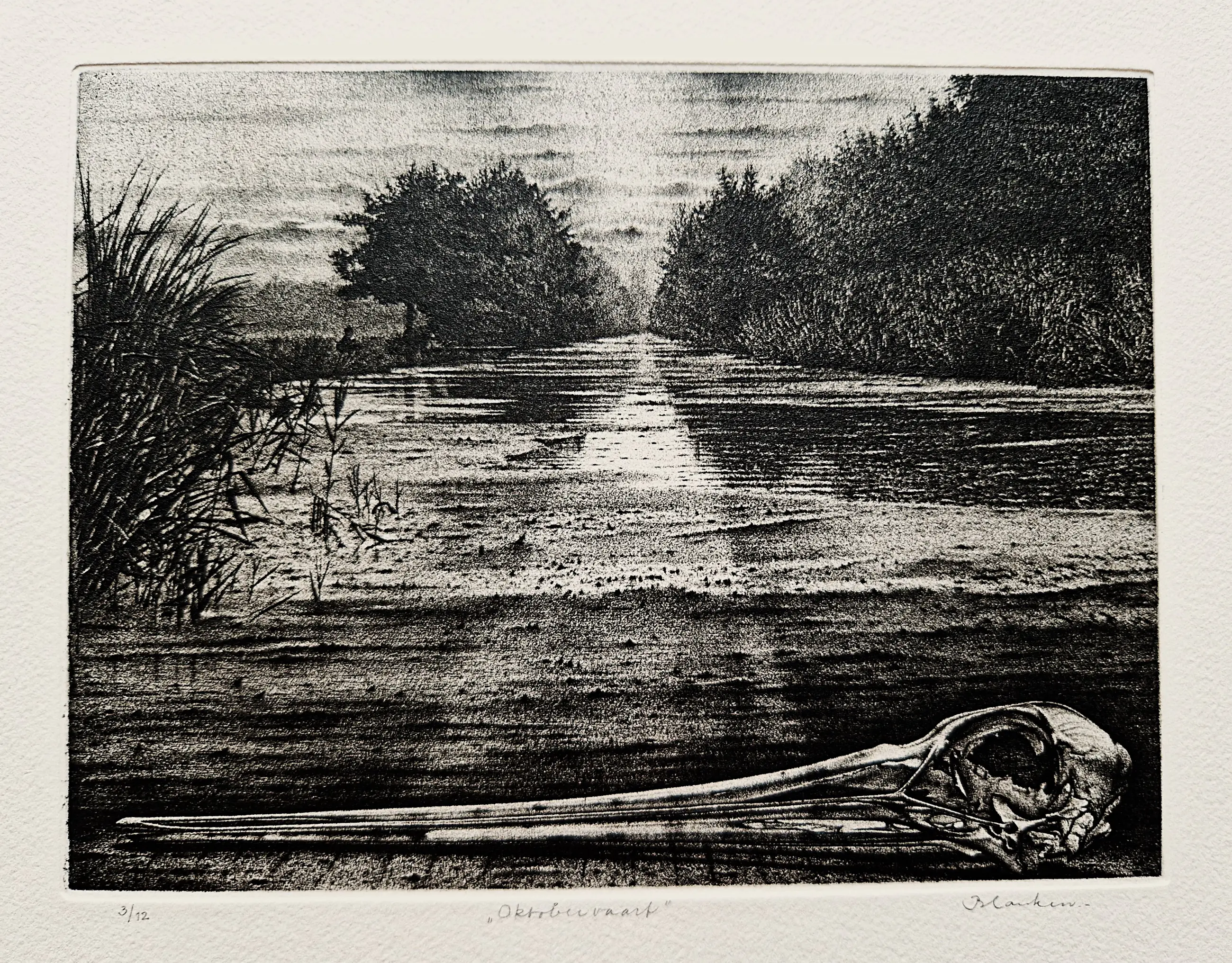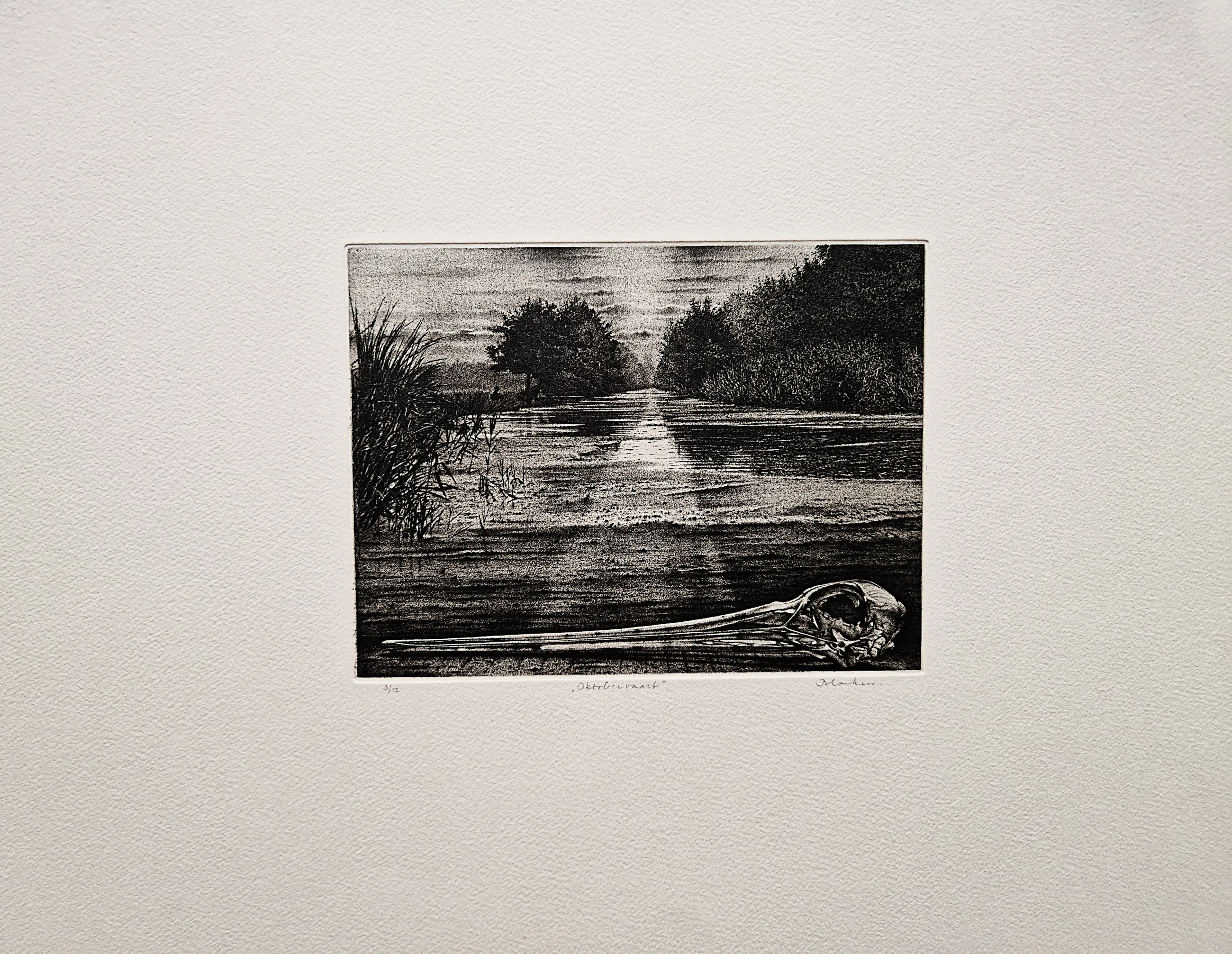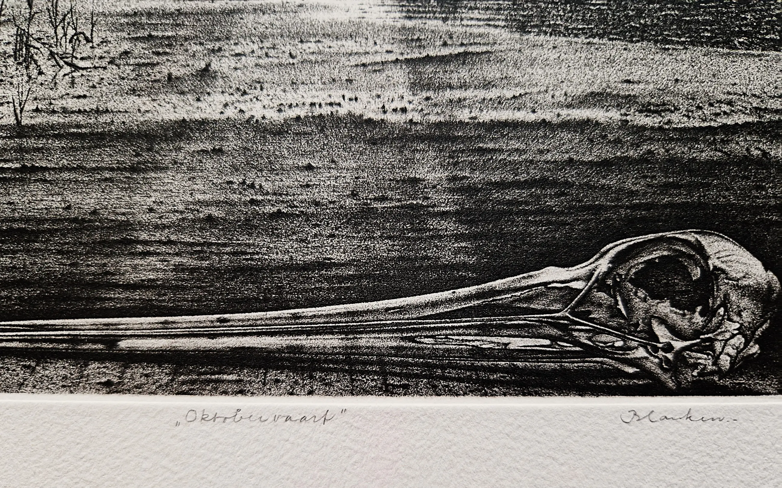 Ets door Hans Blanken. Voorstelling getiteld: Oktobervaart Losbladig, beeldmaat 12x16.5, bladmaat 32x42 Gesigneerd in potlood rechtsonder: `Blanken` Genummerd in potlood linksonder: 3/12