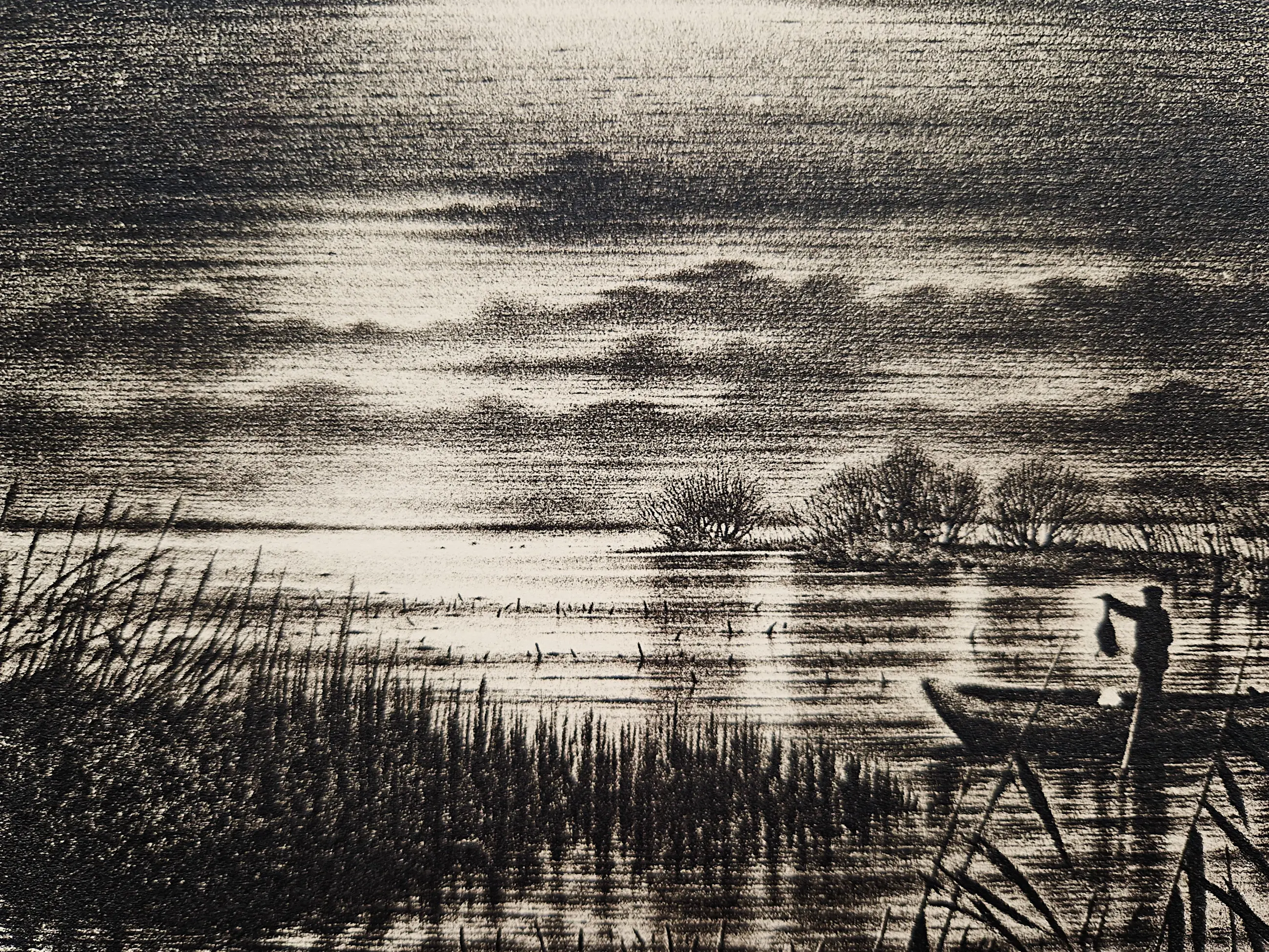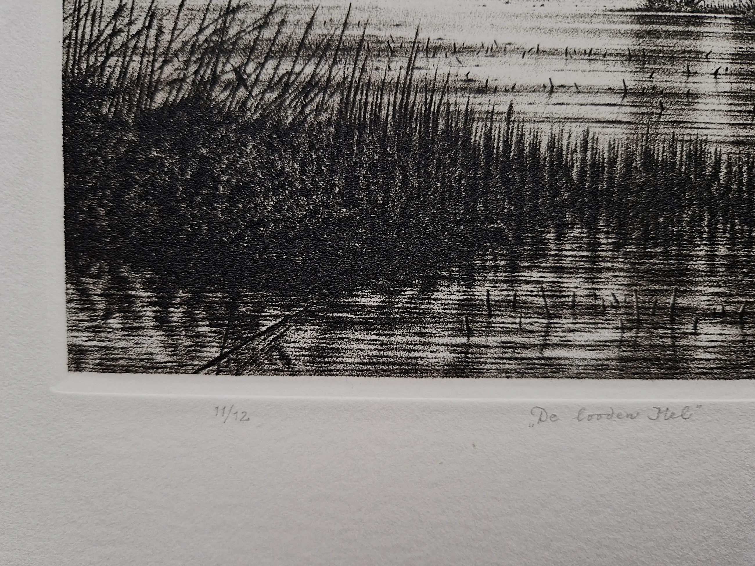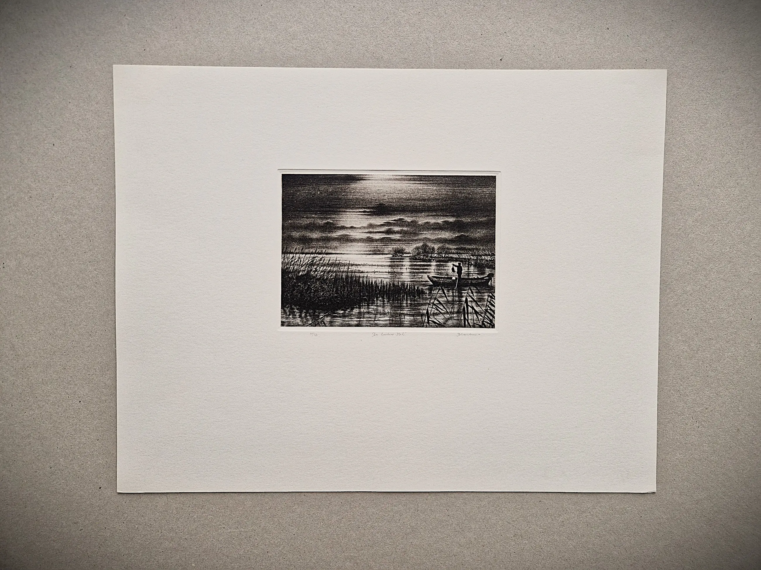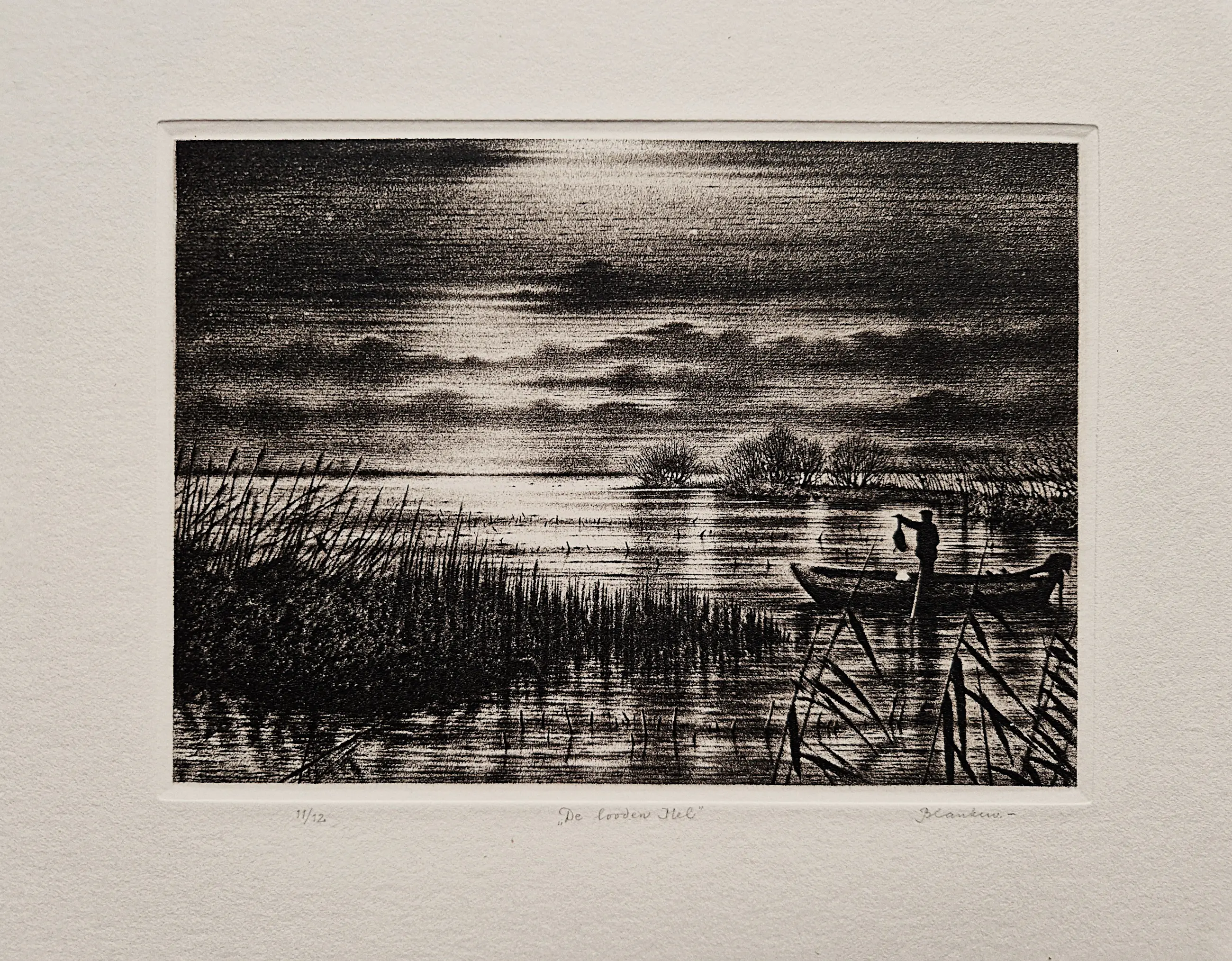 droge naald Ets door Hans Blanken. Voorstelling getiteld: nachtvisser / de Looden hel Losbladig, beeldmaat 12 x 16cm, bladmaat 31x40 Gesigneerd in potlood rechtsonder: `Blanken` Genummerd in potlood linksonder: 3/12