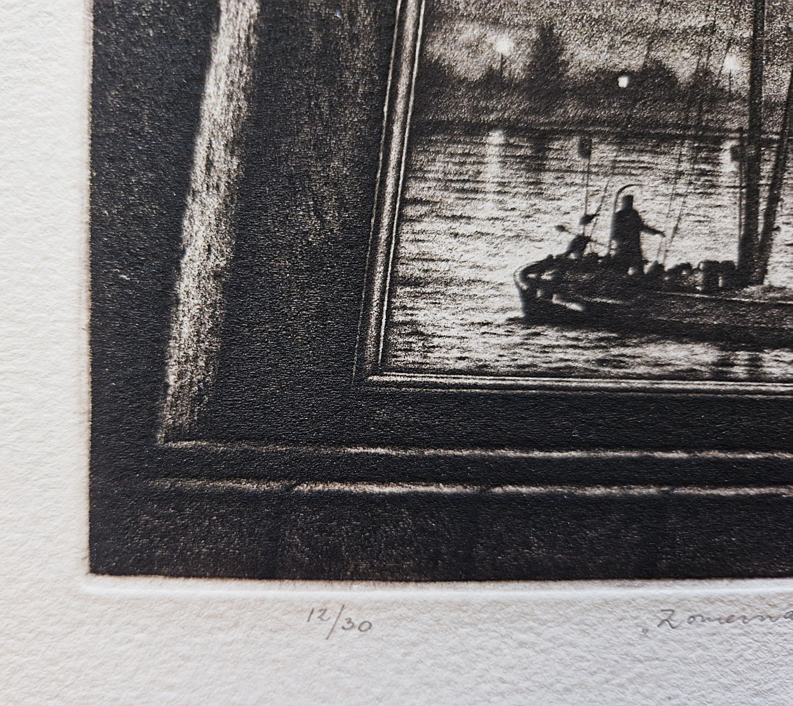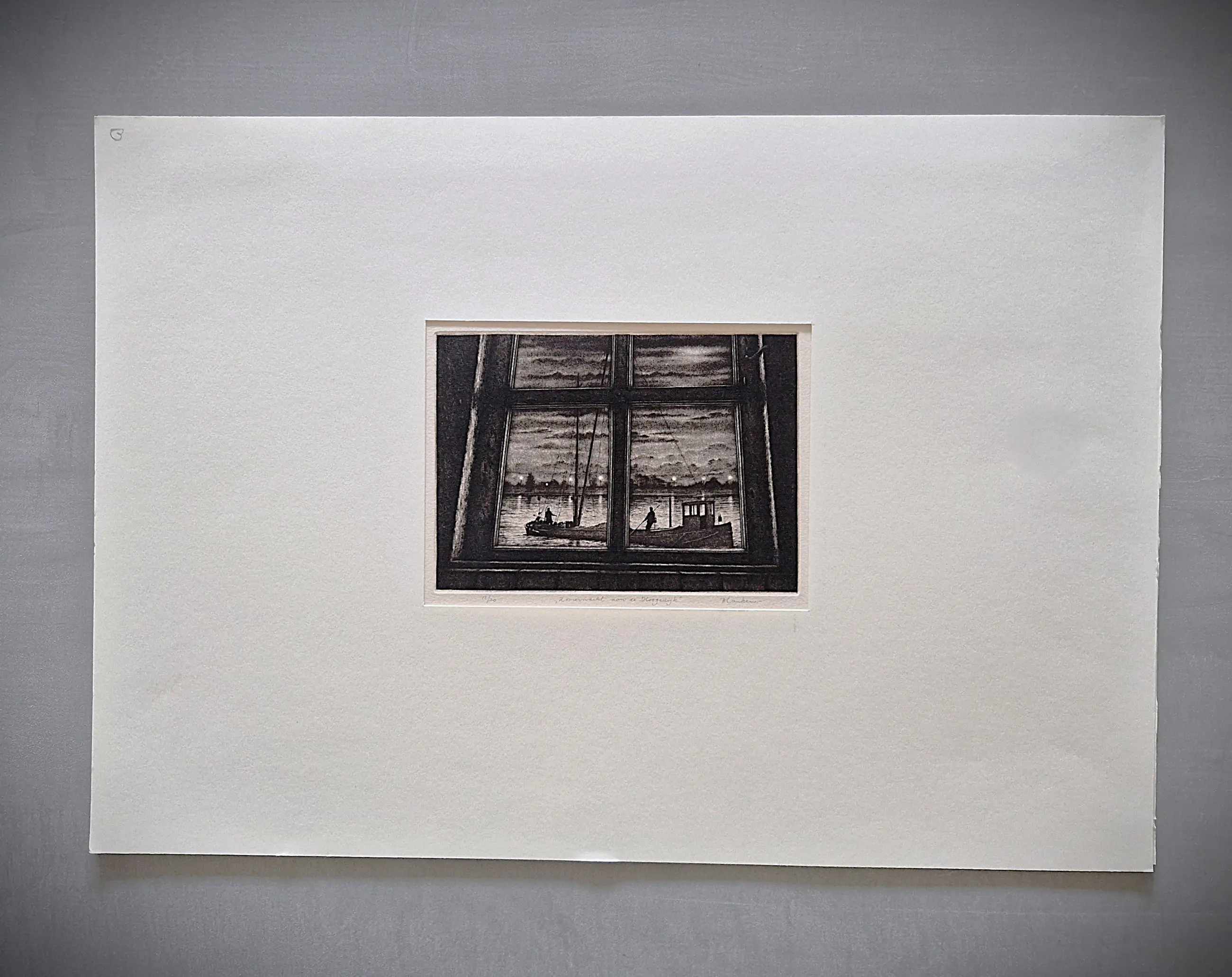 droge naald Ets door Hans Blanken. Voorstelling getiteld: "zomernacht aan de Hoogedijk" Losbladig, beeldmaat 12.5 x 16cm, bladmaat 33x42 Gesigneerd in potlood rechtsonder: `Blanken` Genummerd in potlood linksonder: 12/30