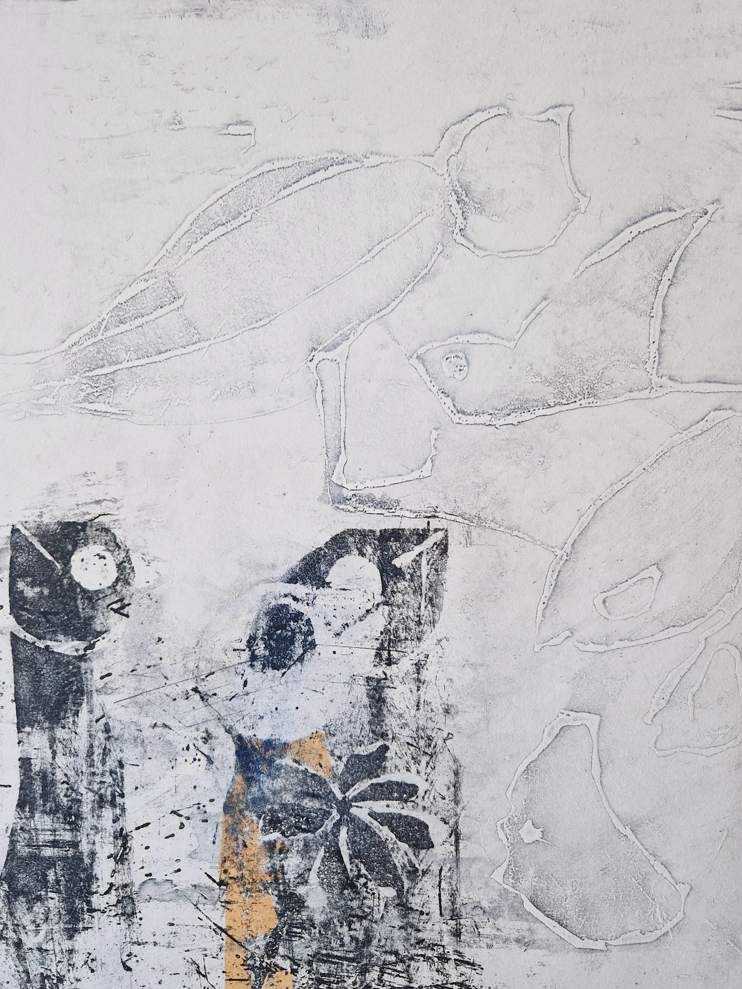 steeds aangepast aan en in harmonie met de afbeelding. In het werk dat hij recent heeft gemaakt, komt het voor dat de graficus voor een onderwerp als´waterkant´ alleen de kleuren geel en donker grijs-blauw gebruikt. Twee kleuren maar, die toch voldoende zijn om het onderwerp geloofwaardig uit te beelden.