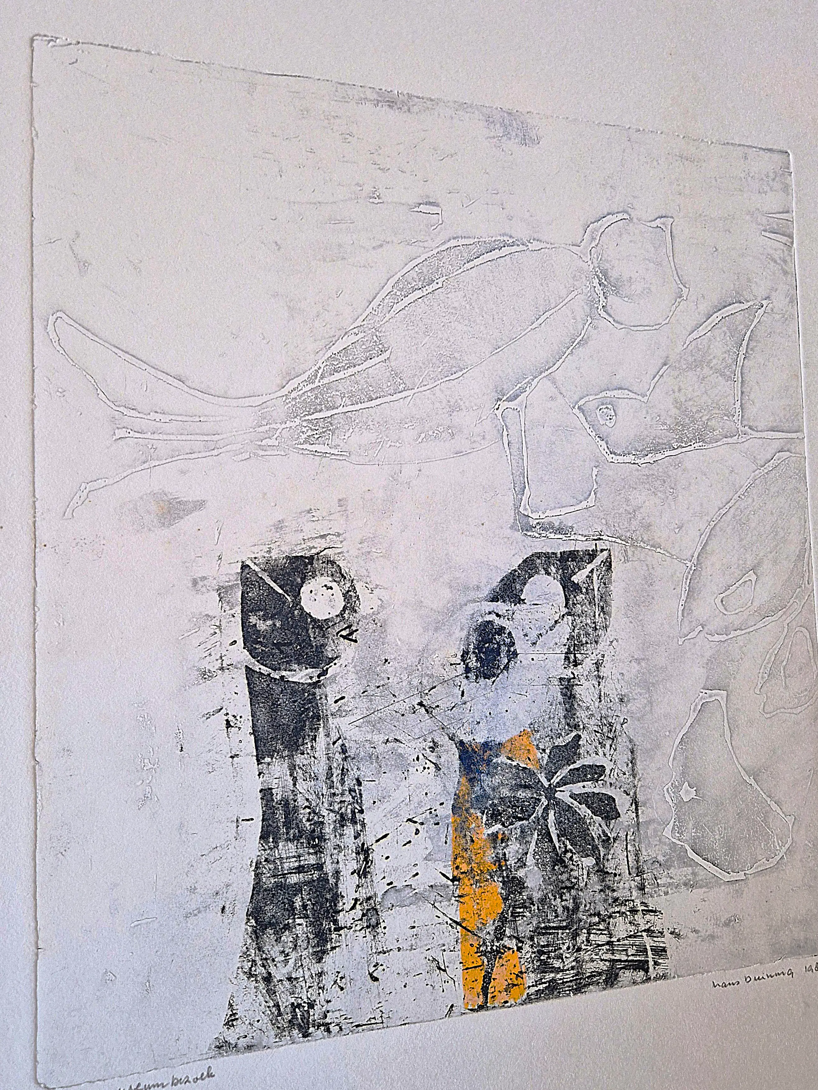 Hans Buining is op pas op latere leeftijd begonnen met etsen. Buining gebruikt in zijn grafisch werk een symbolentaal waar een zekere overeenkomst te vinden is met het werk van Jan Montijn. Echter deze symbolentaal is redelijk universeel, in zuid Frankrijk en noord Afrika gebruiken kunstenaars gelijksoortige figuren in hun werk. Buining gebruikt het materiaal zodanig dat het met de voorstelling is verweven. Daarin ligt ook de kracht van zijn werk. Vooral bij een ets als ´Amsterdam´ wordt duidelijk hoeveel kracht de grafiek ontleent aan de diepe kerven die in de etsplaat zijn aangebracht en aan de uitgebeten structuur ervan. Die belangrijke functie van de etsplaat is duidelijk het gevolg van een groeiproces dat nog in volle gang is.