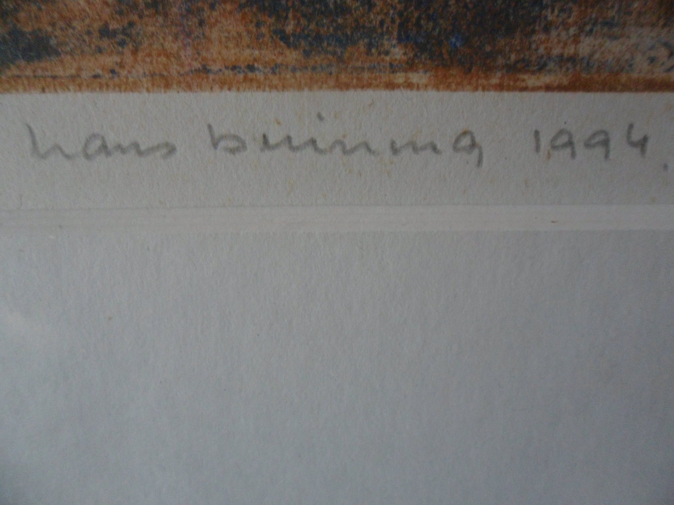 Hans Buining is op latere leeftijd begonnen met etsen. Buining gebruikt in zijn grafisch werk een symbolentaal waar een zekere overeenkomst te vinden is met het werk van Jan Montijn. Echter deze symbolentaal is redelijk universeel, in zuid Frankrijk en noord Afrika gebruiken kunstenaars gelijksoortige figuren in hun werk. Kenmerkend voor het werk van Hans Buining is dat hij het materiaal zodanig gebruikt dat het met de voorstelling verweven is. Hierin ligt ook de kracht van zijn werk. Het kleurgebruik van Buining is ingetogen en in harmonie met de afbeelding. Het werk van Hans Buining is nog steeds in ontwikkeling, het huidige werk van Buining heeft een meer verhalende beeldtaal echter de figuratie is nog goed herkenbaar.