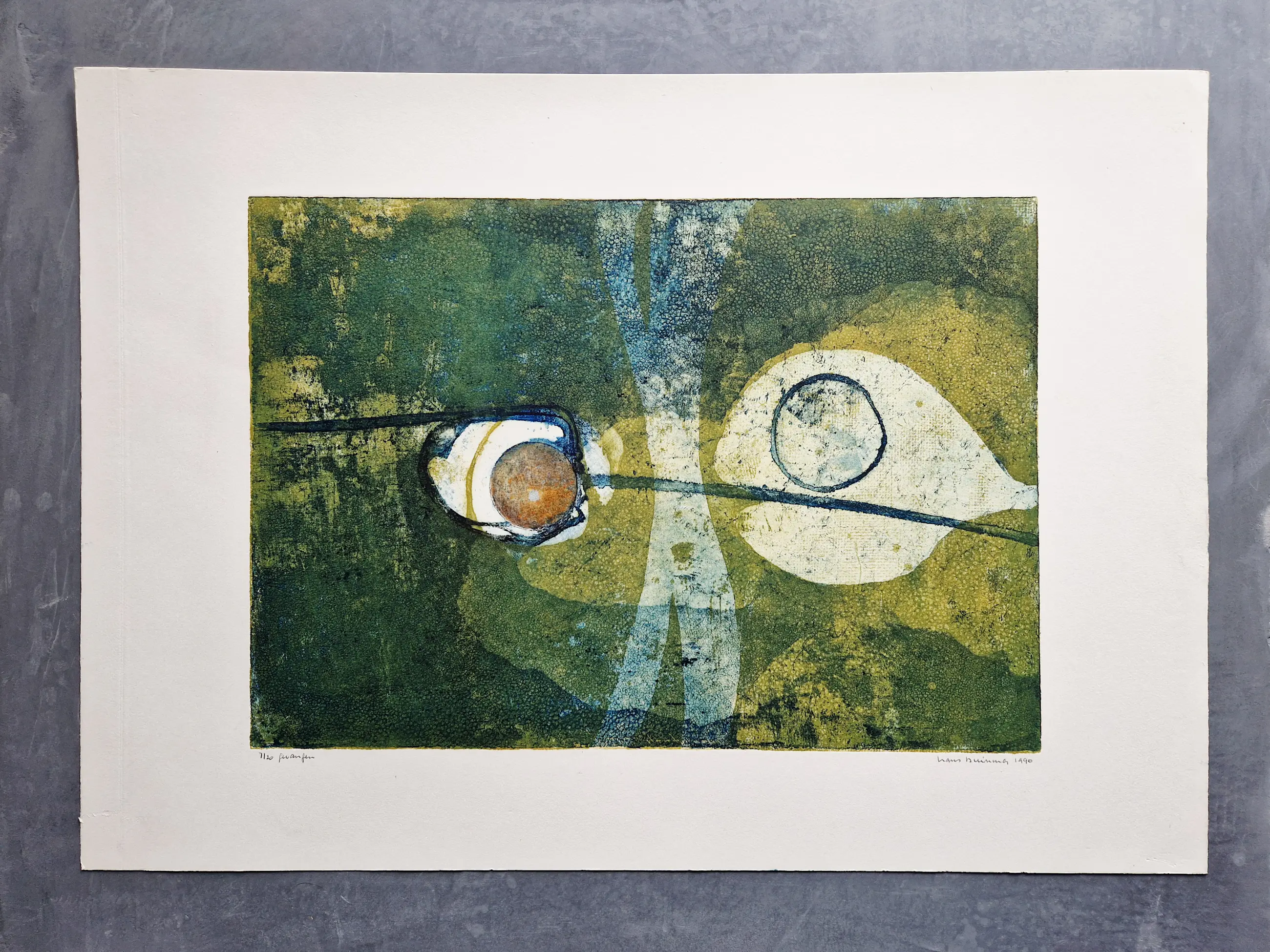 steeds aangepast aan en in harmonie met de afbeelding. In het werk dat hij recent heeft gemaakt, komt het voor dat de graficus voor een onderwerp als´waterkant´ alleen de kleuren geel en donker grijs-blauw gebruikt. Twee kleuren maar, die toch voldoende zijn om het onderwerp geloofwaardig uit te beelden.