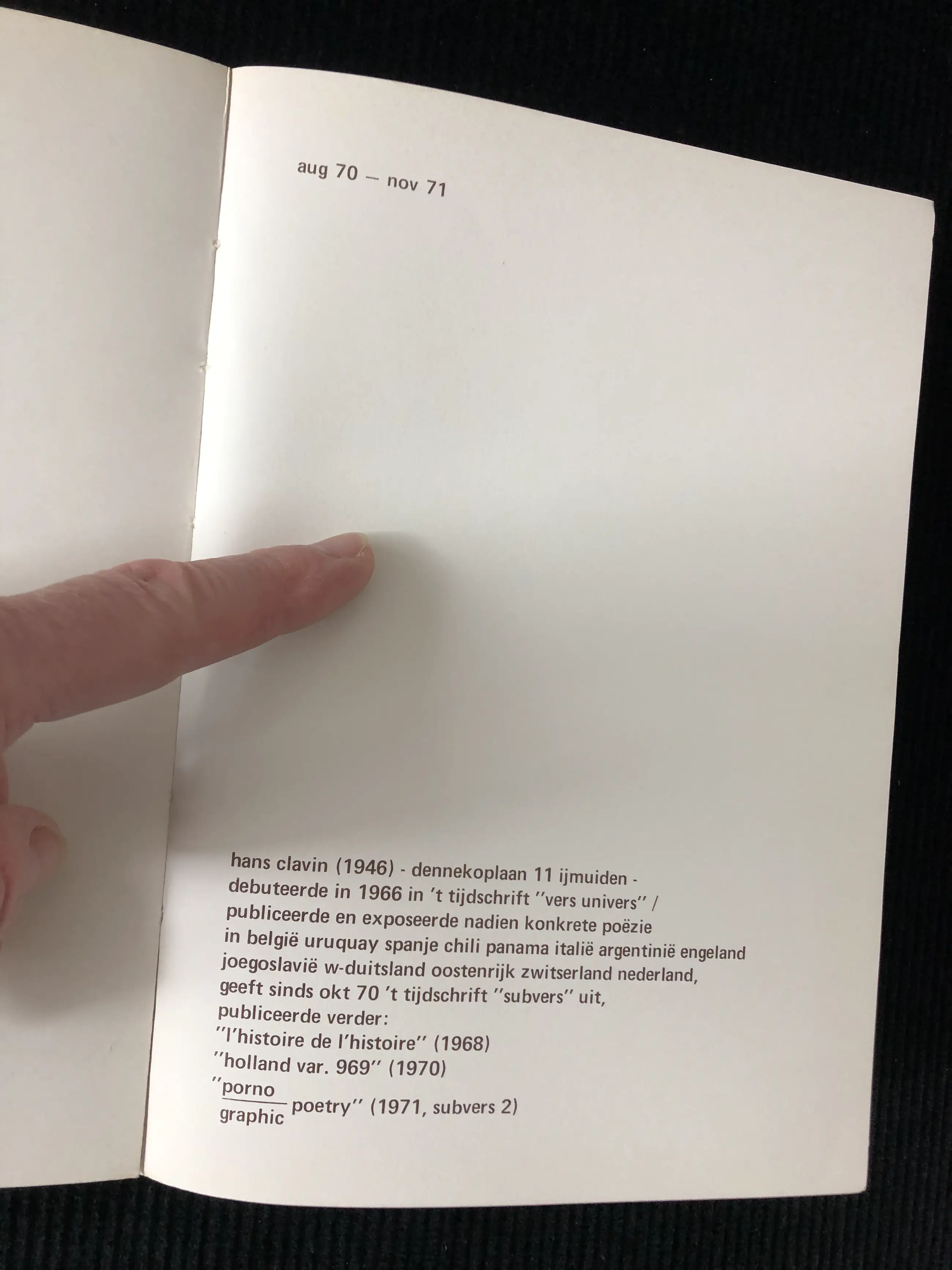 Het werk van Clavin (ps. van Hans van der Heijden) beweegt zich op het grensvlak van literatuur en beeldende kunst, m.n. Pop-Art en Zero-kunst. Het aangeboden boek kan dan ook als een "kunstenaarsboek" worden gezien. Het is een stimulerend voorbeeld in het genre 'visuele poëzie'.