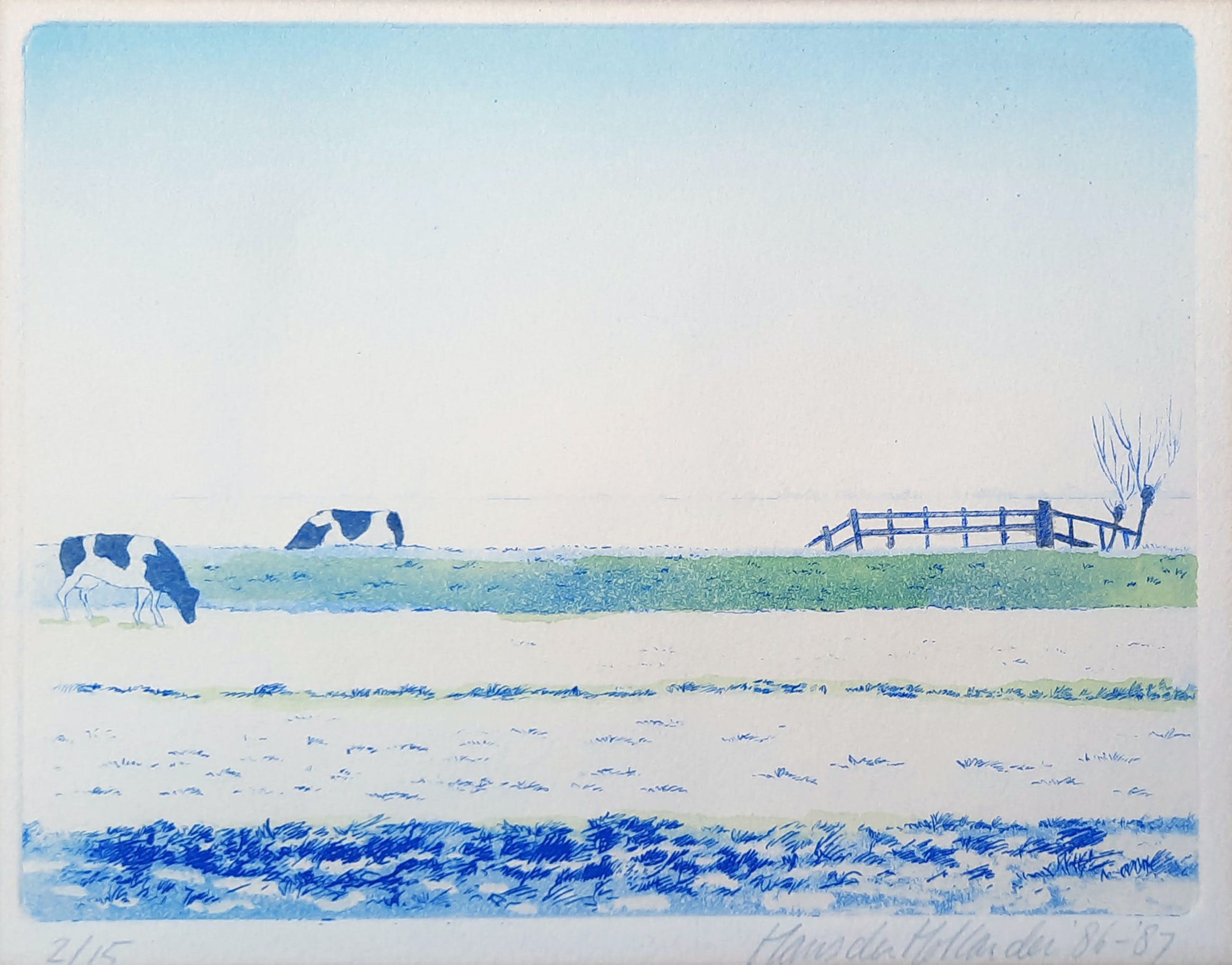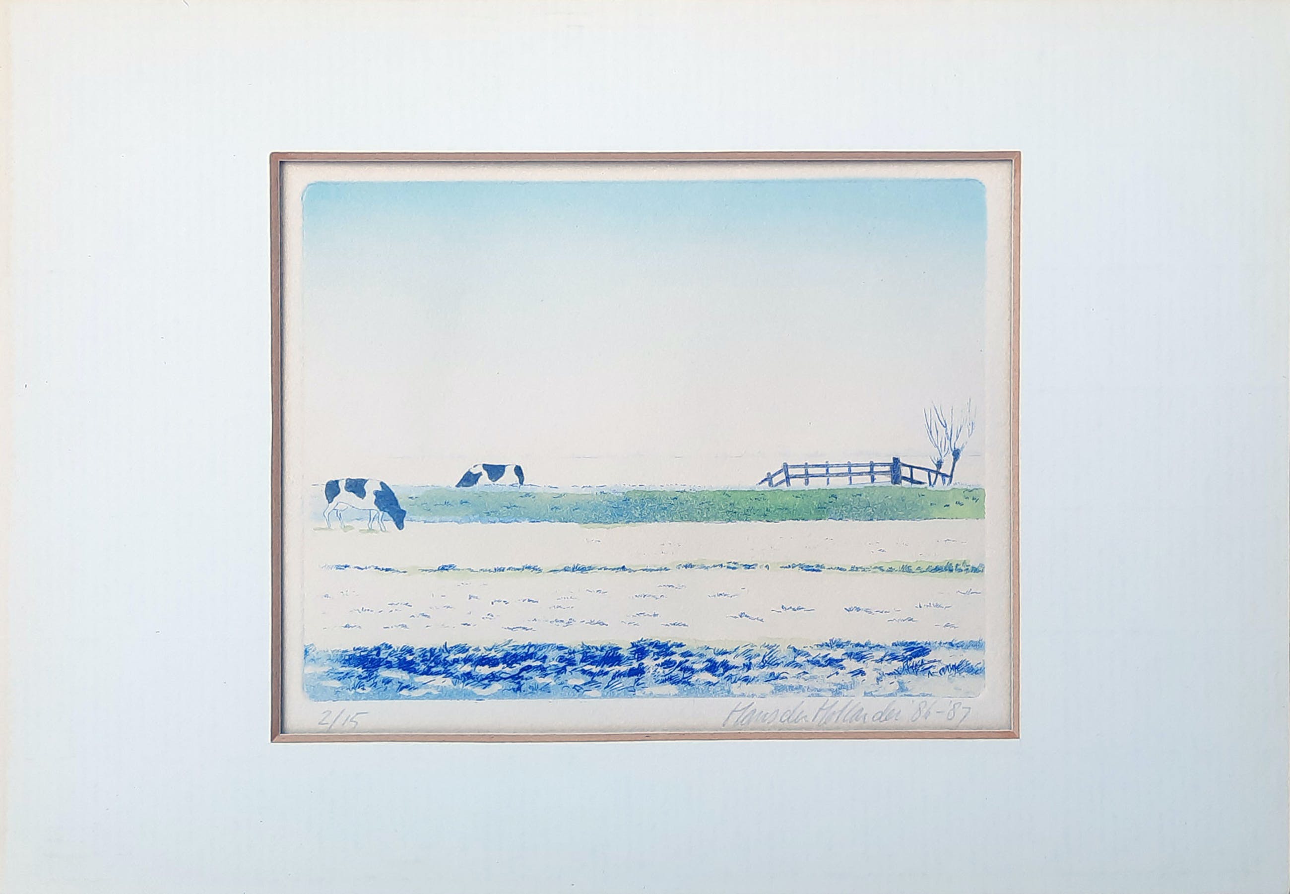 Serene kleurenets met koeien in de wei van Hans den Hollander. Komt in een goudkleurig aluminium lijstje. Wordt verzekerd verzonden.