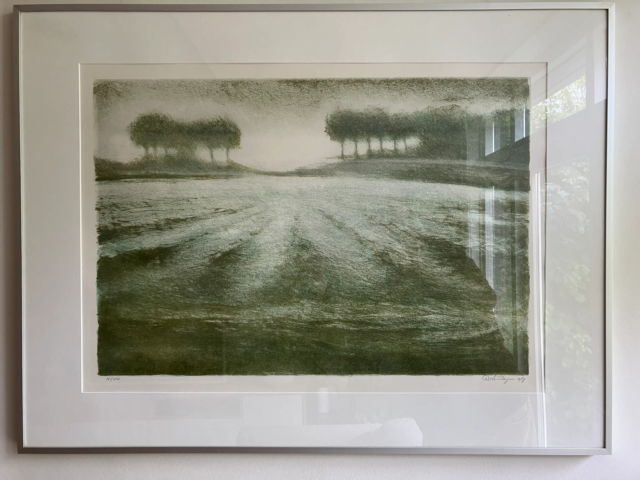 Zeefdruk met landschap dat doet denken aan Zeeuwse of Zuid-Hollandse eilanden