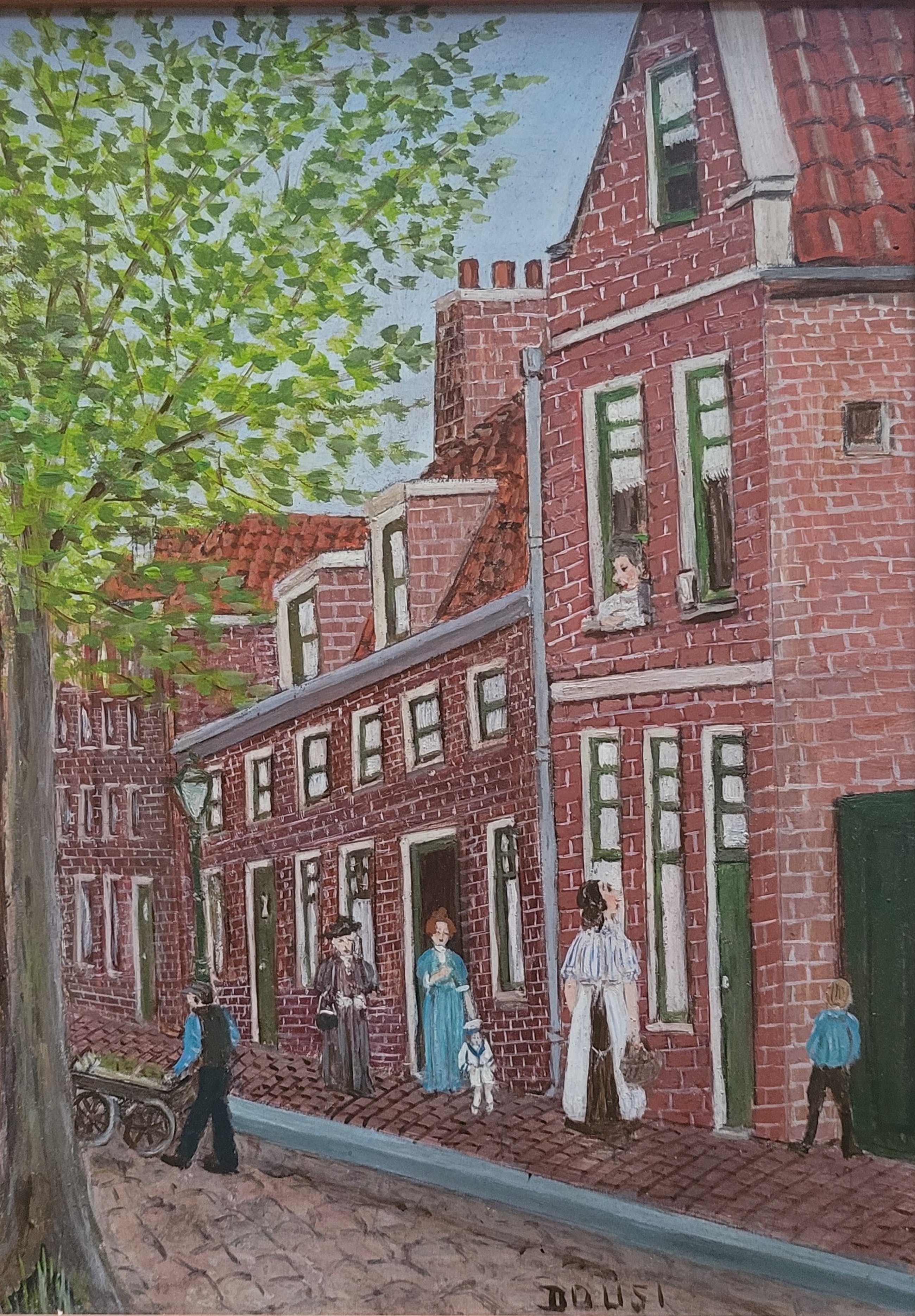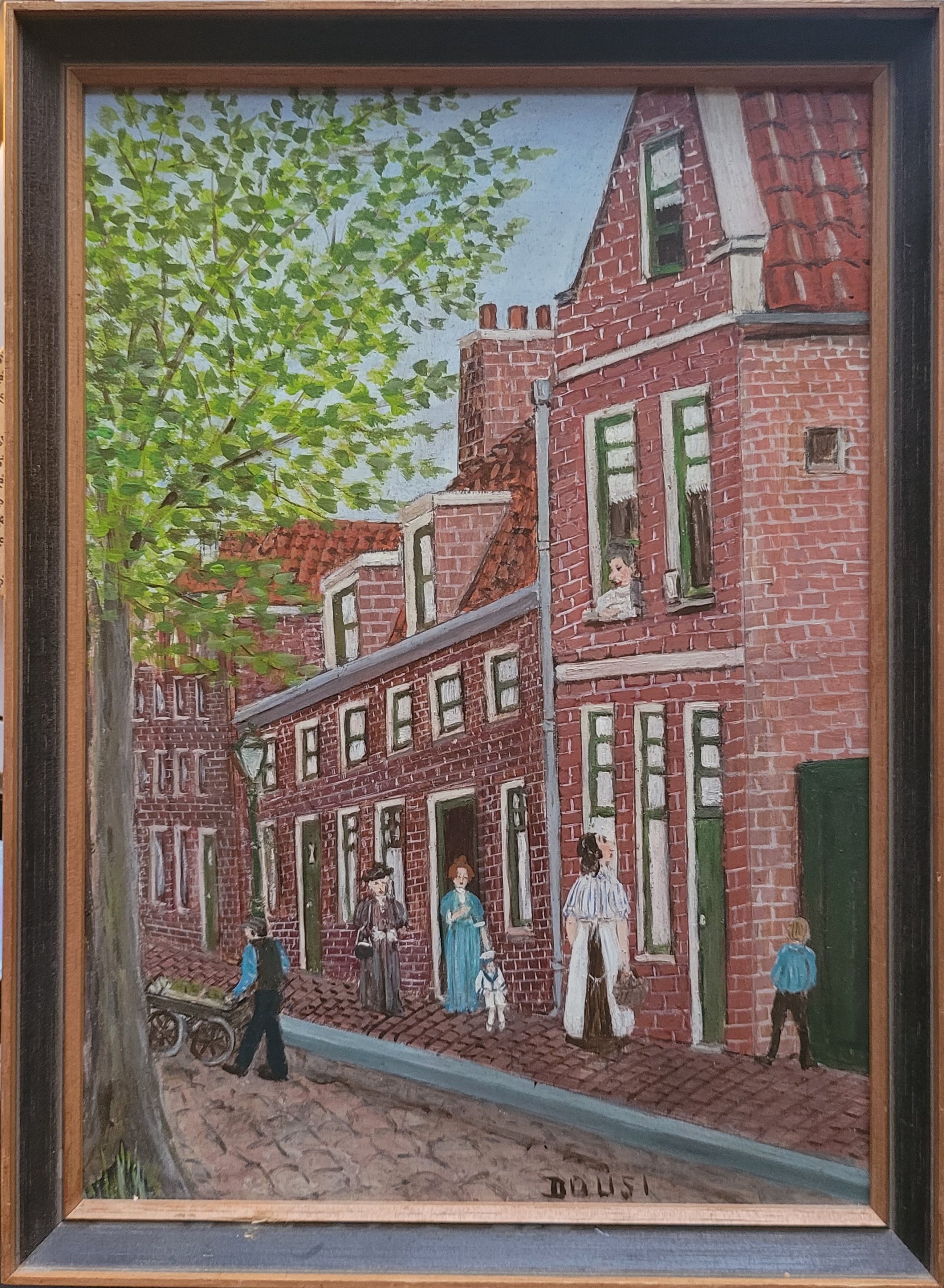 Hans Dousi (1917) werd geboren in Amsterdam en was huisvrouw. Rond 1963 begon ze met schilderen en vanaf 1975 volgde ze cursussen bij Atelier Buri te Amsterdam. Ze exposeerde ook regelmatig in Galerie Buri. In 1983 won ze de eerste prijs met haar schilderij van de Dam in een wedstrijd voor amateurschilders, uitgeschreven door Het Parool. Het kleinood wat hier wordt aangeboden, een stadstafereel uit vroegere tijden, met man die kar duwt, ouderwets geklede dames, kind in matrozenpak en jonge wildplasser, komt uit een privécollectie naieven, primitieven en zondagsschilders. Nadere informatie zal met plezier verschaft worden aan de volgende eigenaar.