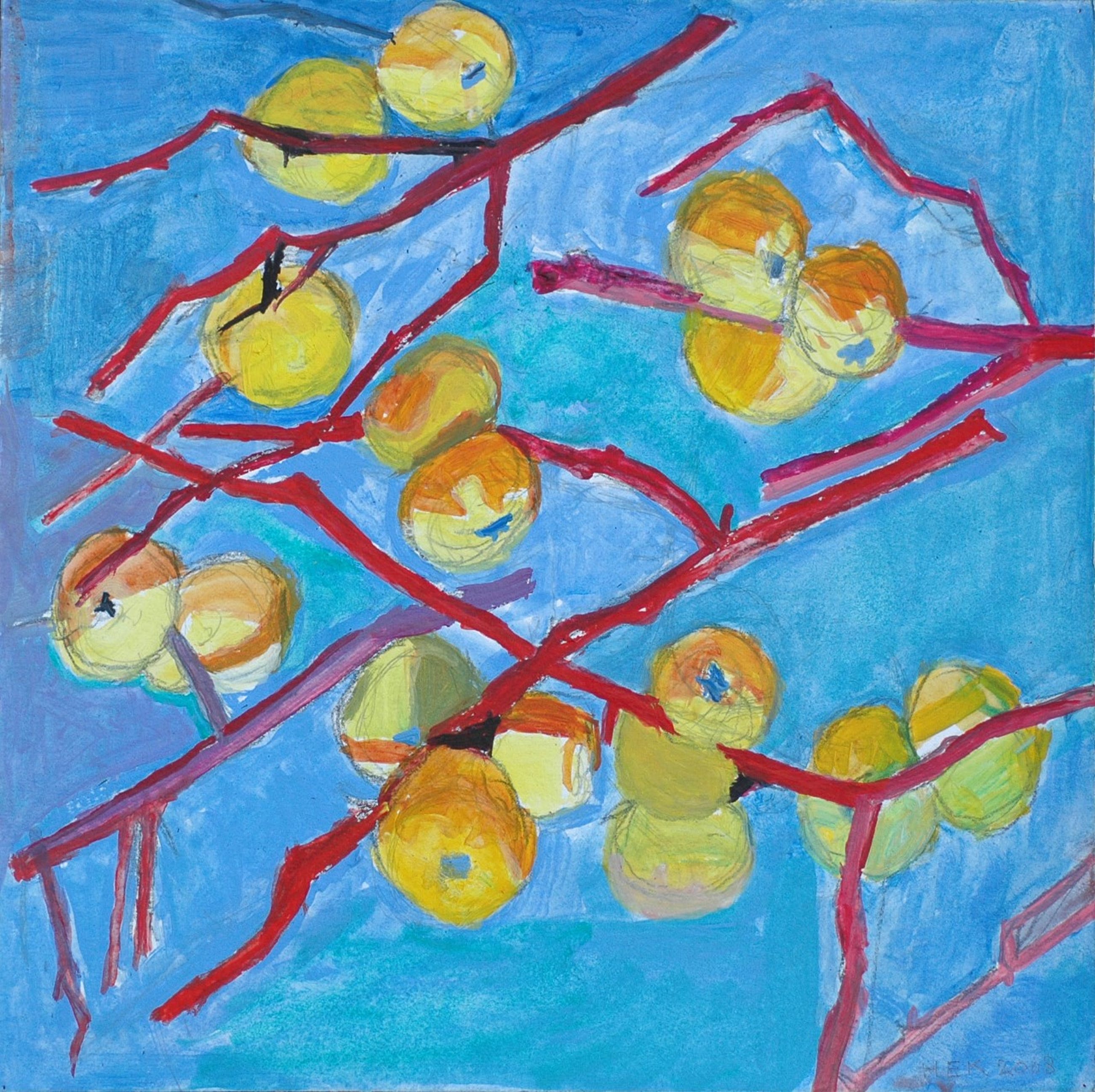 titel: bosappeltjes techniek: in potlood opgezette penseeltekening (acrylverf) afmetingen: 30 x 30 cm. (beeld en bladmaat) r.o. gesigneerd: HEK 2008 http://www.hansebelingkoningklooit.today