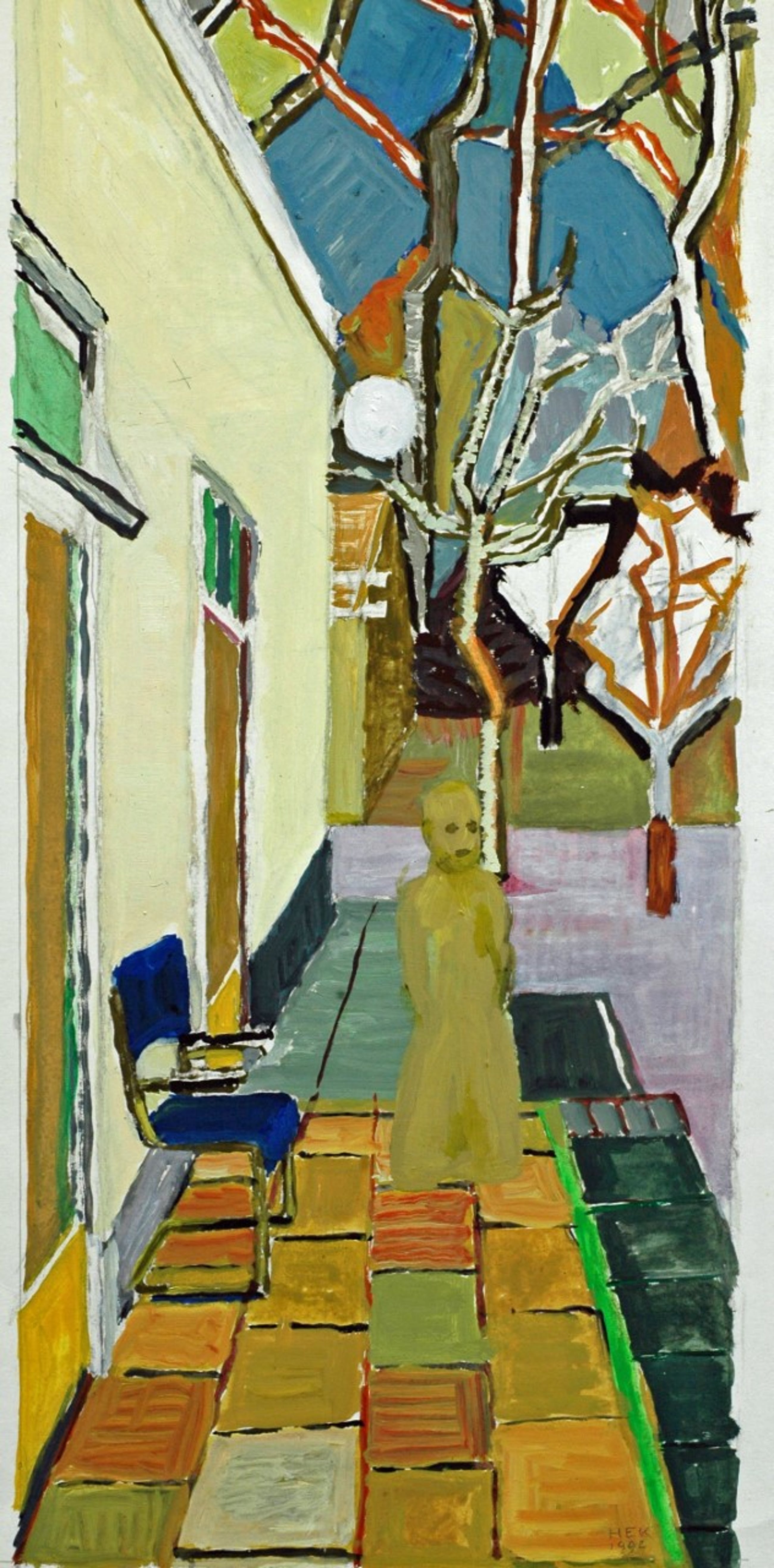 Titel: De vreemde gast. Techniek: Gouache (acrylverf op papier). Afmetingen: 64 x 30 cm. R.o. gesigneerd: HEK 1992 www.hansebelingkoningklooit.today