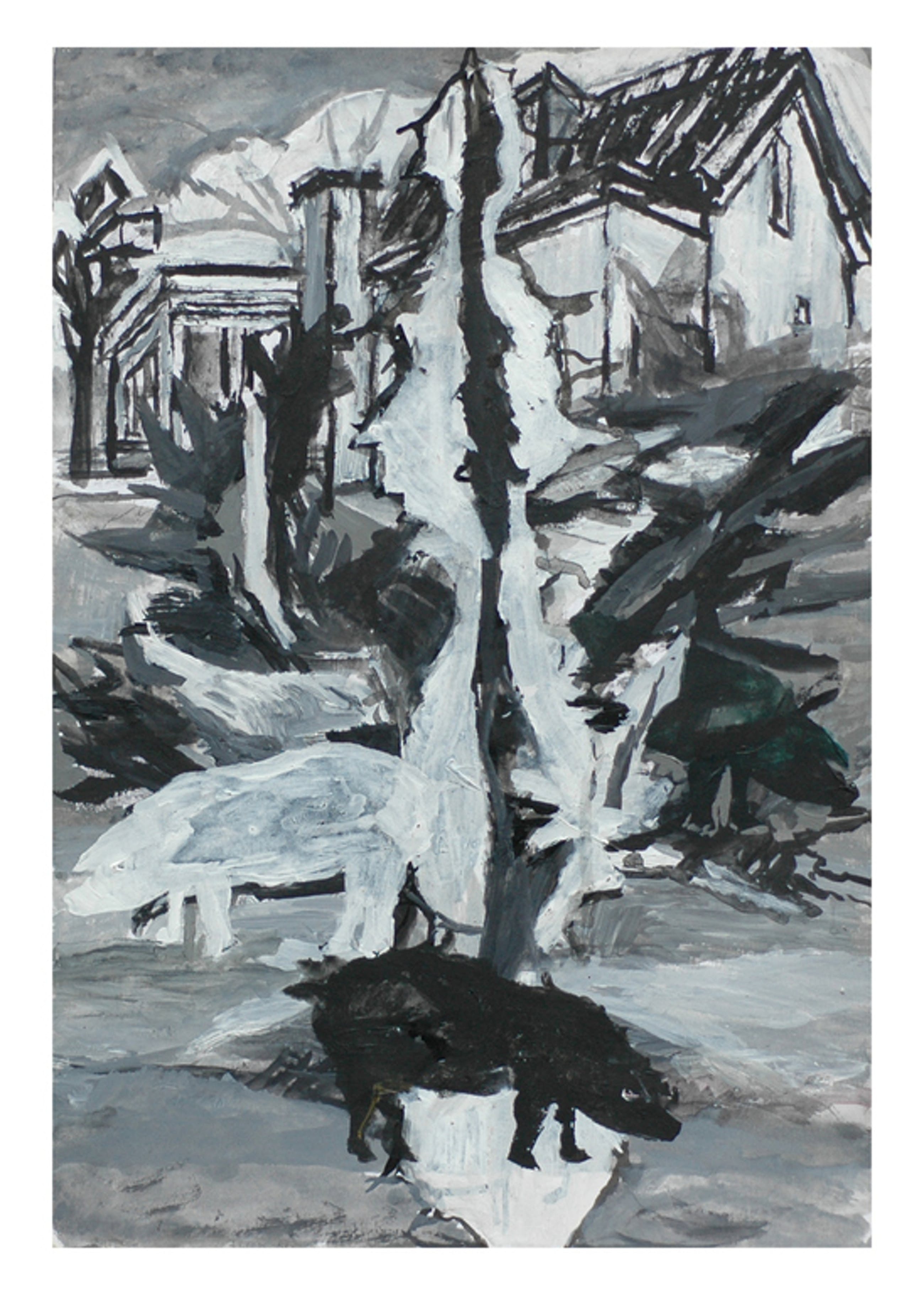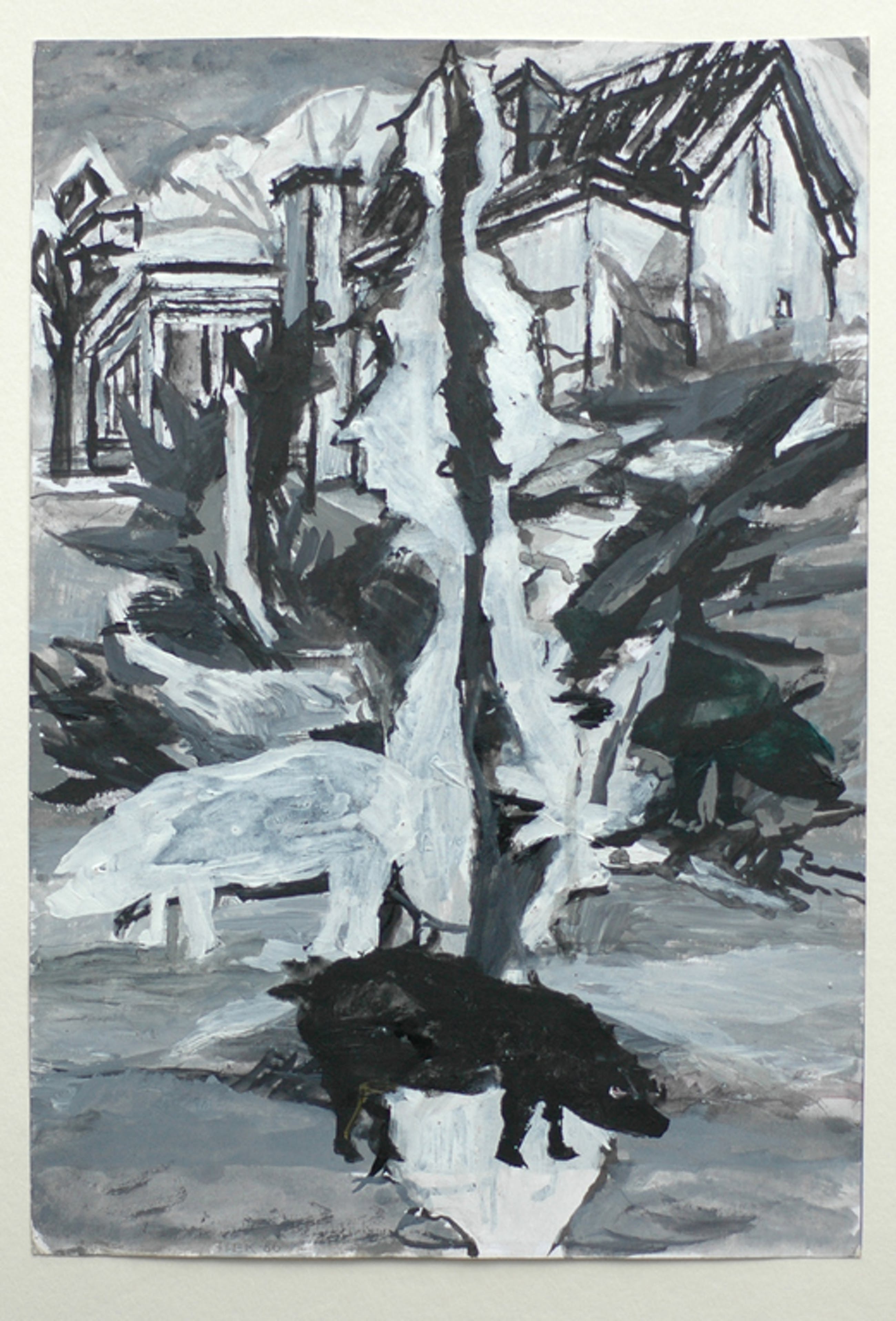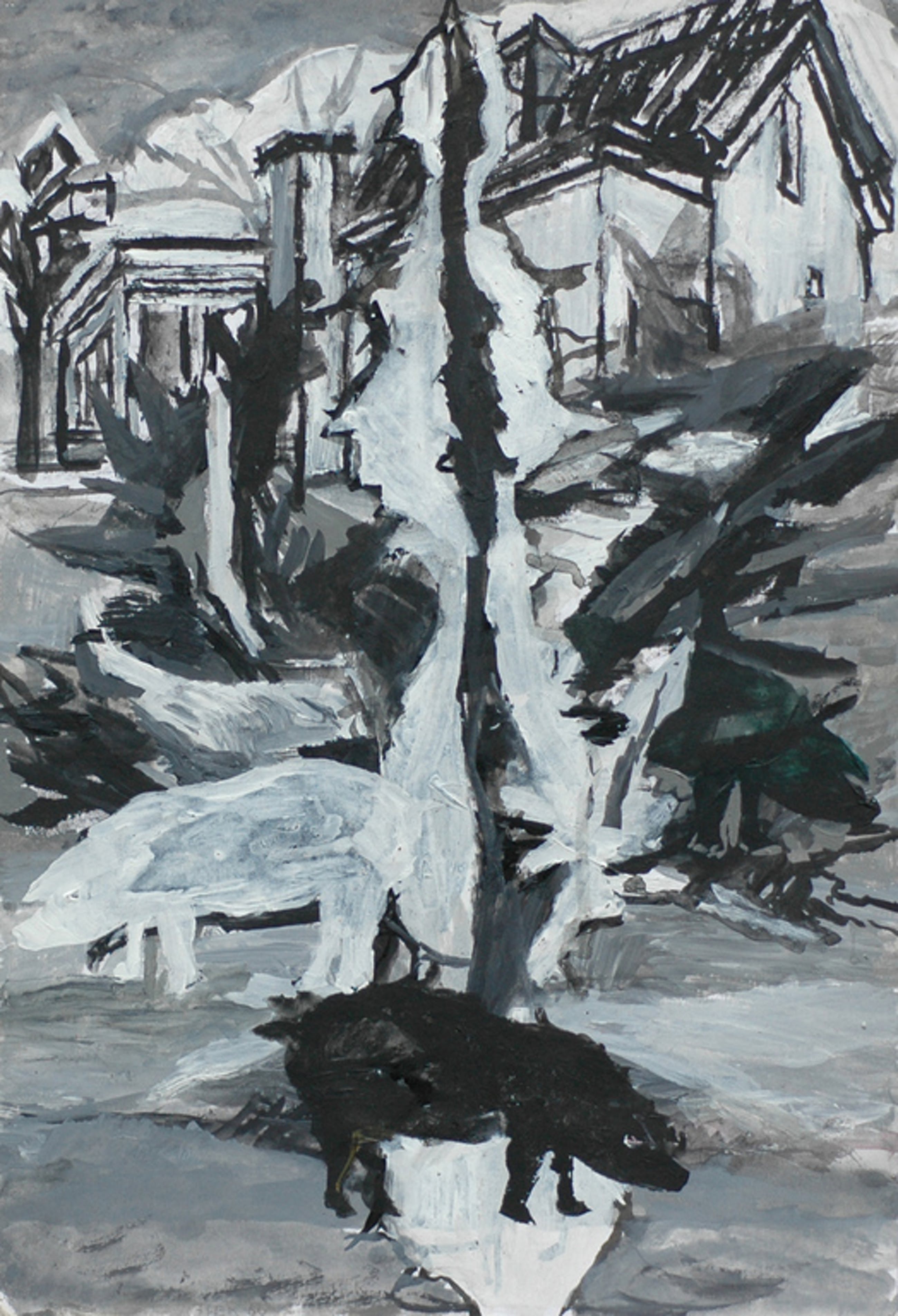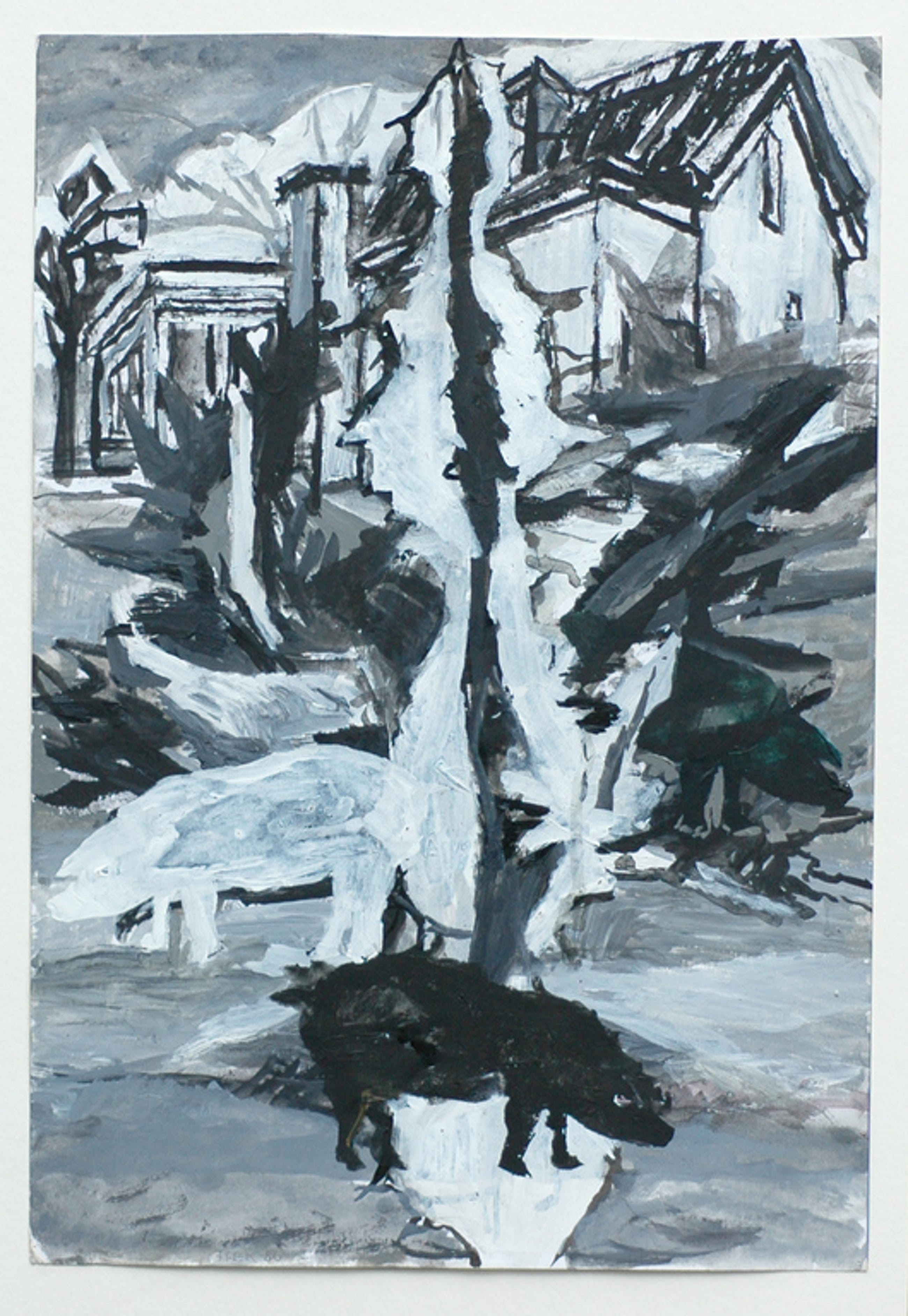Penseeltekening op papier in zwart/witte acrylverf.
