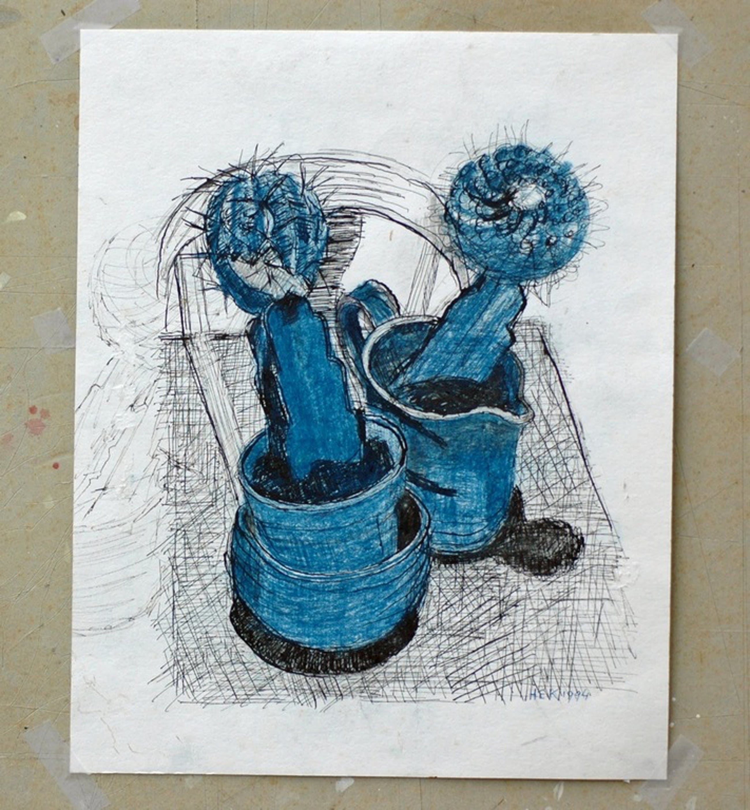Pentekening op stevig papier, ingewerkt met blauw vetkrijt.
