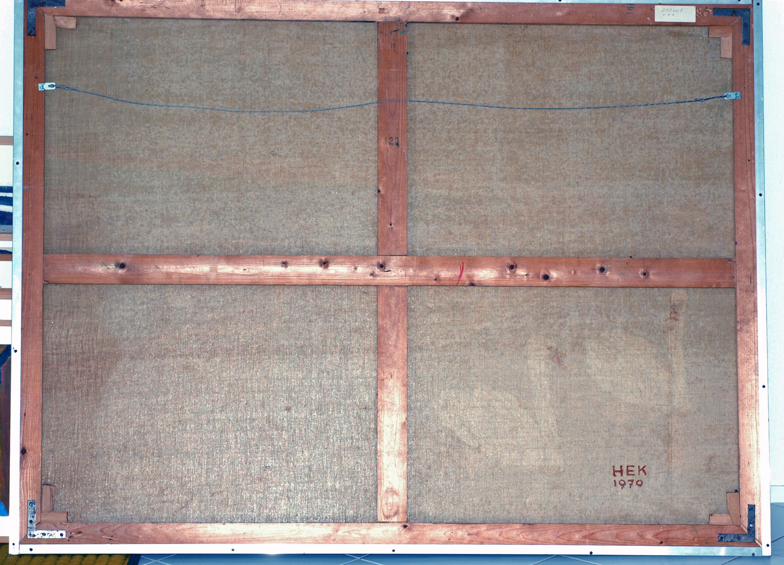 In verf gesigneerd (HEK) en gedateerd (1970) rugkant van het doek. De omlijsting (metalen strip) is aan vervanging toe.