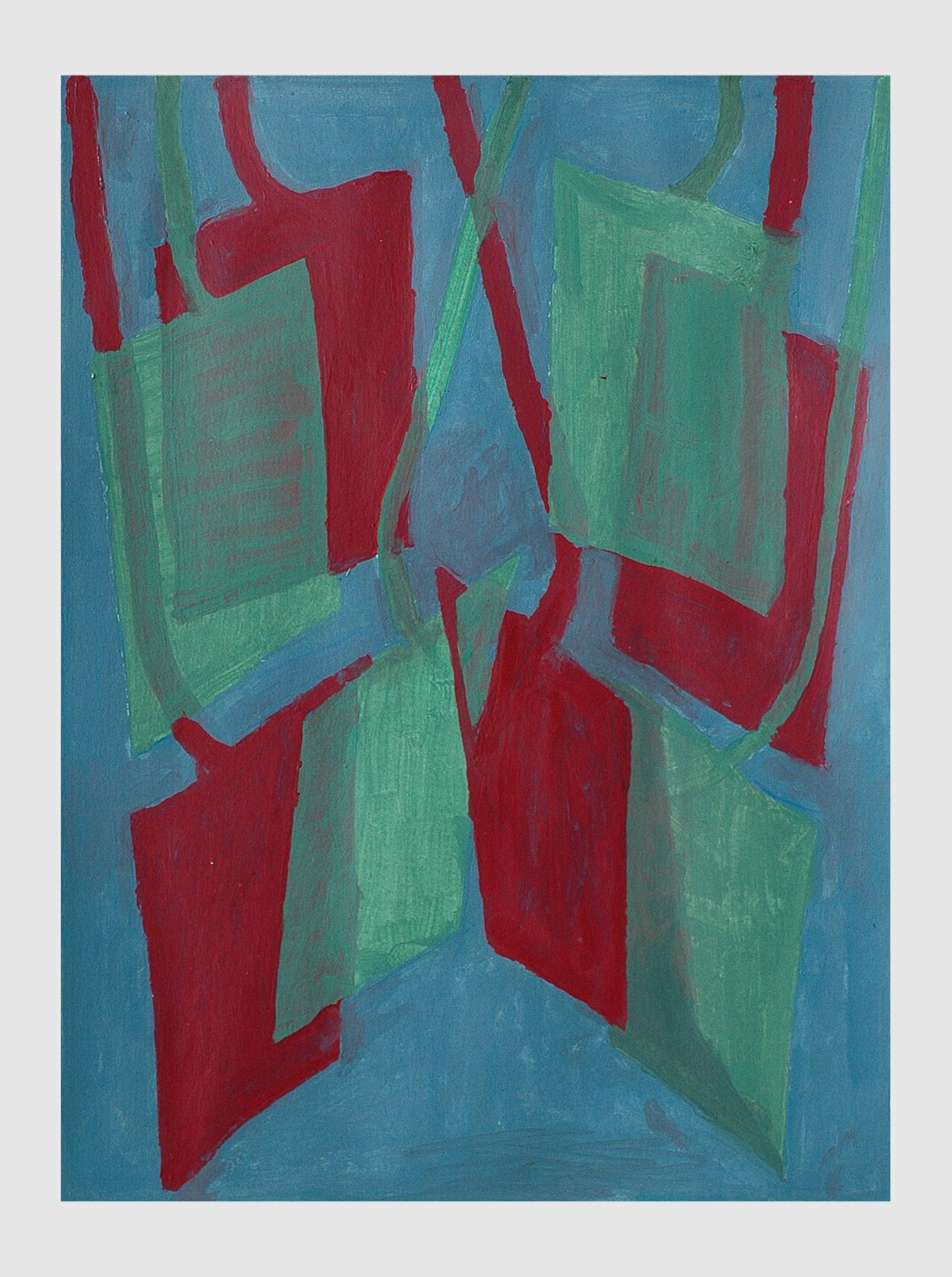 titel: Spades in groen en rood techniek: Schildering in acrylverf op dik papier afmetingen: beeld: 58 x 44 cm. De schildering is losjes (afneembaar) gemonteerd op karton (68 x 56 cm.) potlood gesigneerd r.o.: HEK 2015