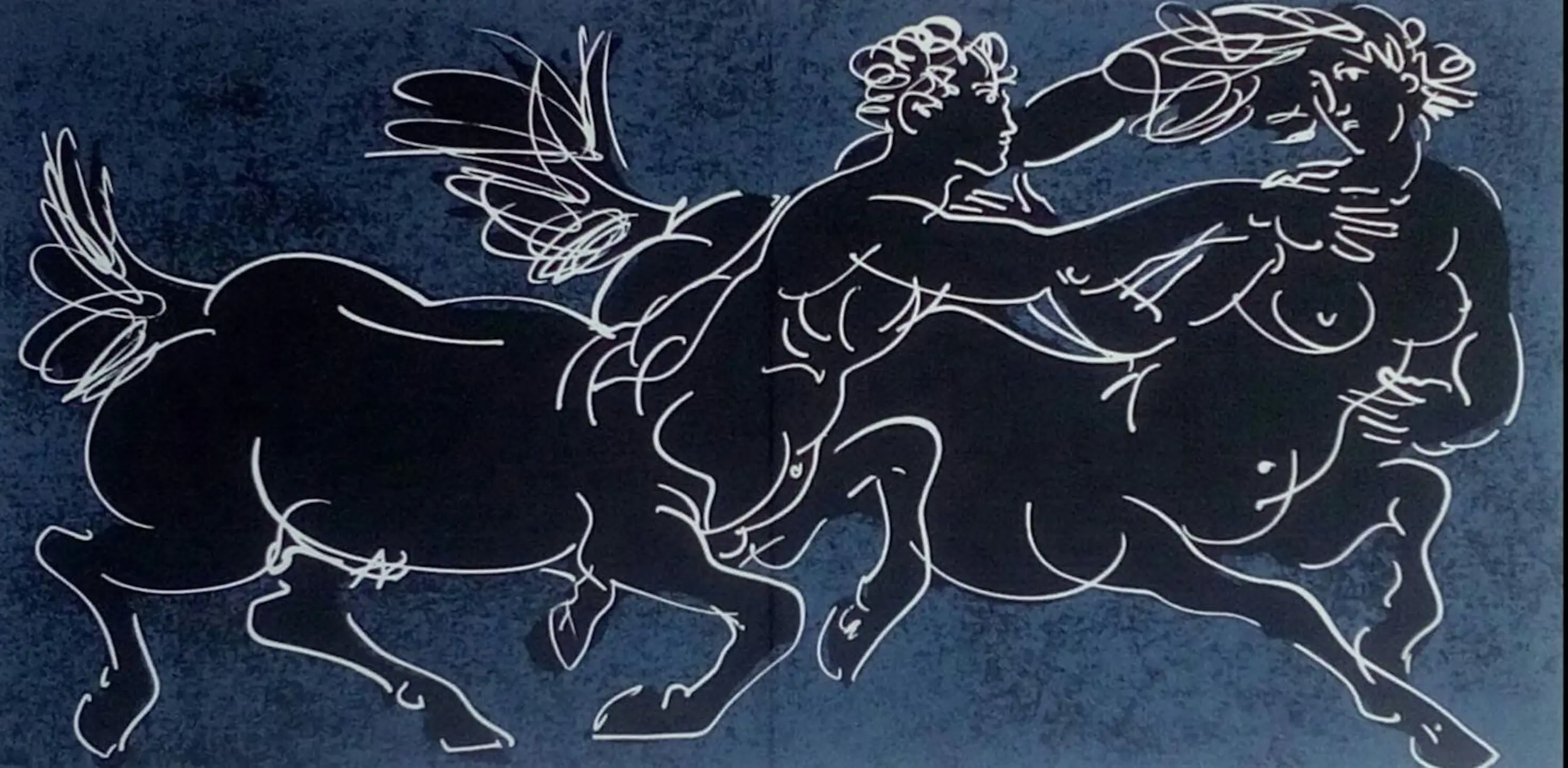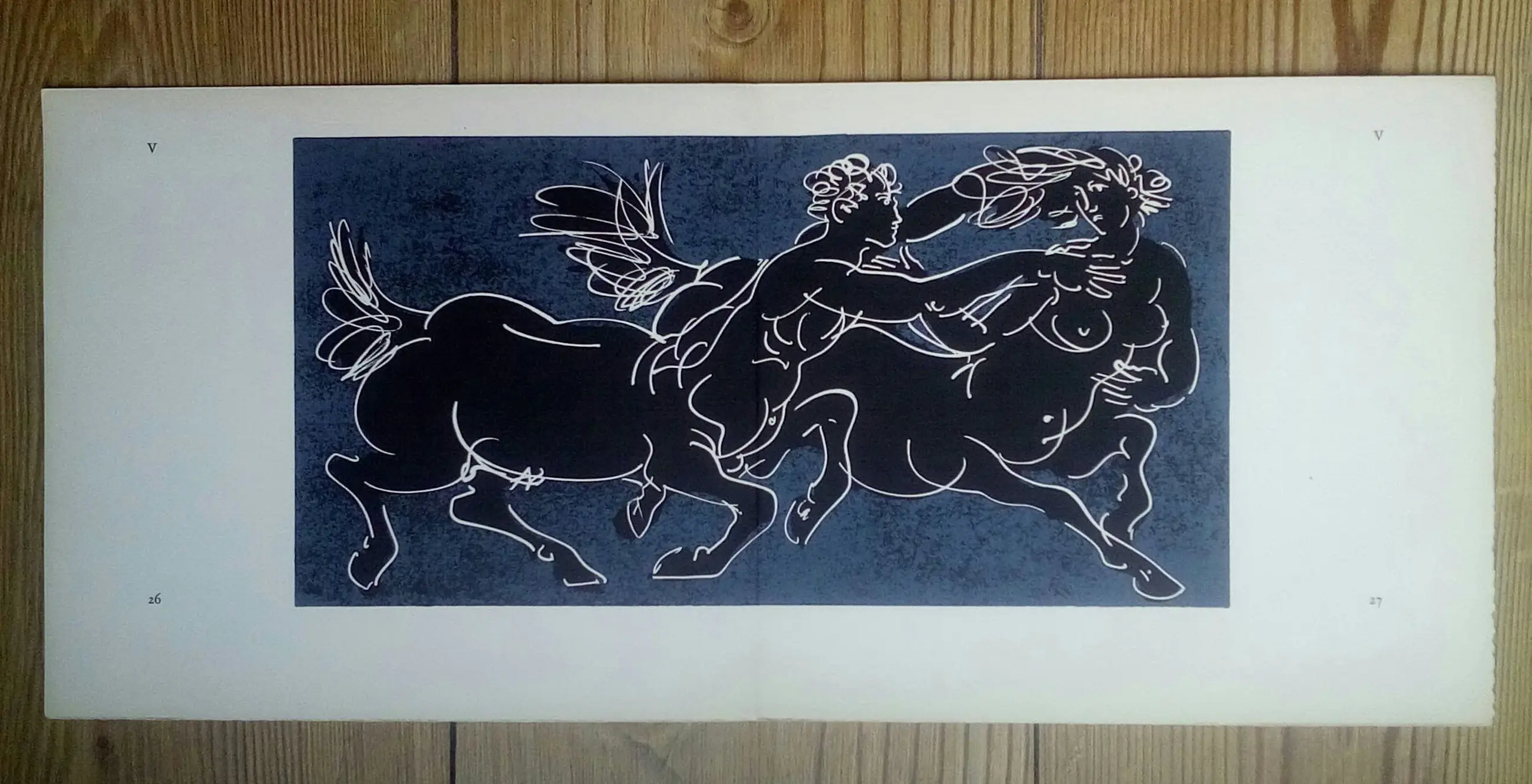 Voor de laatste keer hier aangeboden. Lithografie van de in 2015 op 106-jarige leeftijd overleden vermaarde Zwitserse kunstenaar. Het werk komt uit de gelimiteerde box "Chevaux" uit 1966. Een bloemlezing uit klassiekers van de wereldliteratuur, met passages waarin paarden figureren. Hans Erni maakte hierbij de litho's. Oplage 450 ex., gedrukt bij Emil Matthieu in Zurich op 200 grs Rives geschept papier. Losbladig, formaat 48 x 21 cm, gevouwen tot 24 x 21 cm als uitgegeven. Beeldmaat 31 x 15,5 cm. De tekst in het frans en de romeinse nummering en paginacijfers op voor- en achterzijde laten voldoende marge voor een nette inlijsting. Conditie: In goede staat, nooit ingelijst geweest.