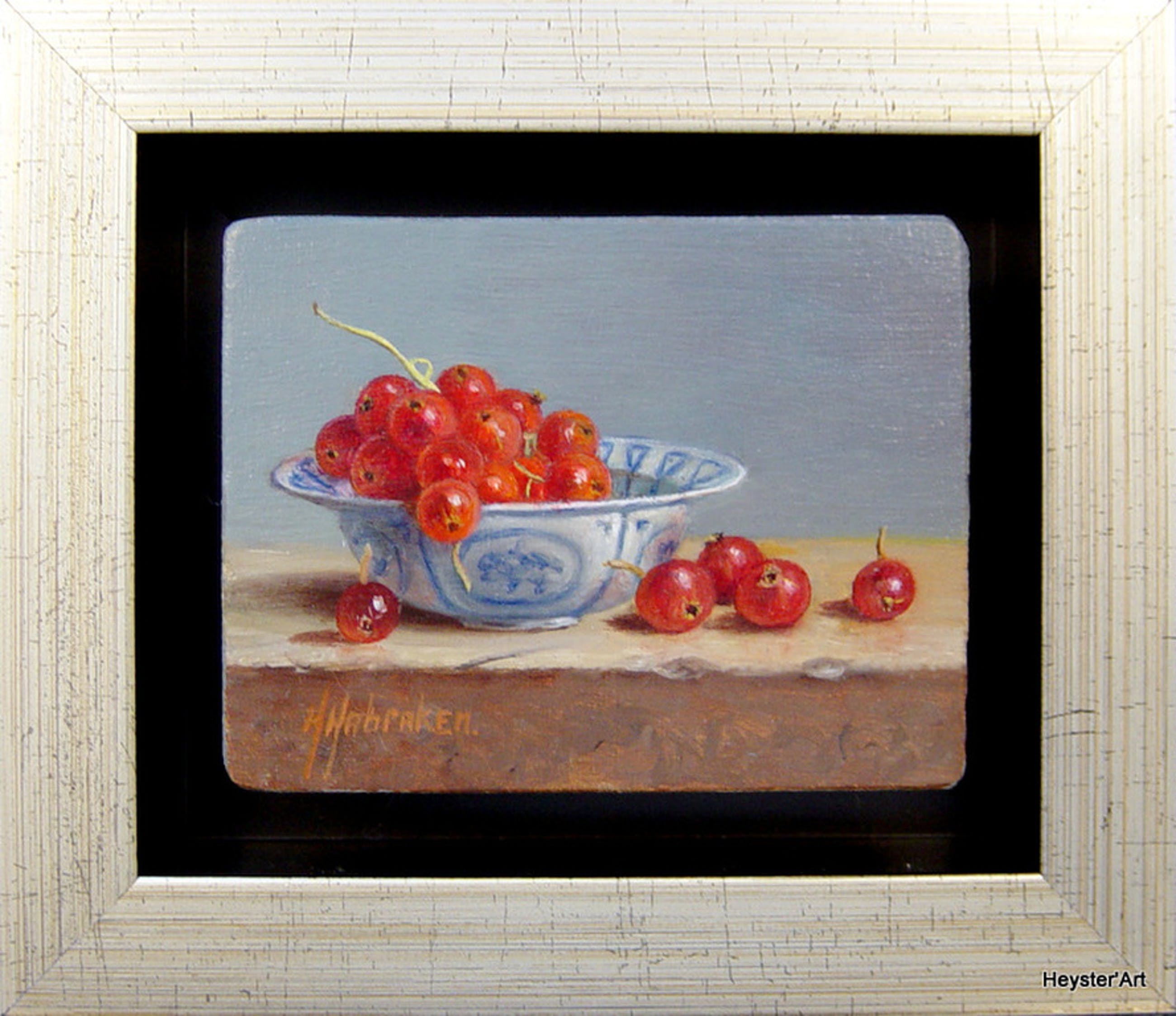 Deze kleine stillevens zijn zeer gewild, zowel door particulieren als door de kunsthandel. Formaat 14,5 x 12,5 cm. Het betreft een recent geschilderd schilderij. De inlijsting en het schilderij zijn puntgaaf.
