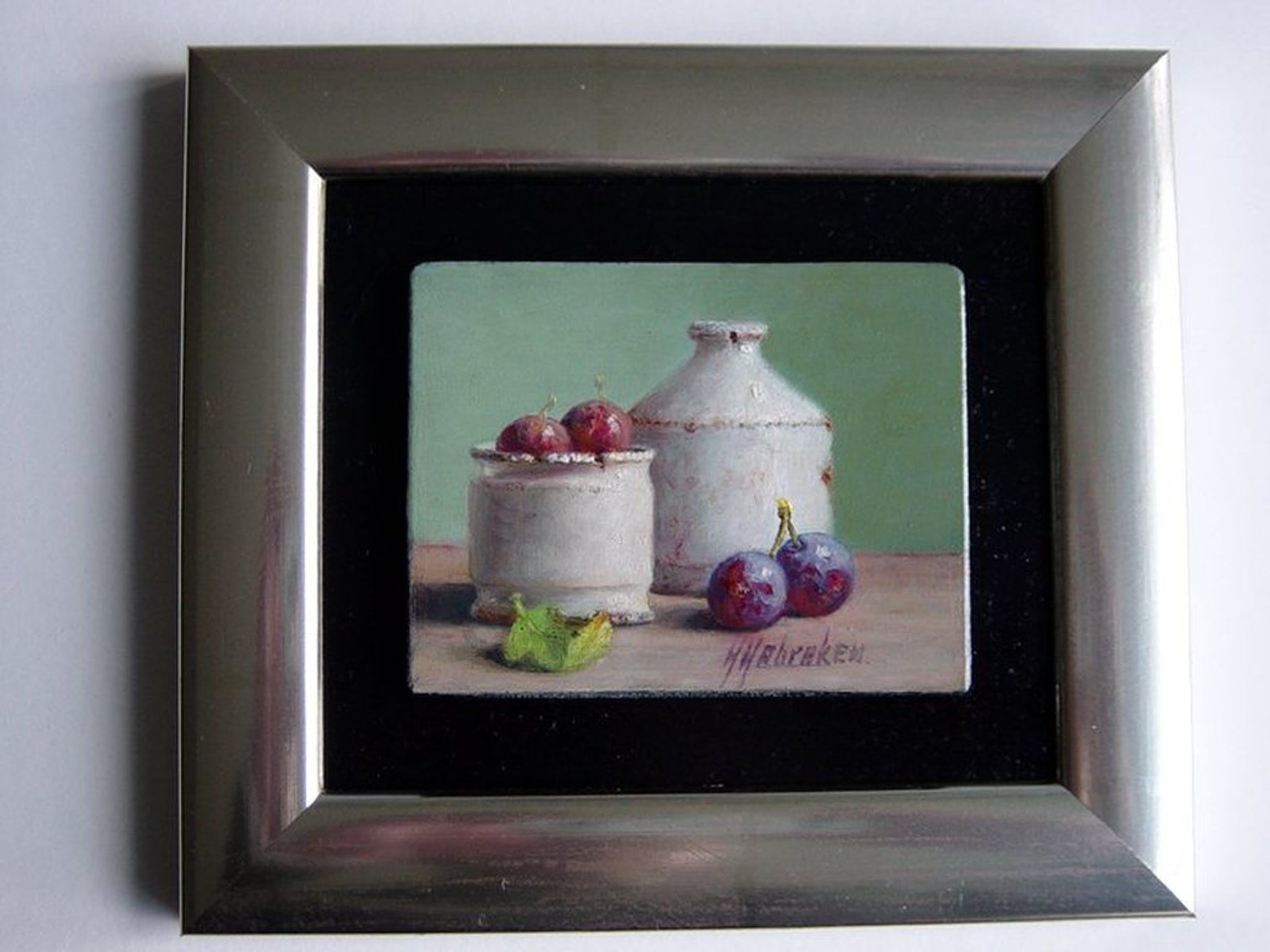 Perfect in olieverf geschilderd paneeltje met ingelijste maat 14,5 x 16,5 cm. Het geheel verkeert in nieuwstaat. De op de zilverkleurige lijst zichtbare vlekken zijn weerspiegelingen en zitten dus niet in de lijst.