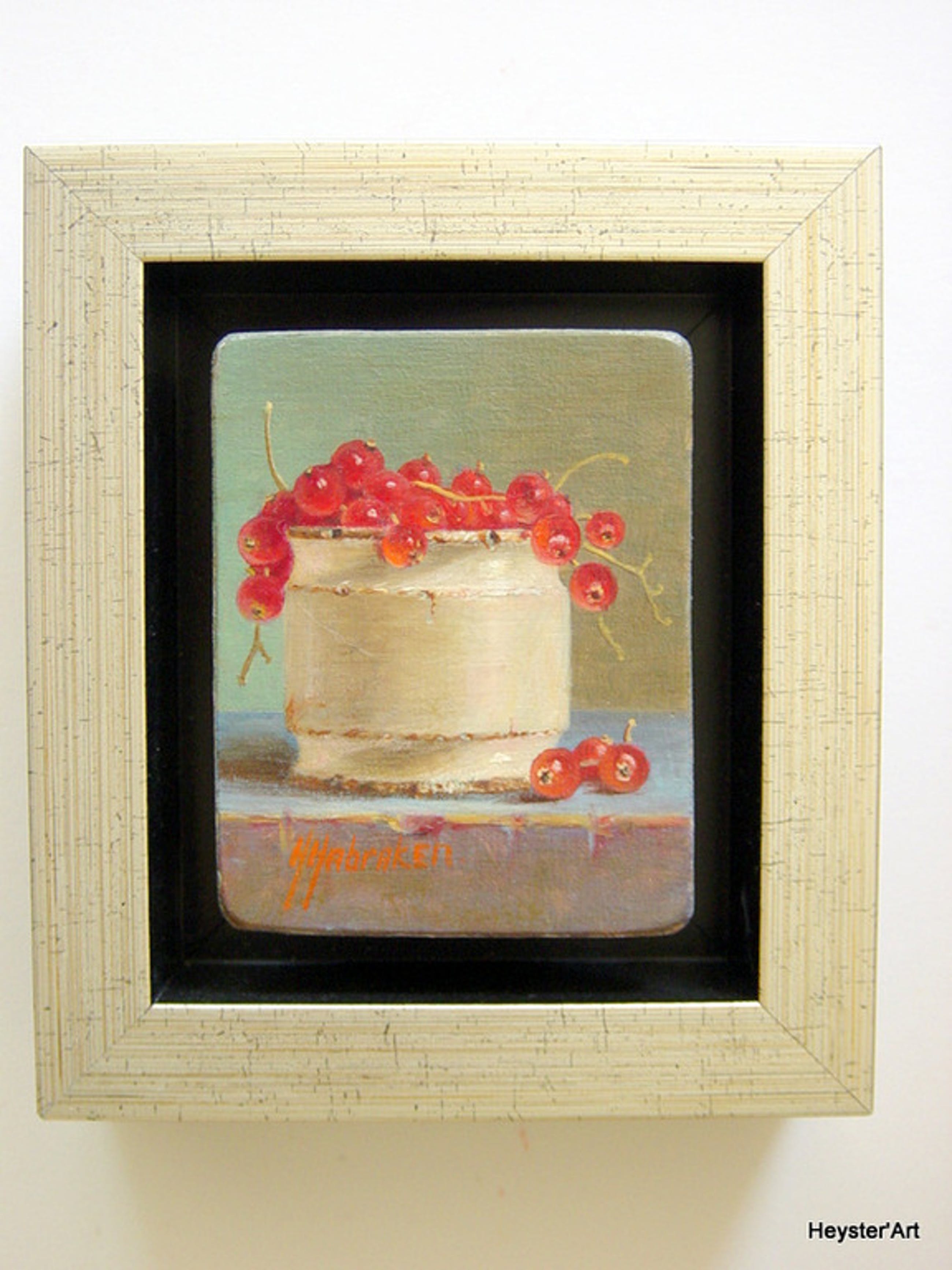 Deze kleine stillevens zijn zeer gewild, zowel door particulieren als door de kunsthandel. Formaat 14,5 x 12,5 cm. Het betreft een recent geschilderd schilderij. De inlijsting en het schilderij zijn puntgaaf.