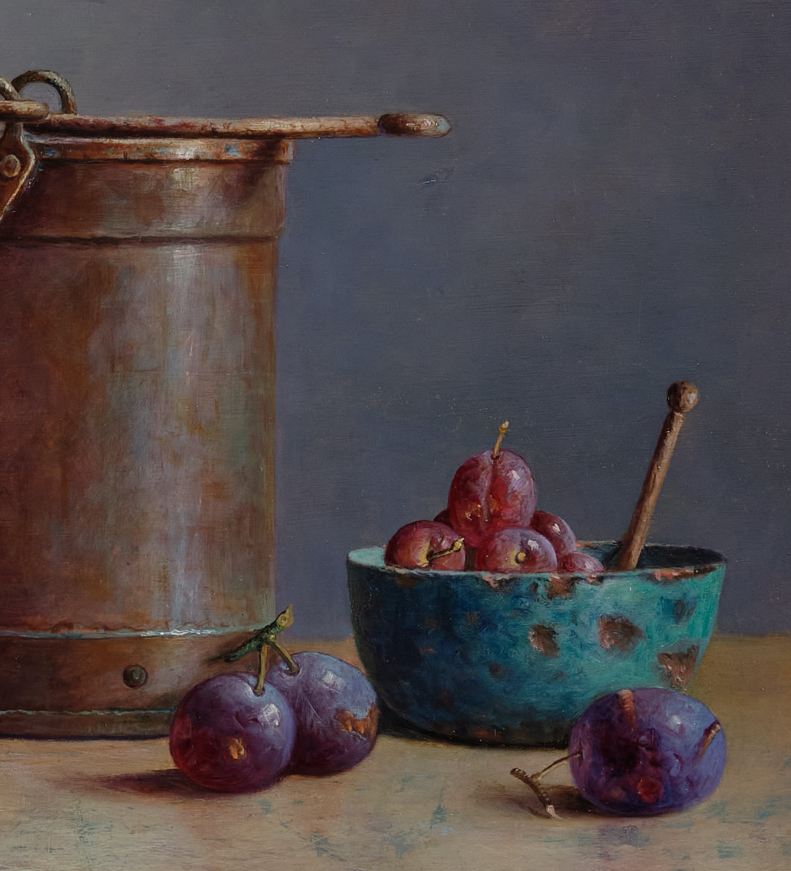 Hans Habraken - Oud keteltje en 2 schalen met pruimen. - Verkocht