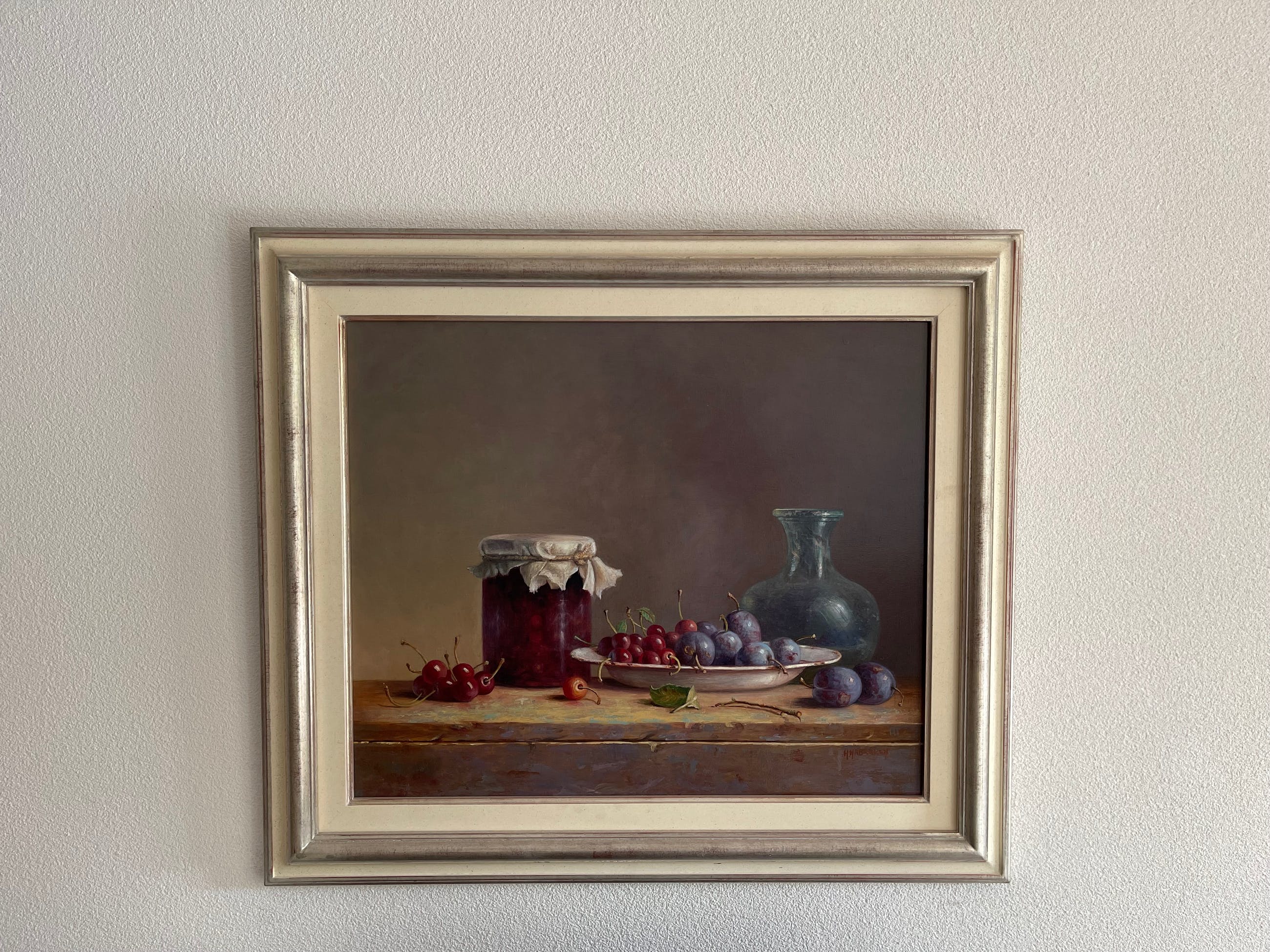 Prachtig stilleven, kersen en pruimen in een tinnen schaal/bord, blauwe vaas en kersenjampot op een schilderwerkbank geplaatst.