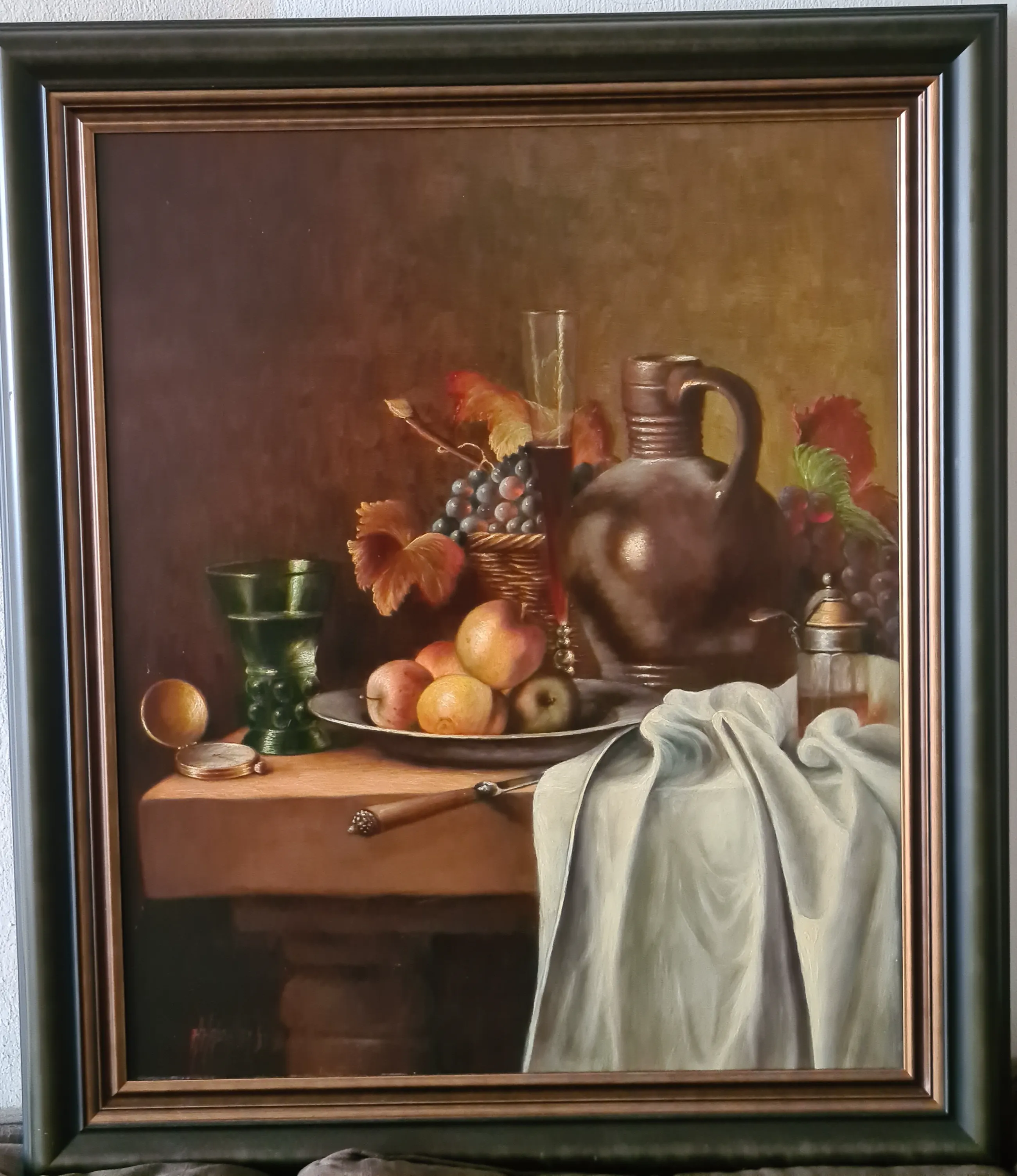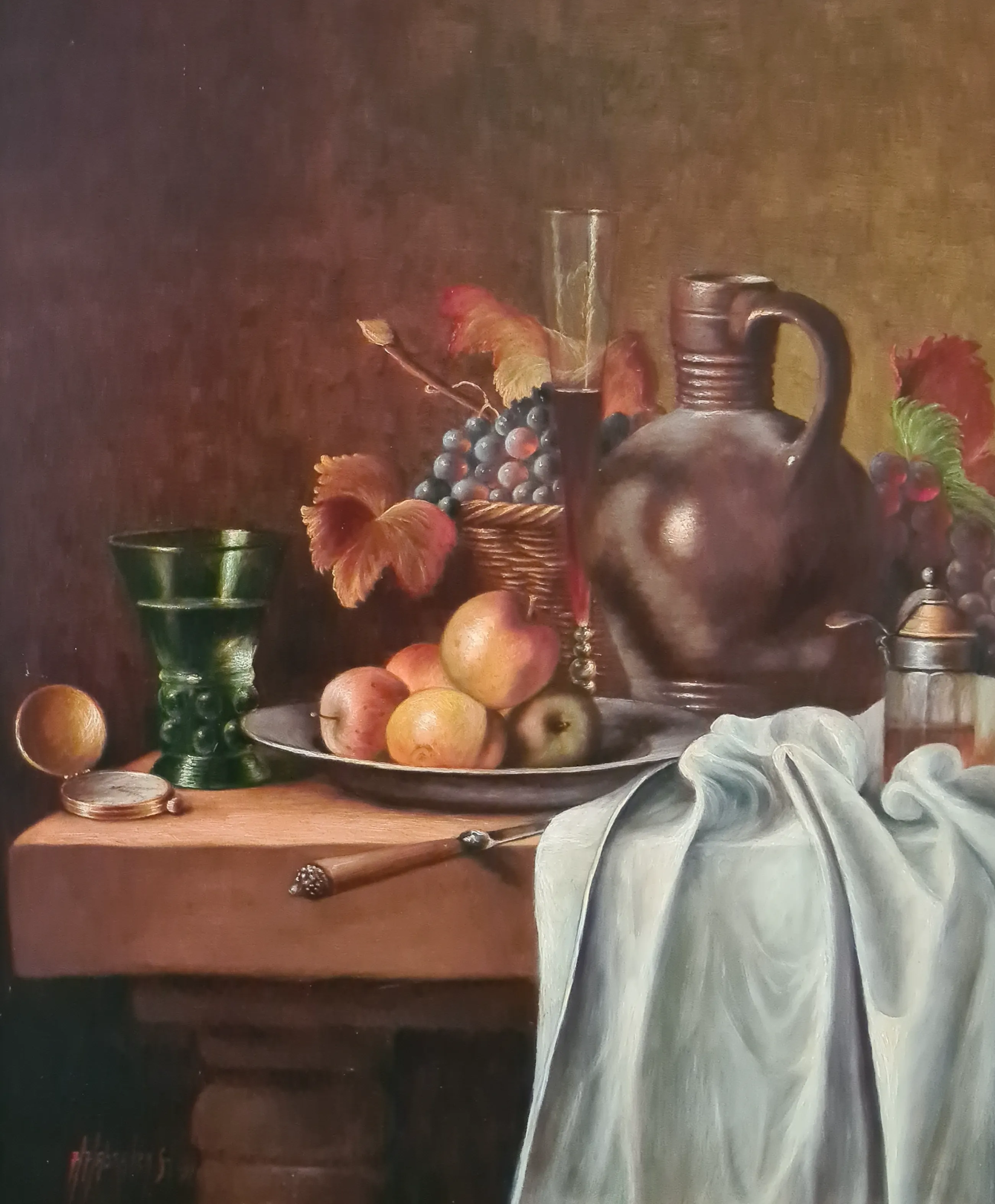Hans Habraken - Stilleven met aardewerken kruik, druiven en appels