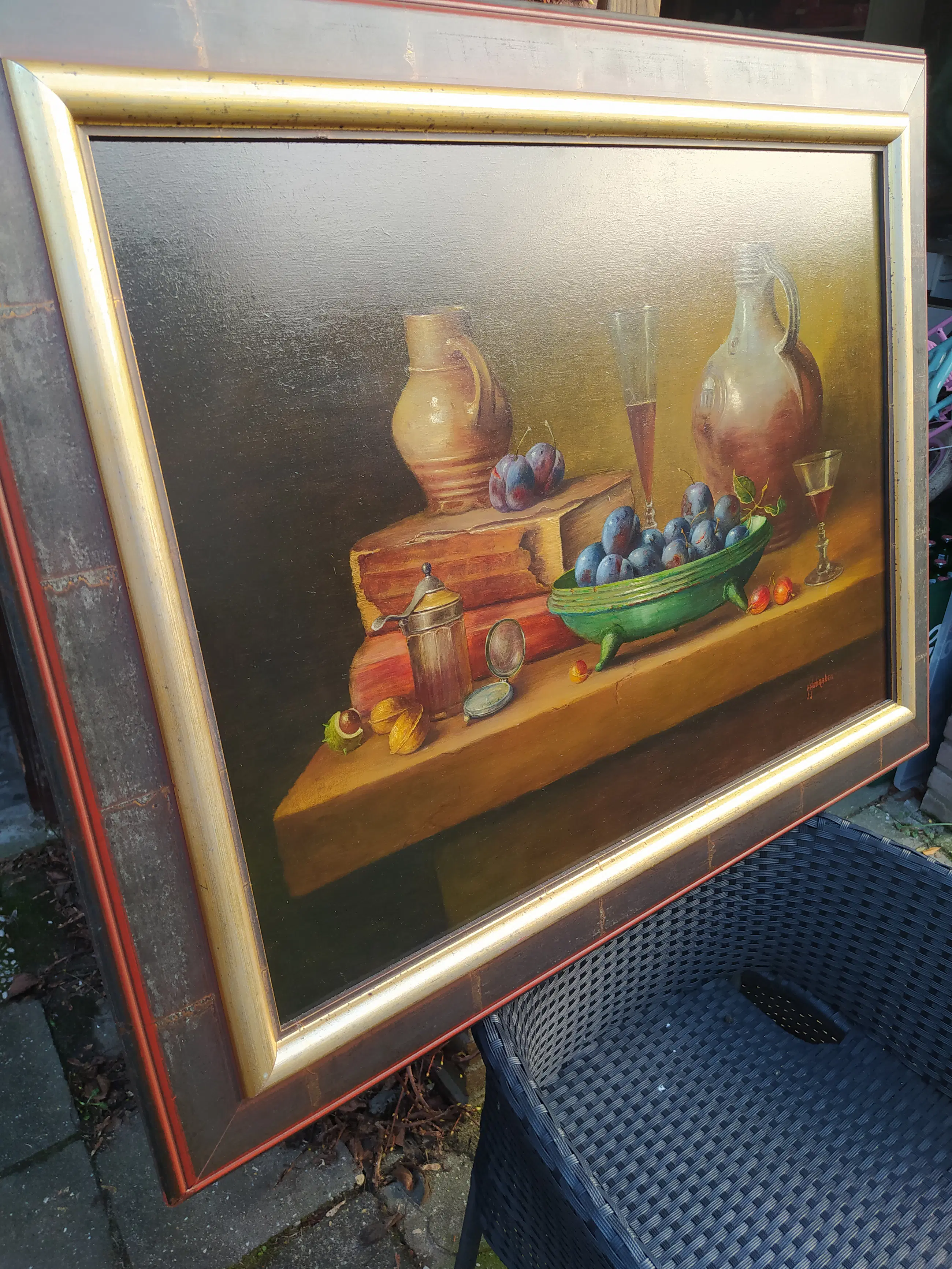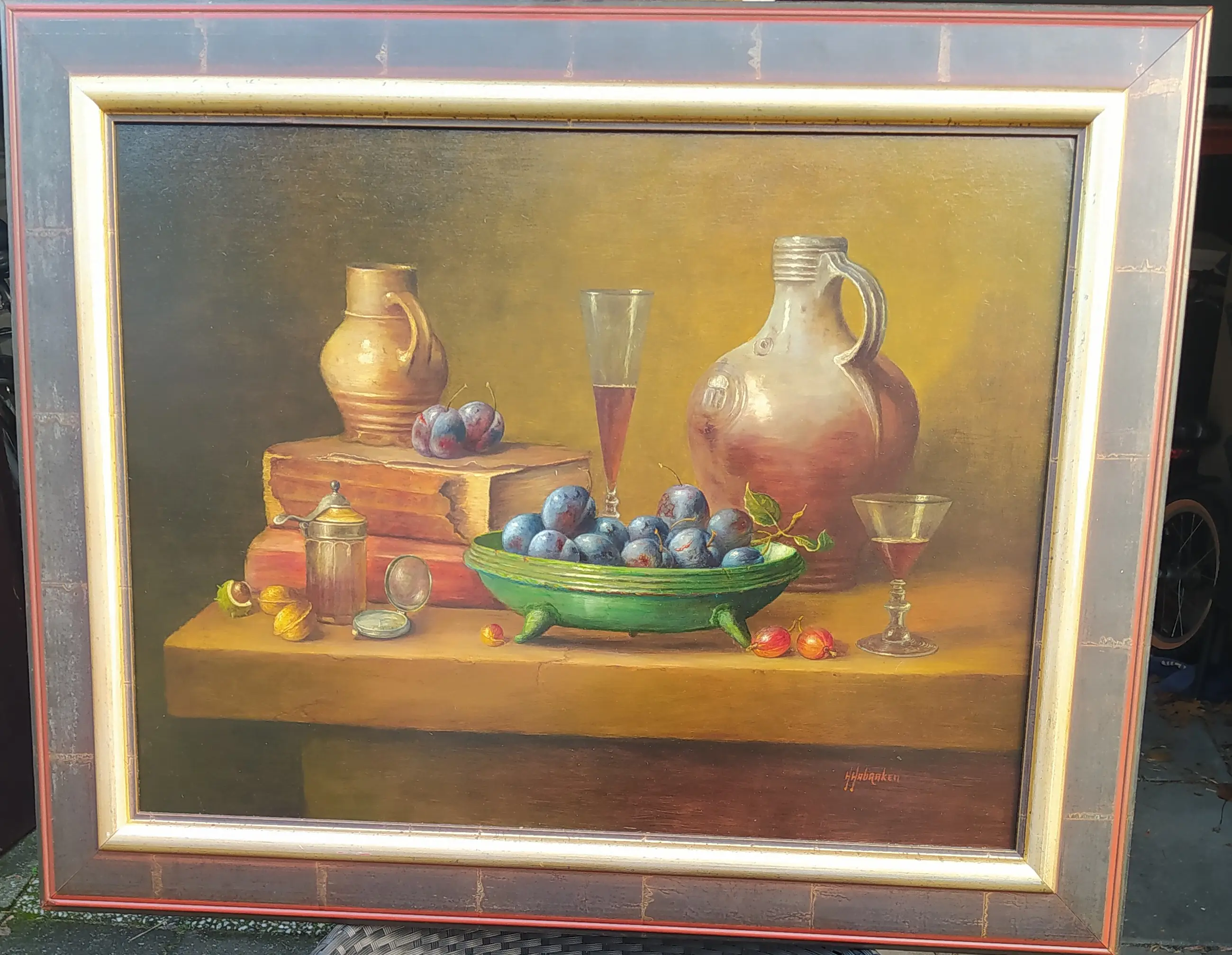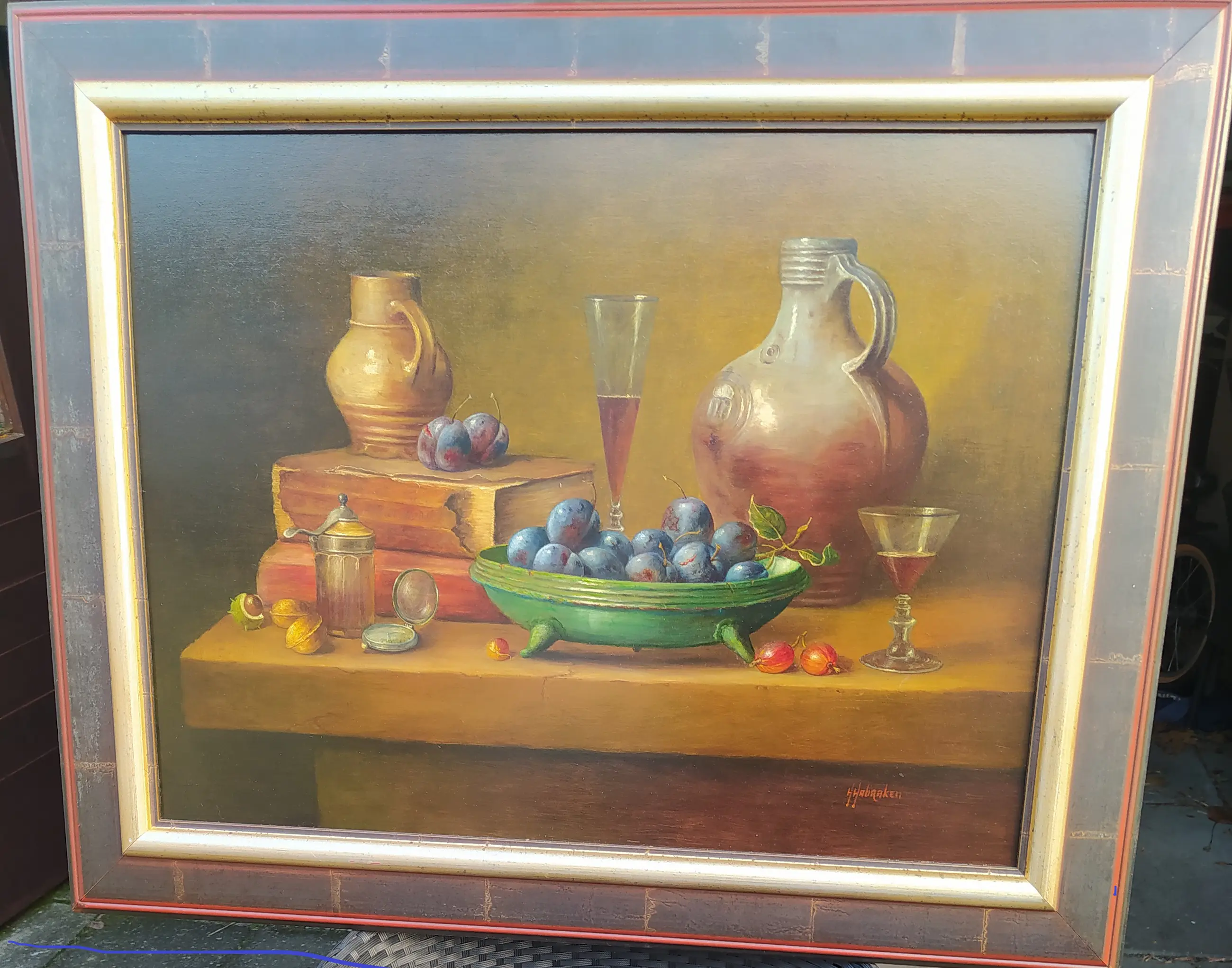 Stilleven van Hans Habraken, geboren 1946. Fruit en kruiken op tafel. Olieverf op linnen. Schilderij is voorzien van een mooie houten lijst. (kunsthandel en lijstenmakerij Liberty, Rotterdam). Verzending via regulier post niet mogelijk.