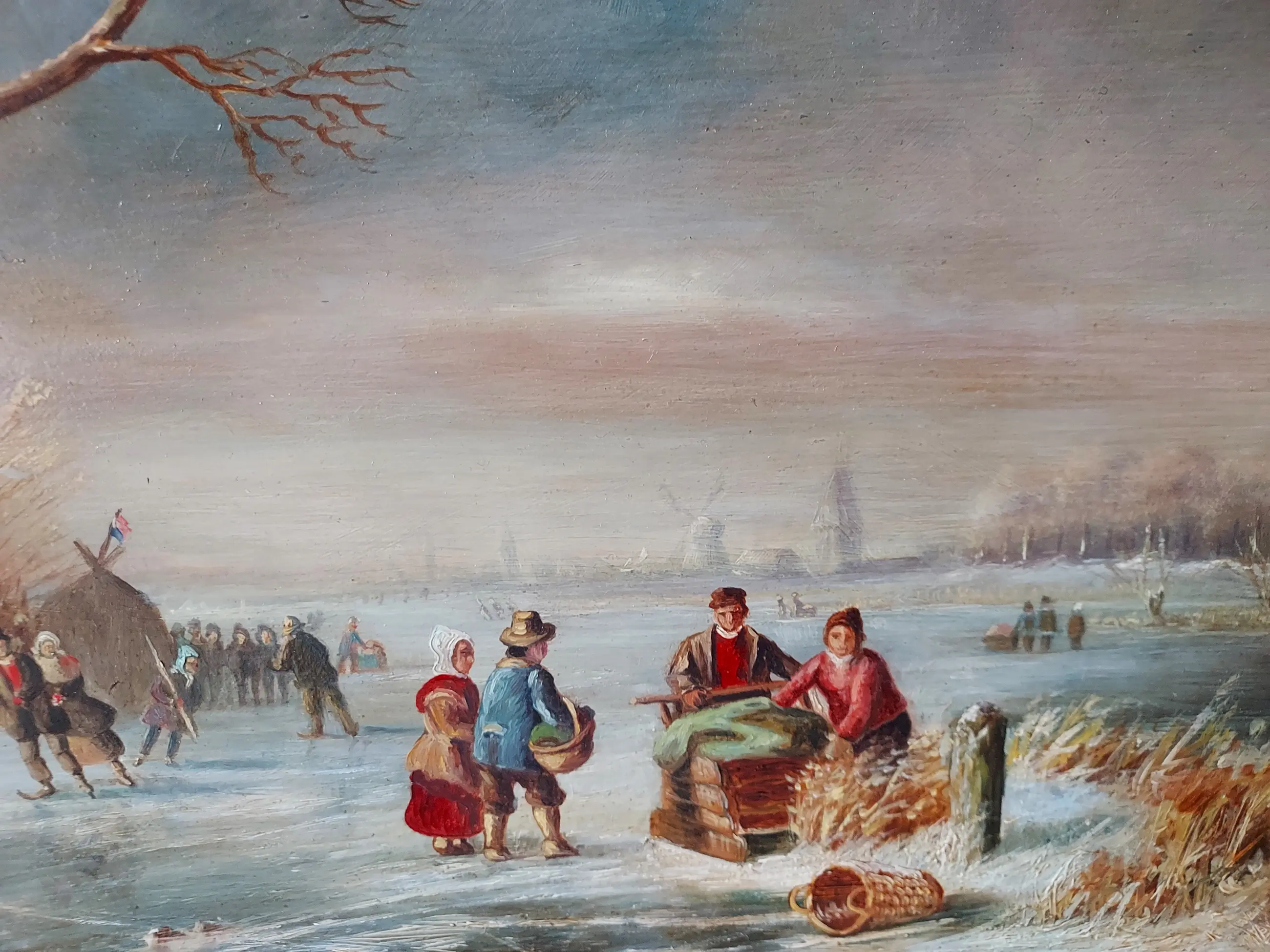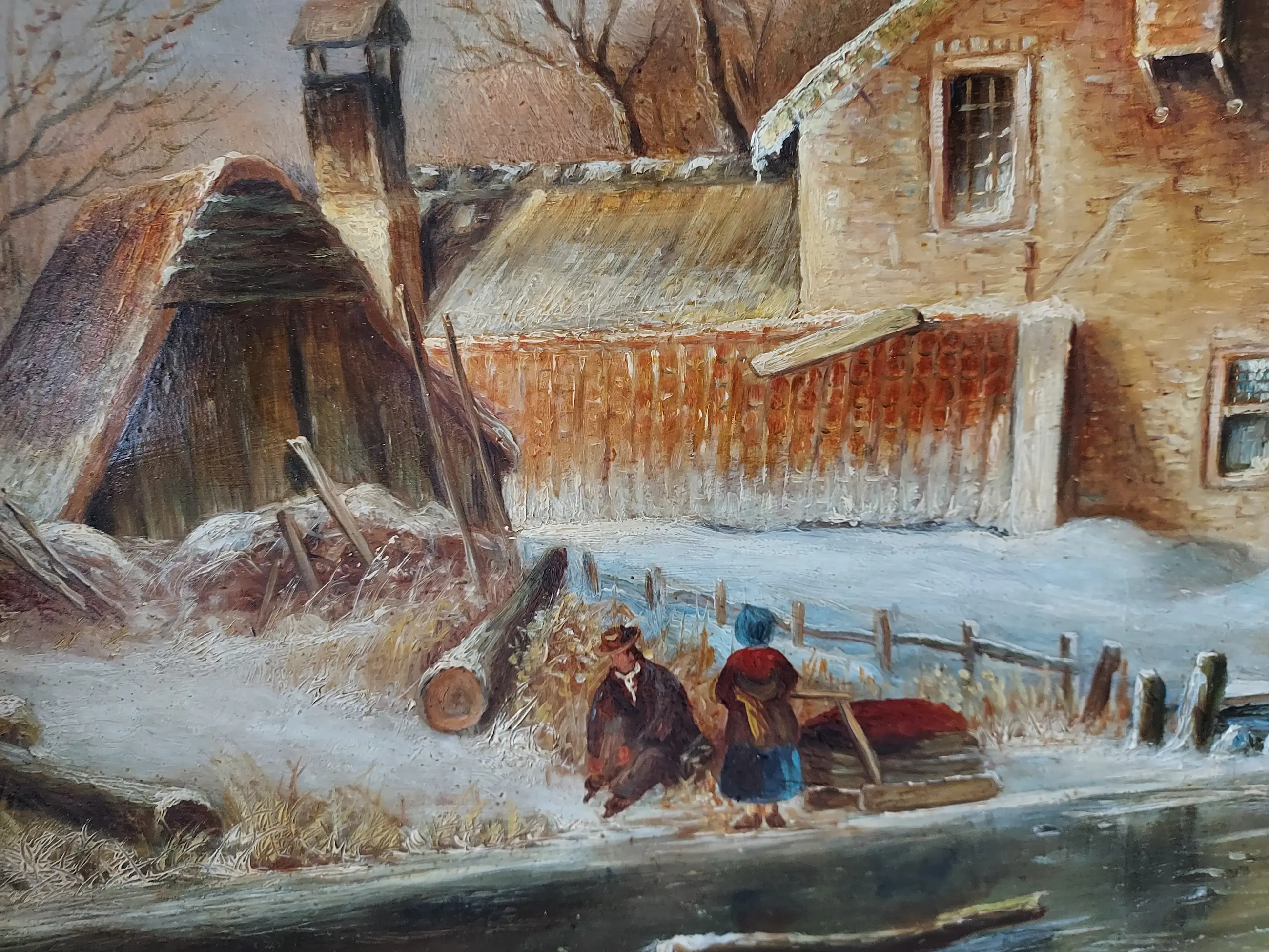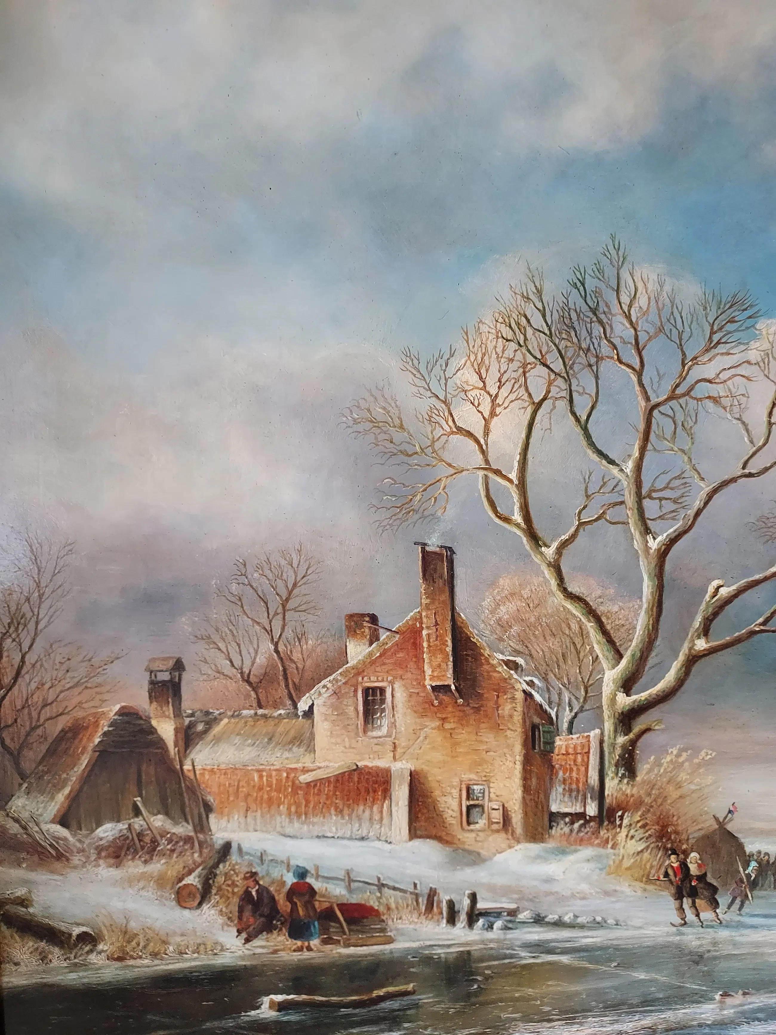 Dit is een sfeervol romantisch winterlandschap. Het werk ademt een nostalgische sereniteit uit: een bevroren rivier, een rustieke boerderij, schaatsers op het ijs, en spelende kinderen vangen het alledaagse leven tijdens een winterse dag in de Lage Landen.