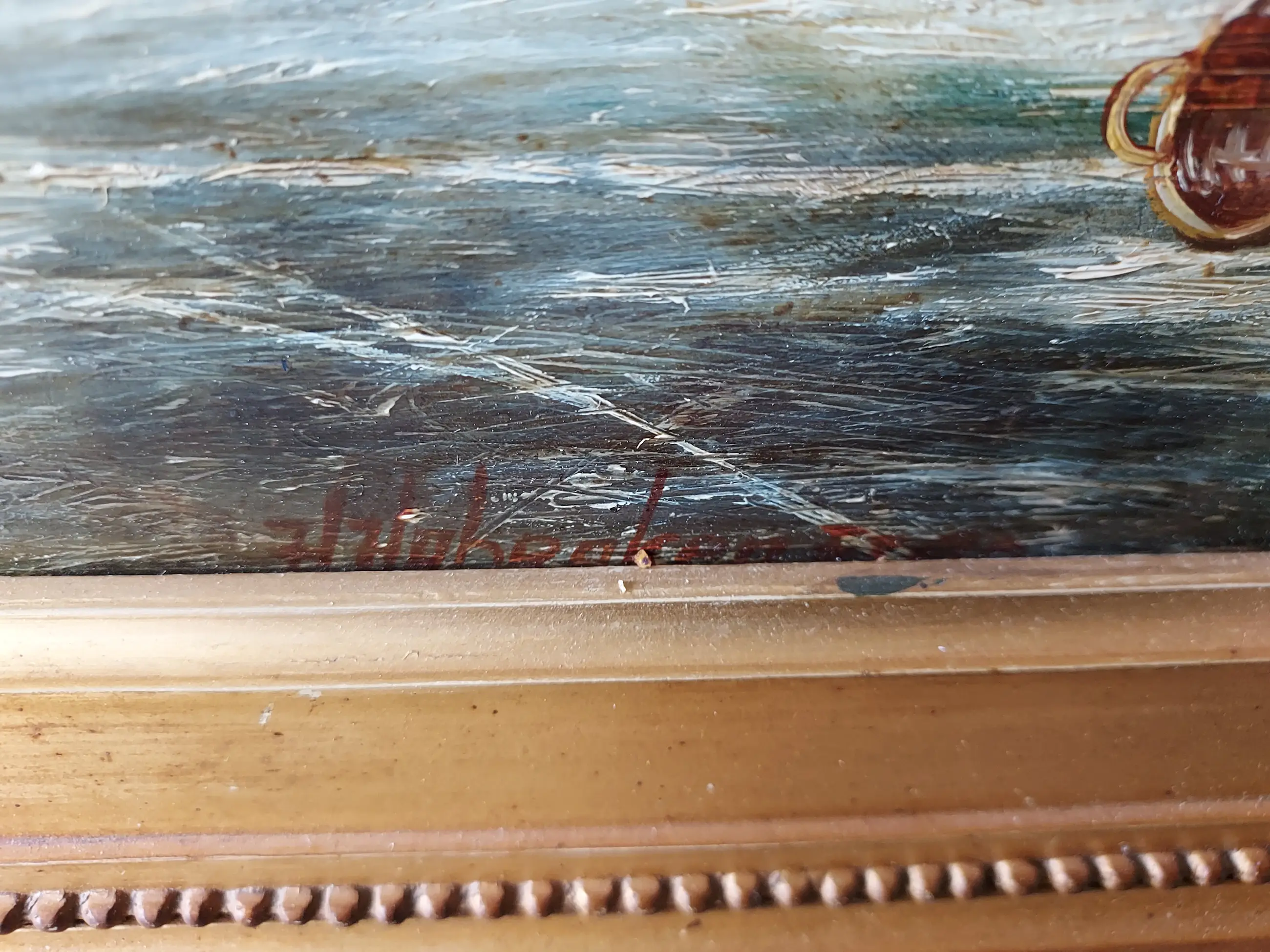 Olieverf op paneel-gesigneerd. Afmetingen werk met lijst: 83 x 93 cm(oude antieke lijst met wat kleine beschadigingen weegt meer als 10kg)