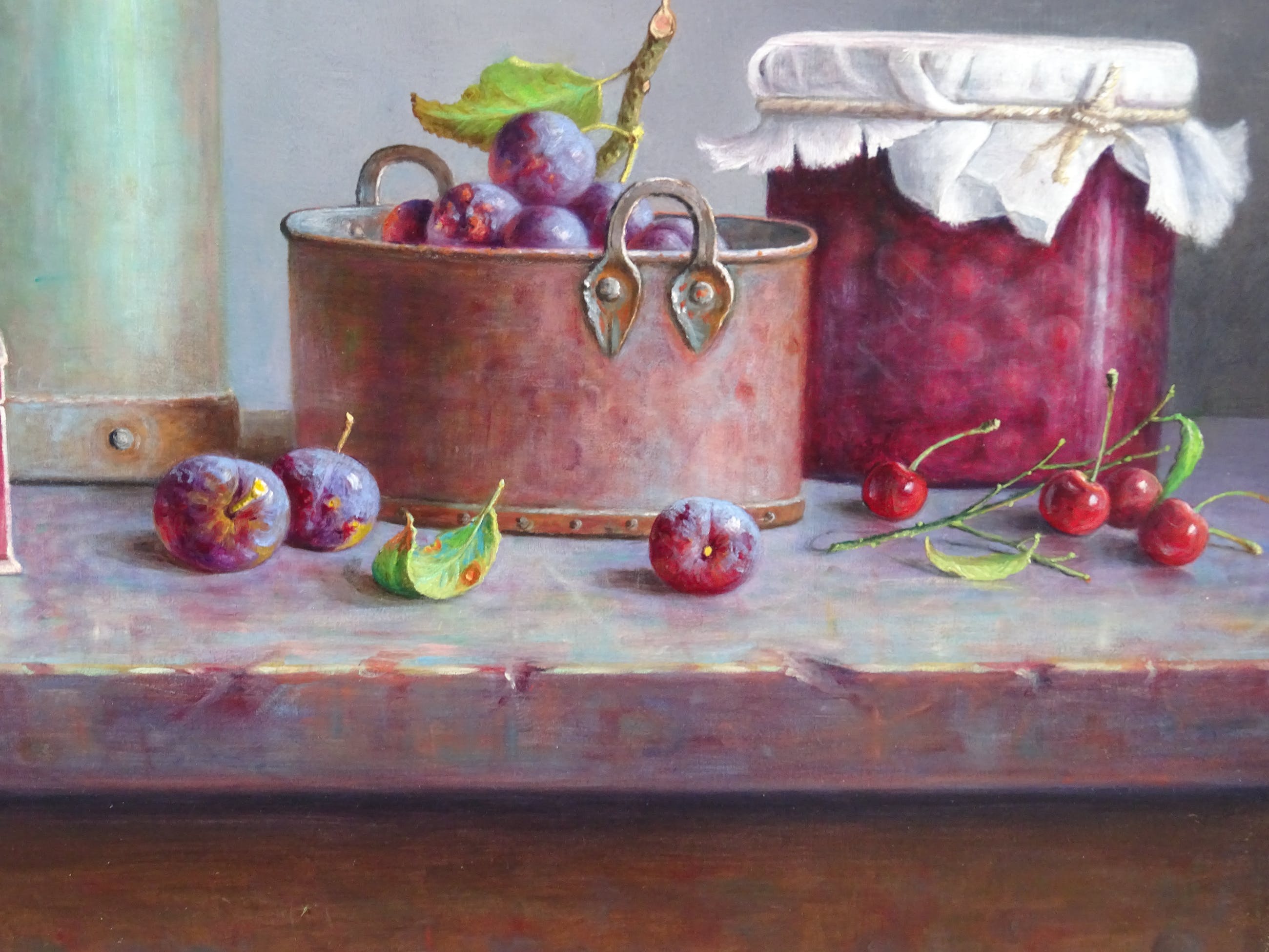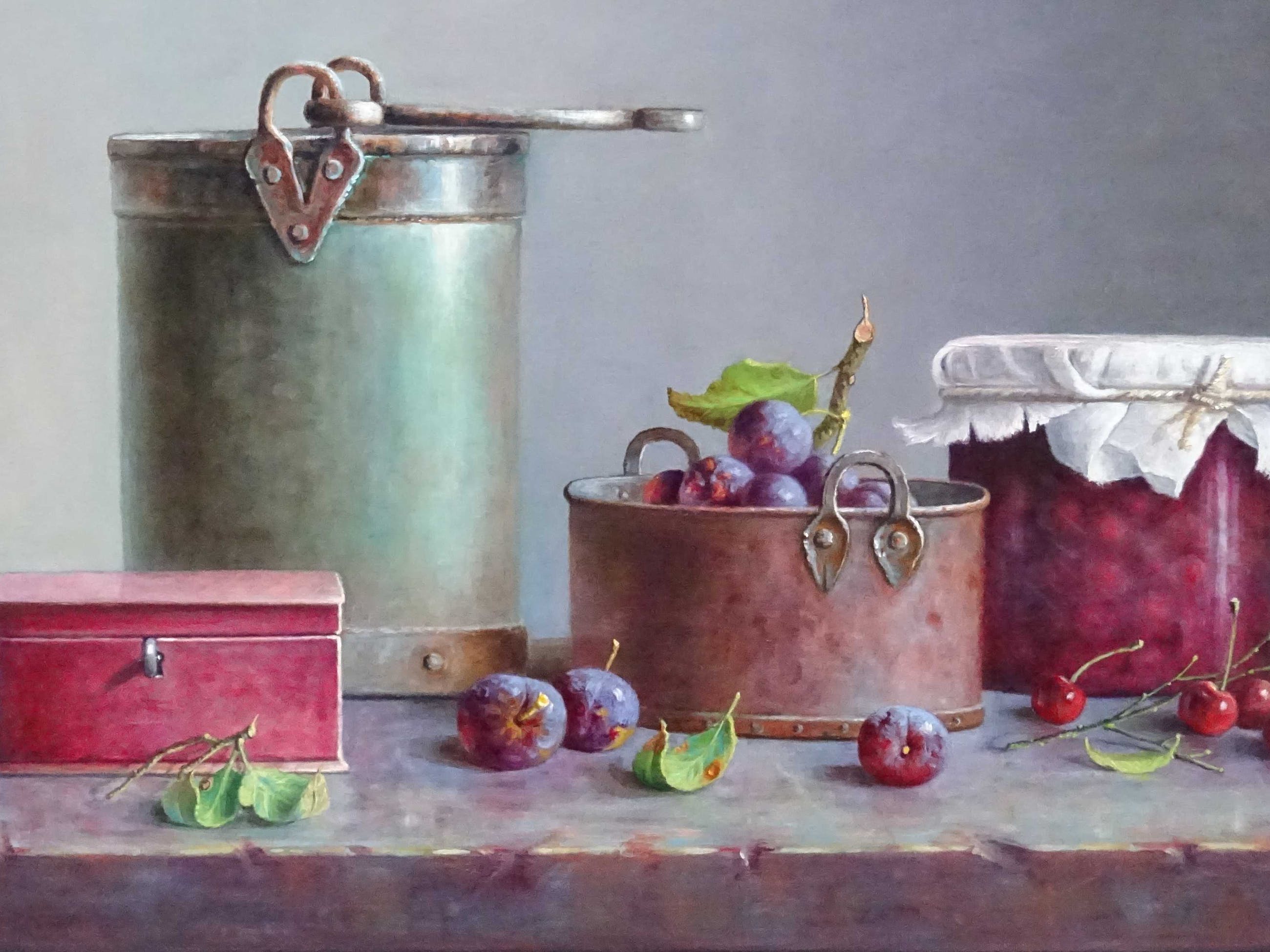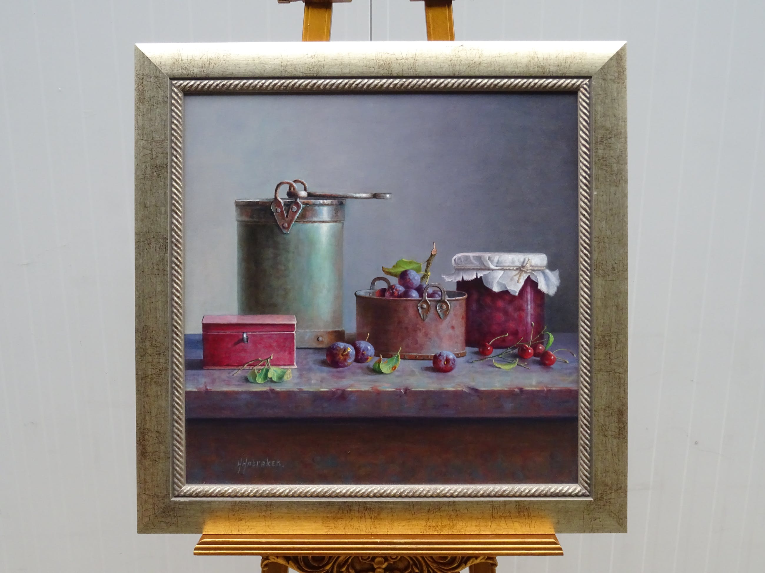 Olieverf op paneel. Afmetingen paneel 60 cm x 60 cm. Afmetingen lijst 73 cm x 73 cm.