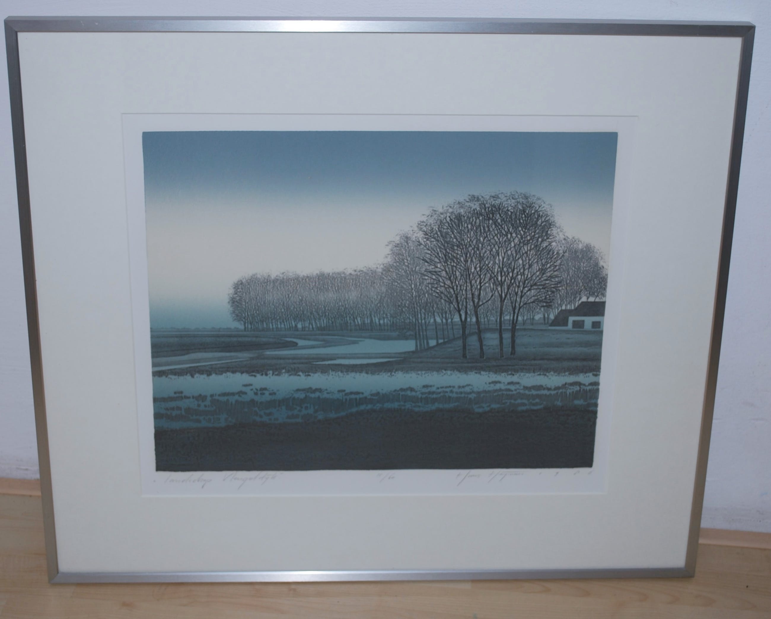 achter passepartout en (dik) glas. in een mooie alu lijst in goede gebruikte staat.
