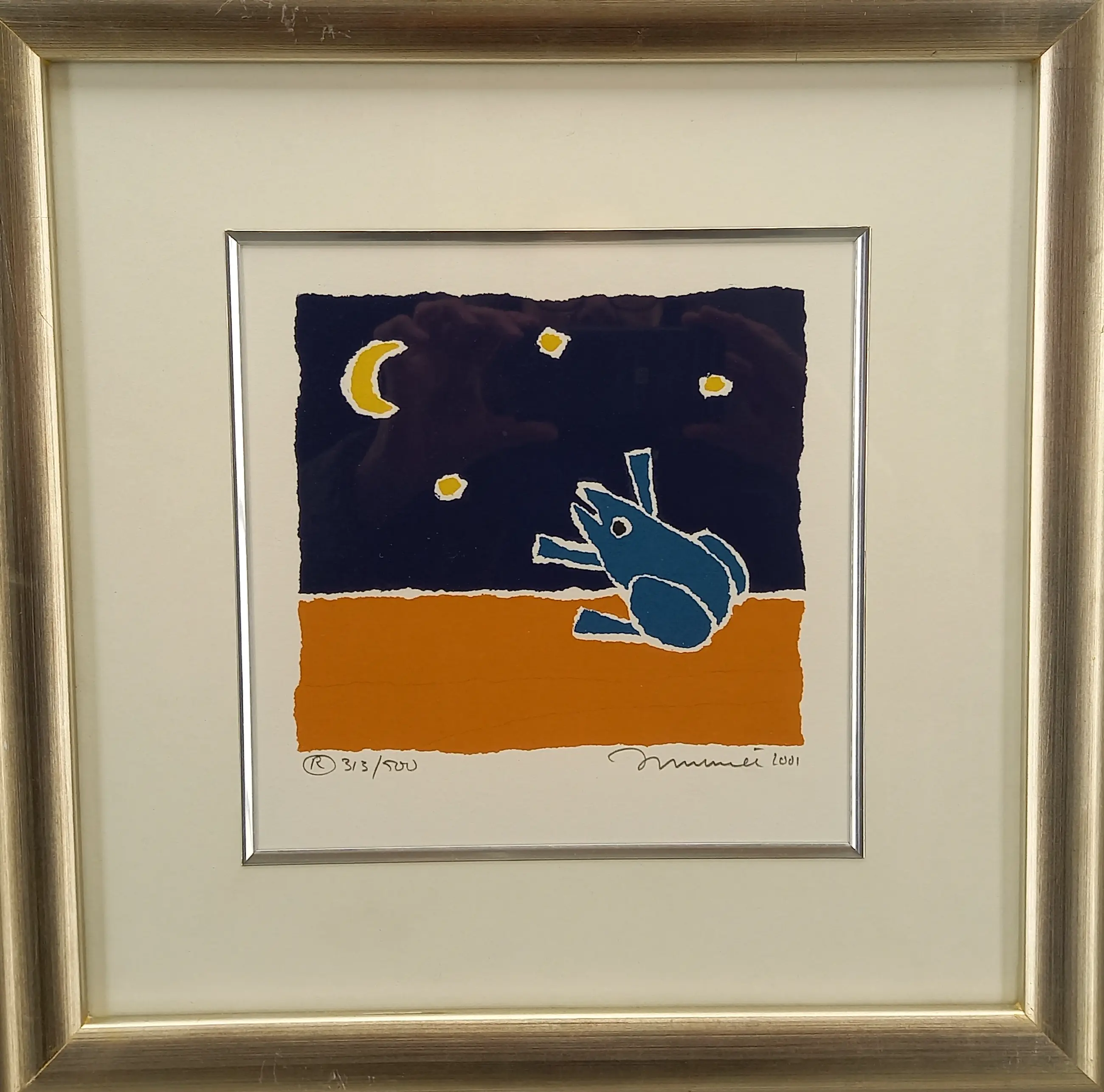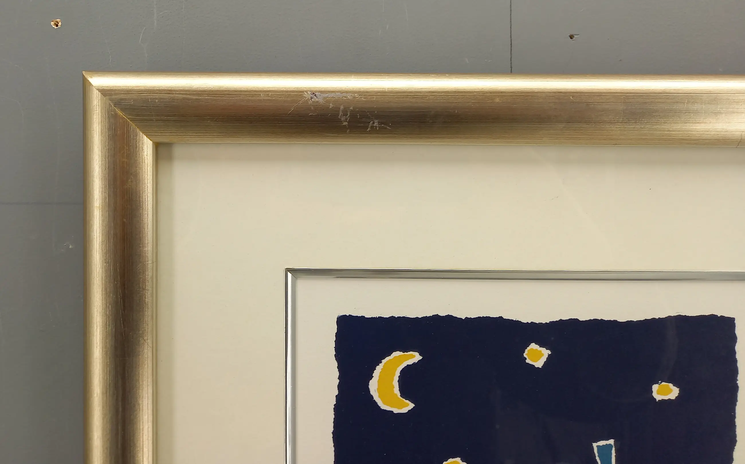 Zeefdruk in goudkleurige houten lijst. De lijst heeft boven een kleine beschadiging.