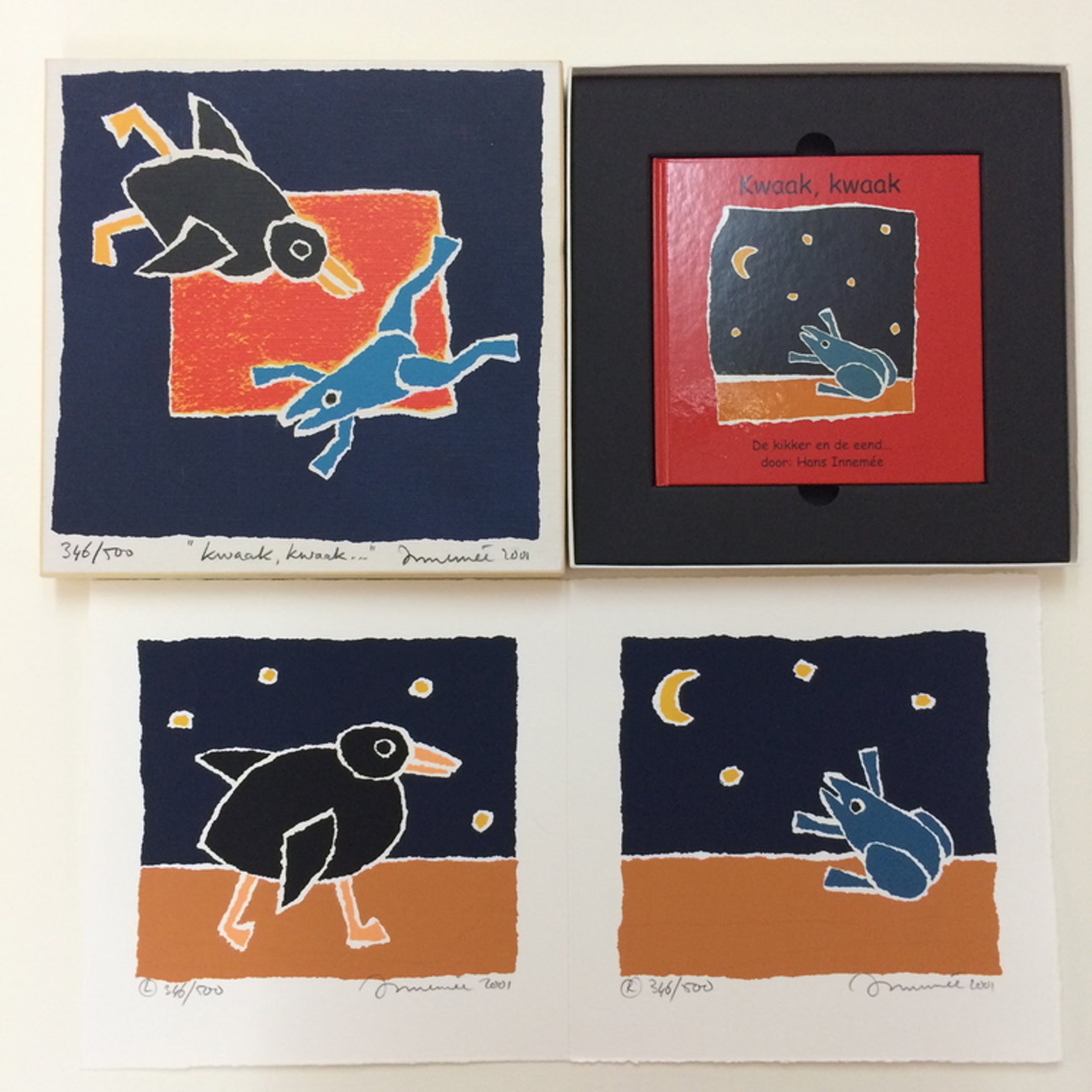 Materiaal : Doosje met 2 lossen zeefdrukken en kunstboekje, de deksel is ook een zeefdruk en zijn allen genummerd en gesigneerd.