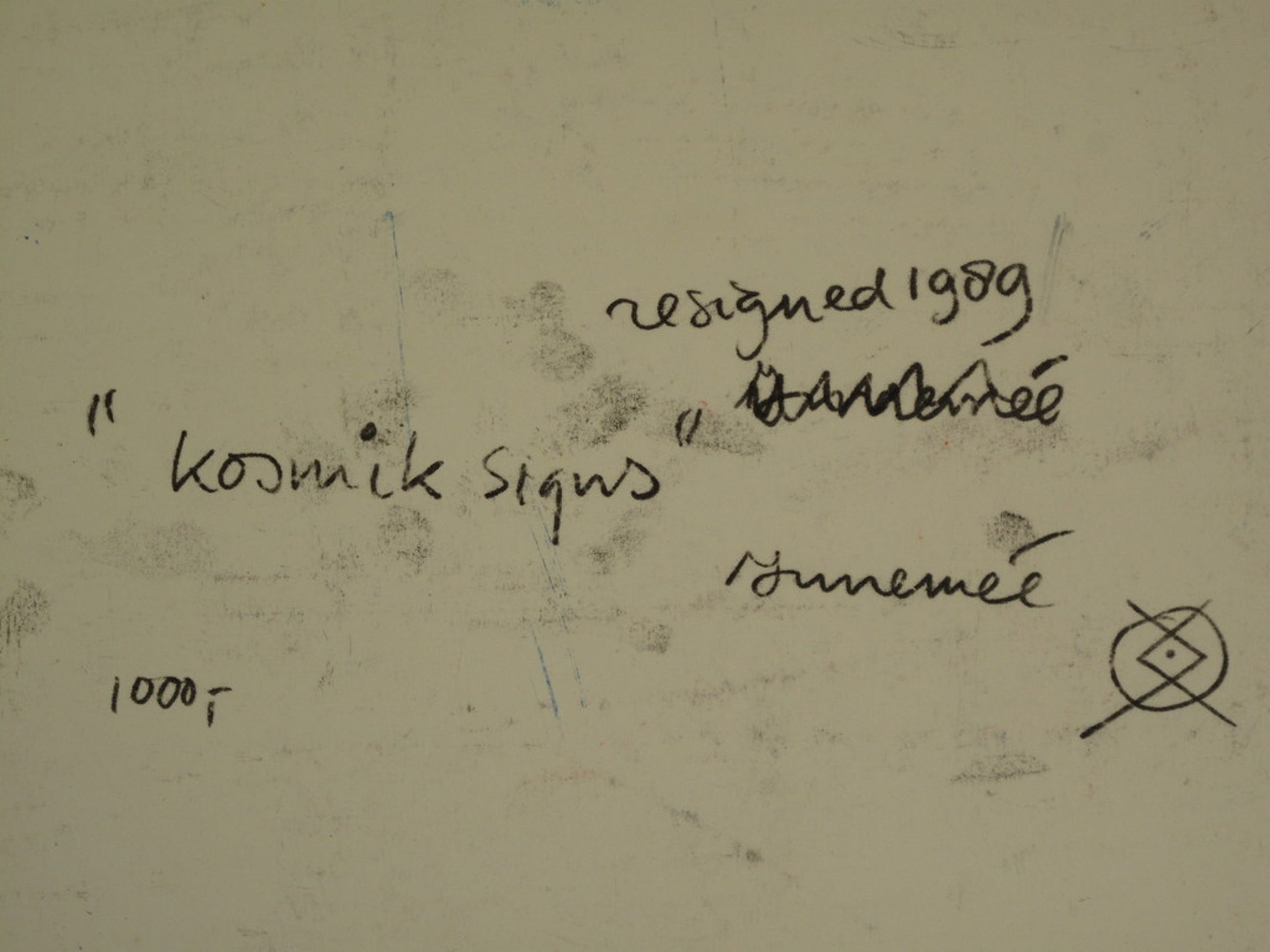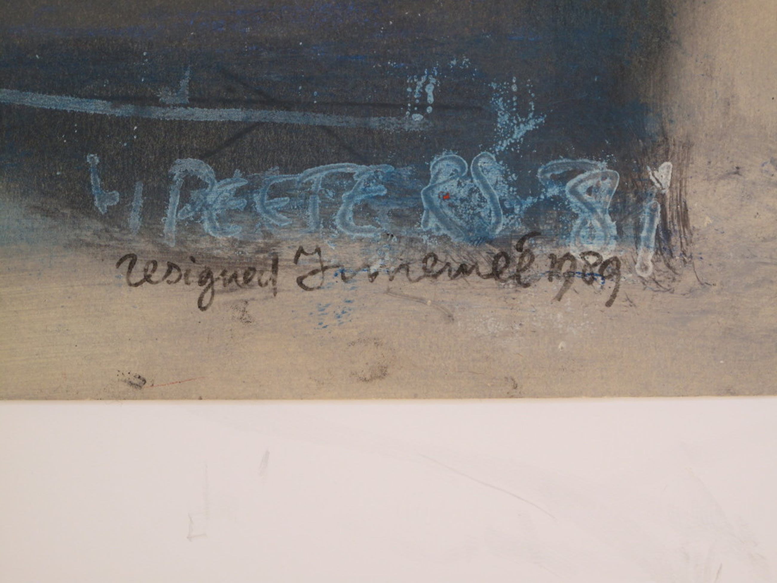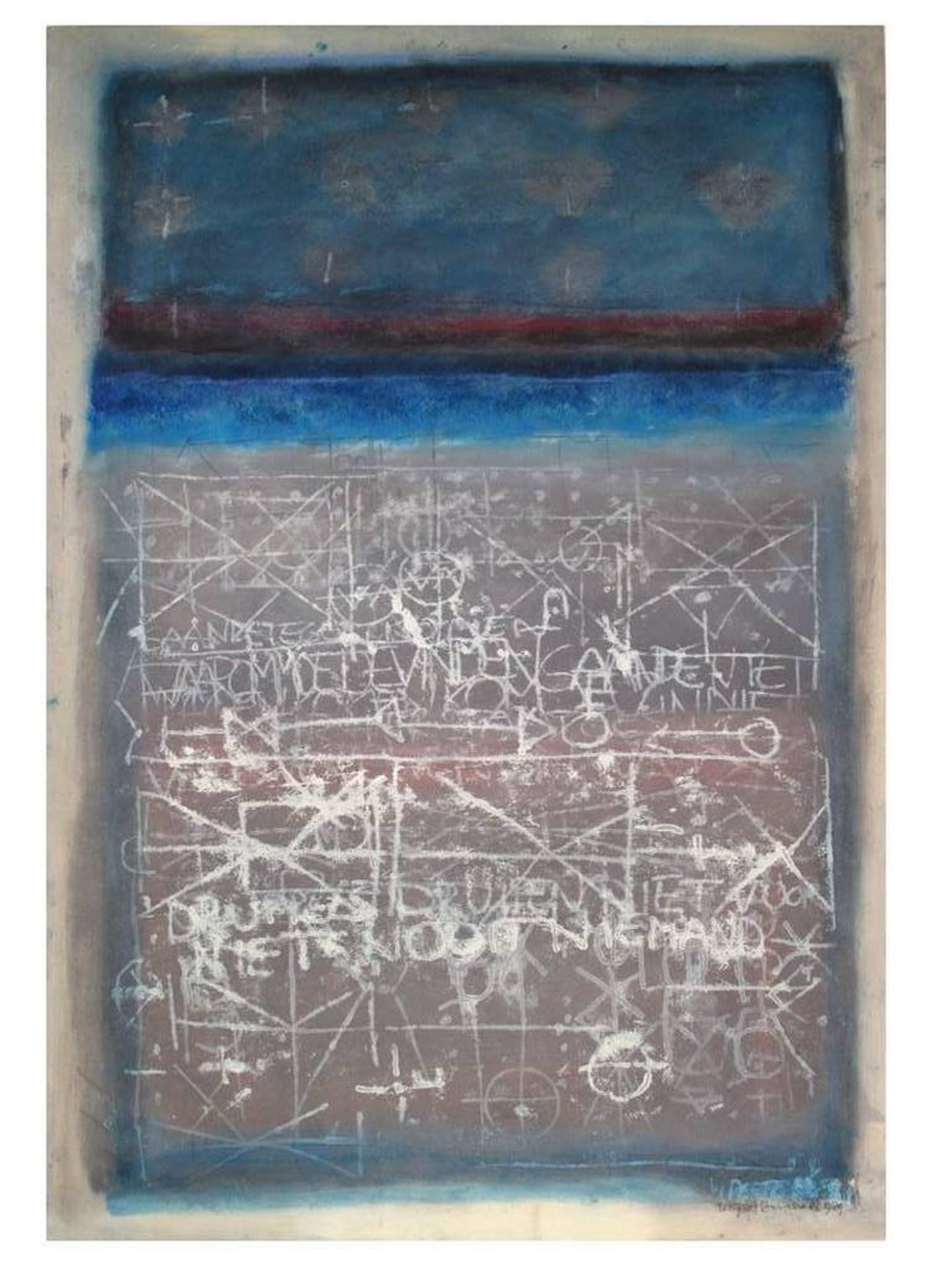 De beeldafmetingen van het werk/gehele blad zijn 70-100 cm en het is niet ingelijst. Het is een gemengde techniek op karton, handgesigneerd met krijt op zowel de voor- als de achterkant. Het werk is resigned dat wil zeggen opnieuw aangebracht over een oud werk heen dat dateert uit 81, zie foto. Het is een gemengde techniek, dus er is maar één exemplaar. het werk is prachtig gelaagd met intense blauwe en paarse kleuren, verkeerd in zeer goede staat en kan graties worden afgehaald. Verzenden kost € 20,00.