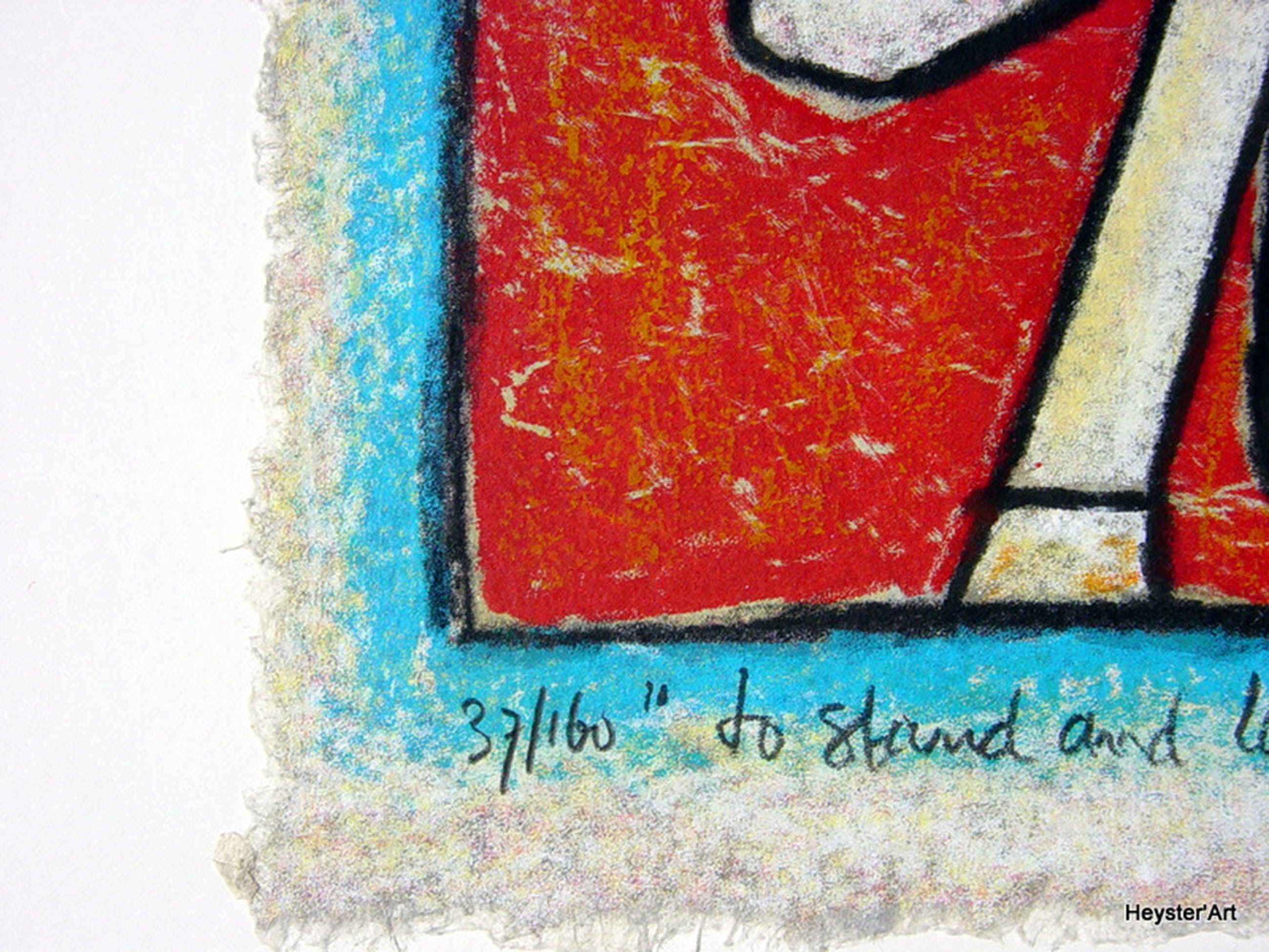 Puntgave zeefdruk in formaat 40x35 cm. Beeld 30x23cm. Nooit ingelijst geweest. Het bijzondere van deze zeefdruk is dat na de druk dit werk door Hans Innemee handmatig is bewerkt, waardoor de kleuren veel sprekender zijn geworden. Hierdoor is ieder exemplaar ook verschillend. In zekere zin is het uniek.