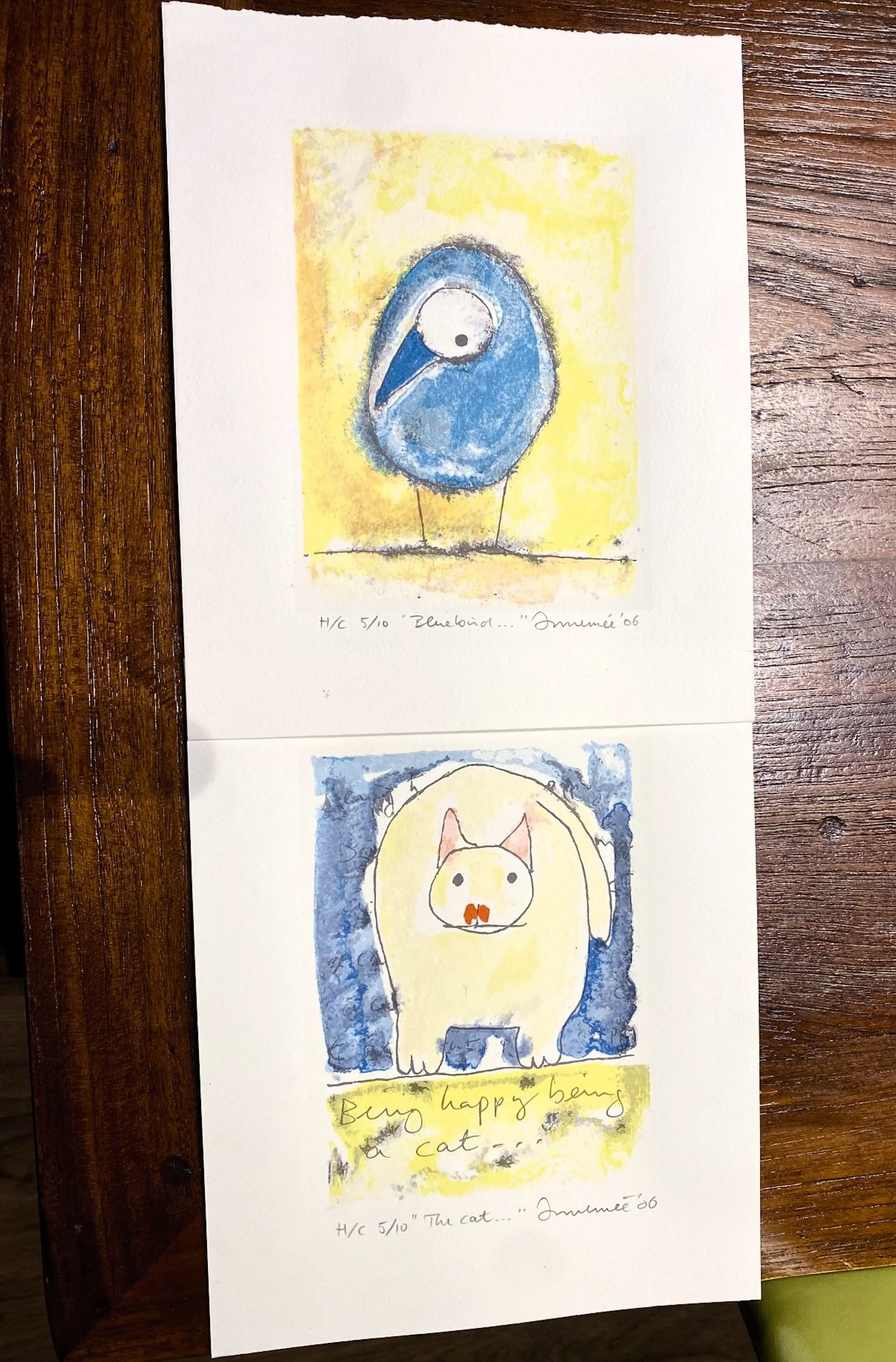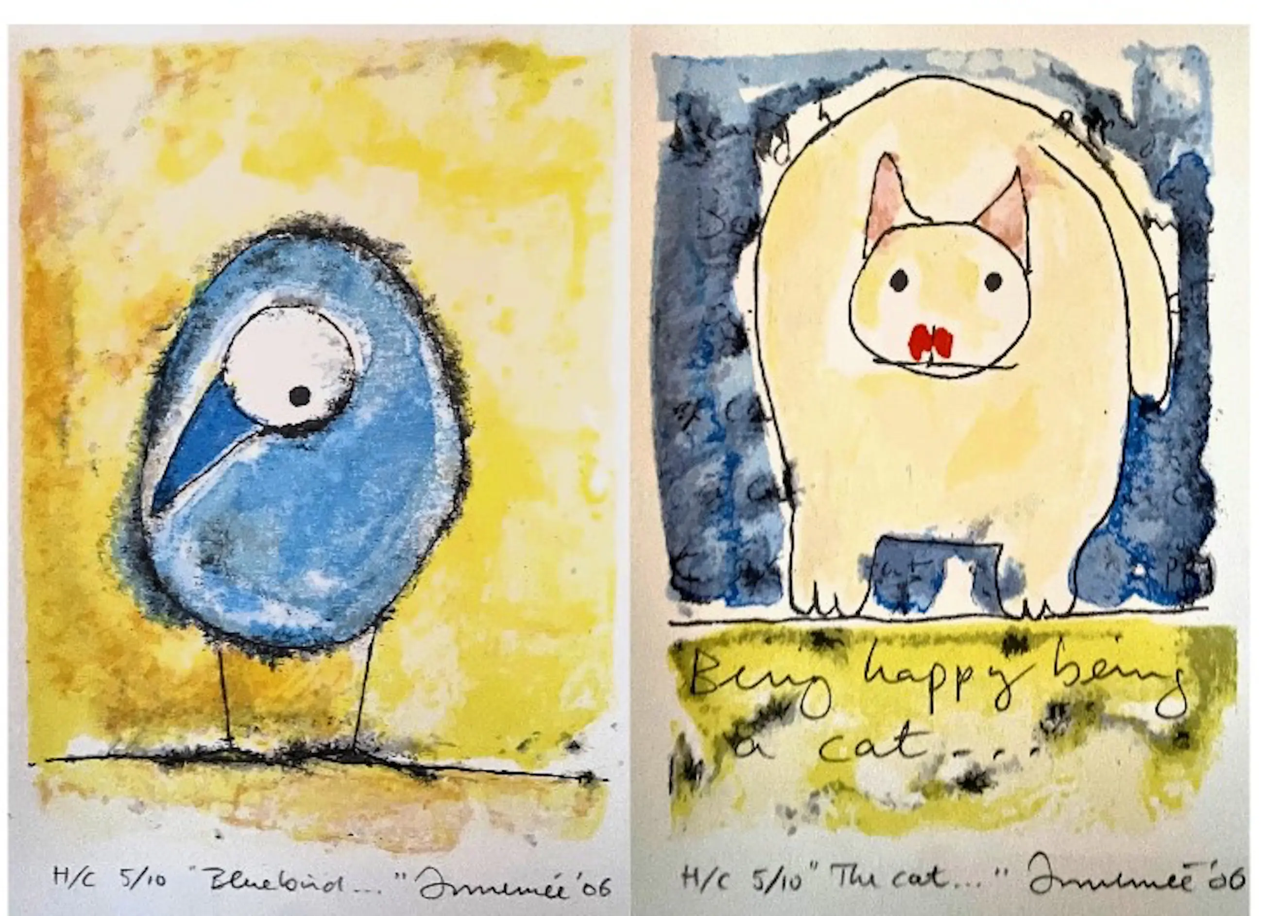 The Cat en Blue Bird. Een in kleur afgestemd potentieel tweeluik met een identiek HC nr: 5/10. Voor liefhebbers van collector's items. Inclusief boord zijn ze 26 x 21 cm. In 2006 maakte Hans Innemee een serie (9) verfijnde tekeningen die met waterverf werden ingekleurd. Daarvan zijn in een oplage van 50 st. zeefdrukken gemaakt, Mooie werkjes die qua afwerking en materiaal afwijken van zijn meer reguliere werk. Van deze series zijn meerdere HC's gemaakt (Hors du Commerce). HC's gaan in eerste instantie meestal naar familie , vrienden of de zeefdrukker, maar komen later ook vaak in de handel terecht. Sommige collectioneurs hebben voorkeur voor HC's'. Wij hebben van deze serie meerdere HC's in collectie. Ze komen uit een map en zijn nooit eerder ingelijst geweest (dus als nieuw).