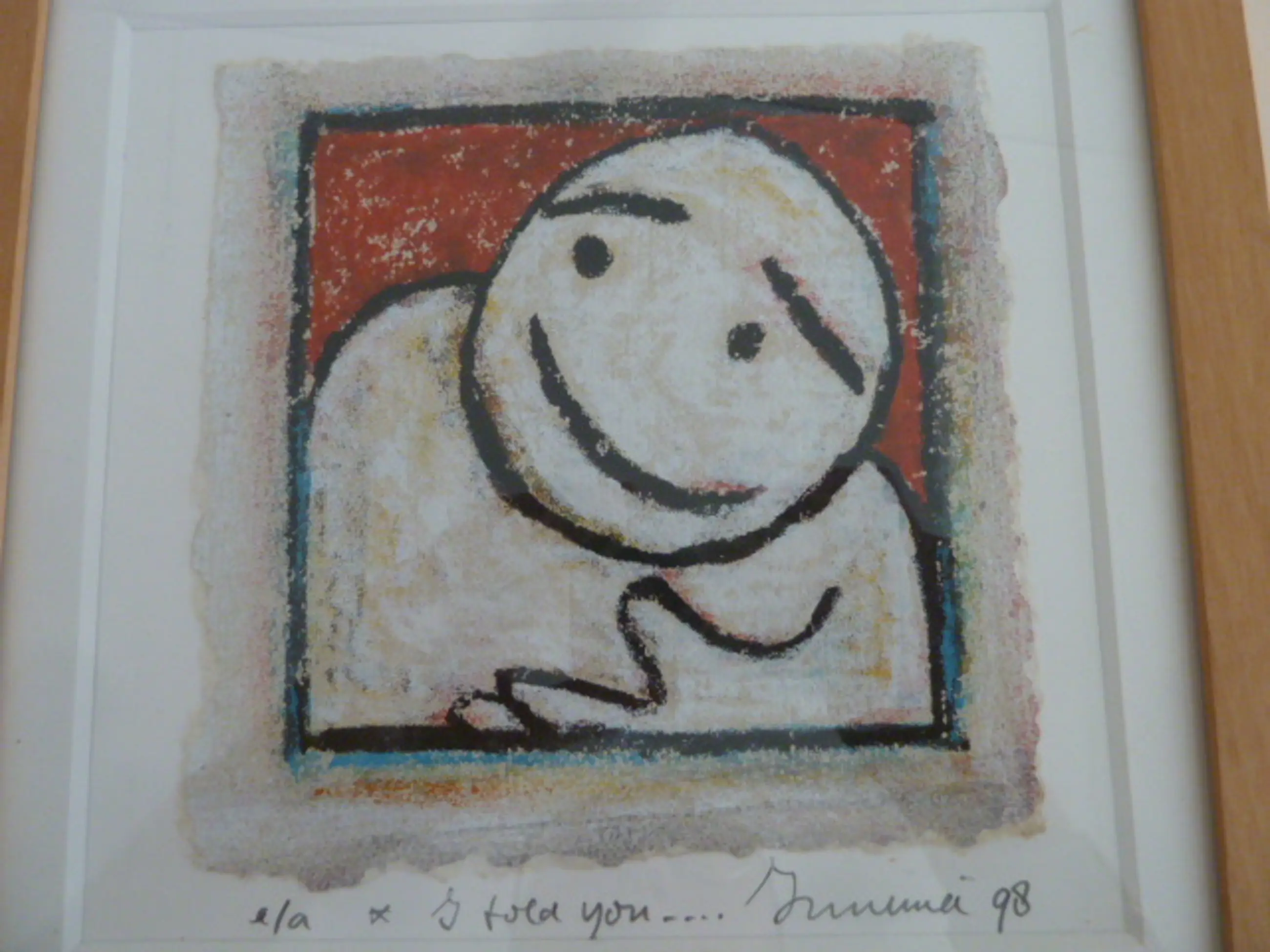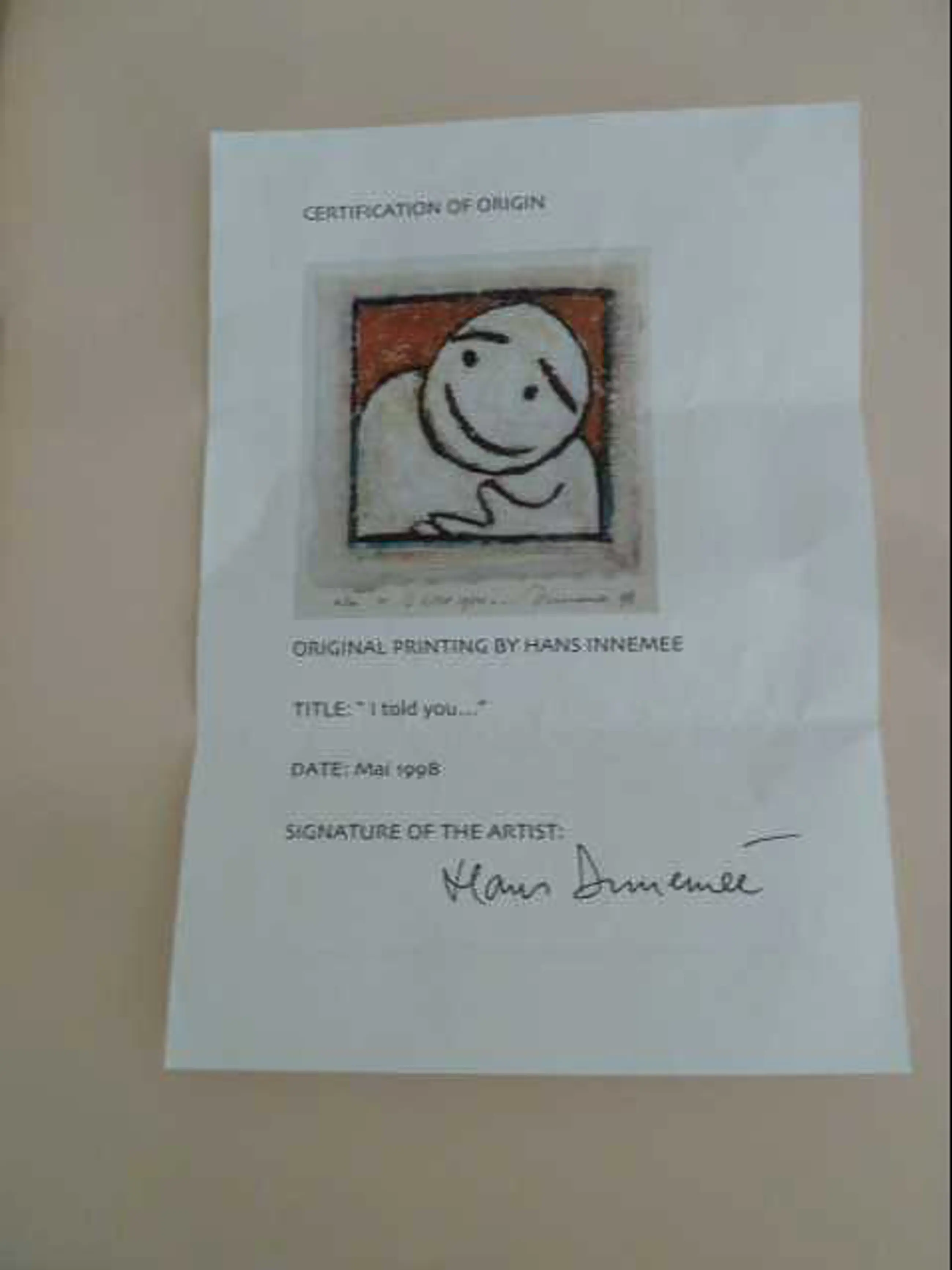 Een werk van Hans Innemée op geschept papier. Het is een e/a exemplaar. Het stelt een figuur voor die met overgave meldt dat hij/zij meldt dat een gebeurtenis o.i.d. allang voorzien was. Werk is mooi ingelijst, niet verkleurd.