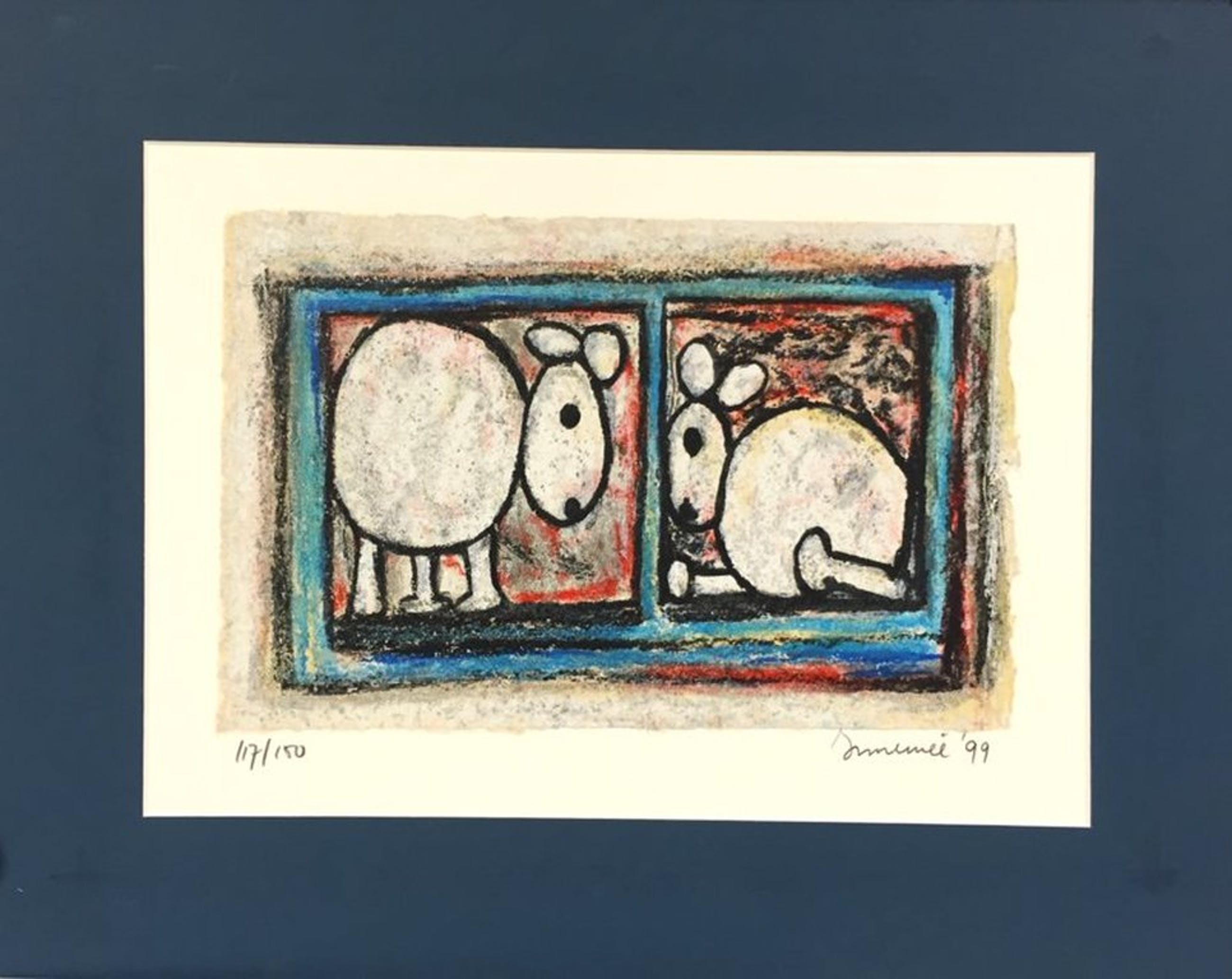 Handgesigneerd (rechtsonder) zeefdrukje (117/150) op handgeschept papier van Hans Innemee met als titel 'Schaapjes'. Voorzien van zuurvrij passepartout. Buitenmaat 40x50 cm, zeefdrukmaakt 32x20 cm. In uitmuntende staat.