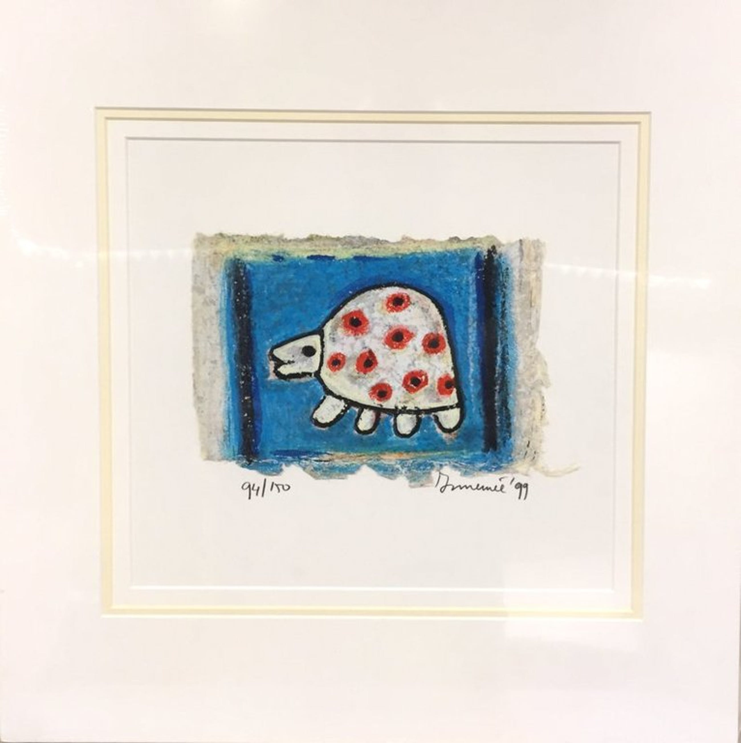 Handgesigneerd (rechtsonder) zeefdrukje (94/150) op handgeschept papier van Hans Innemee met als titel 'Schildpadje'. Voorzien van 3-dubbel zuurvrij passepartout. Buitenmaat 40x40 cm, zeefdrukmaakt 20x15 cm. In uitmuntende staat.