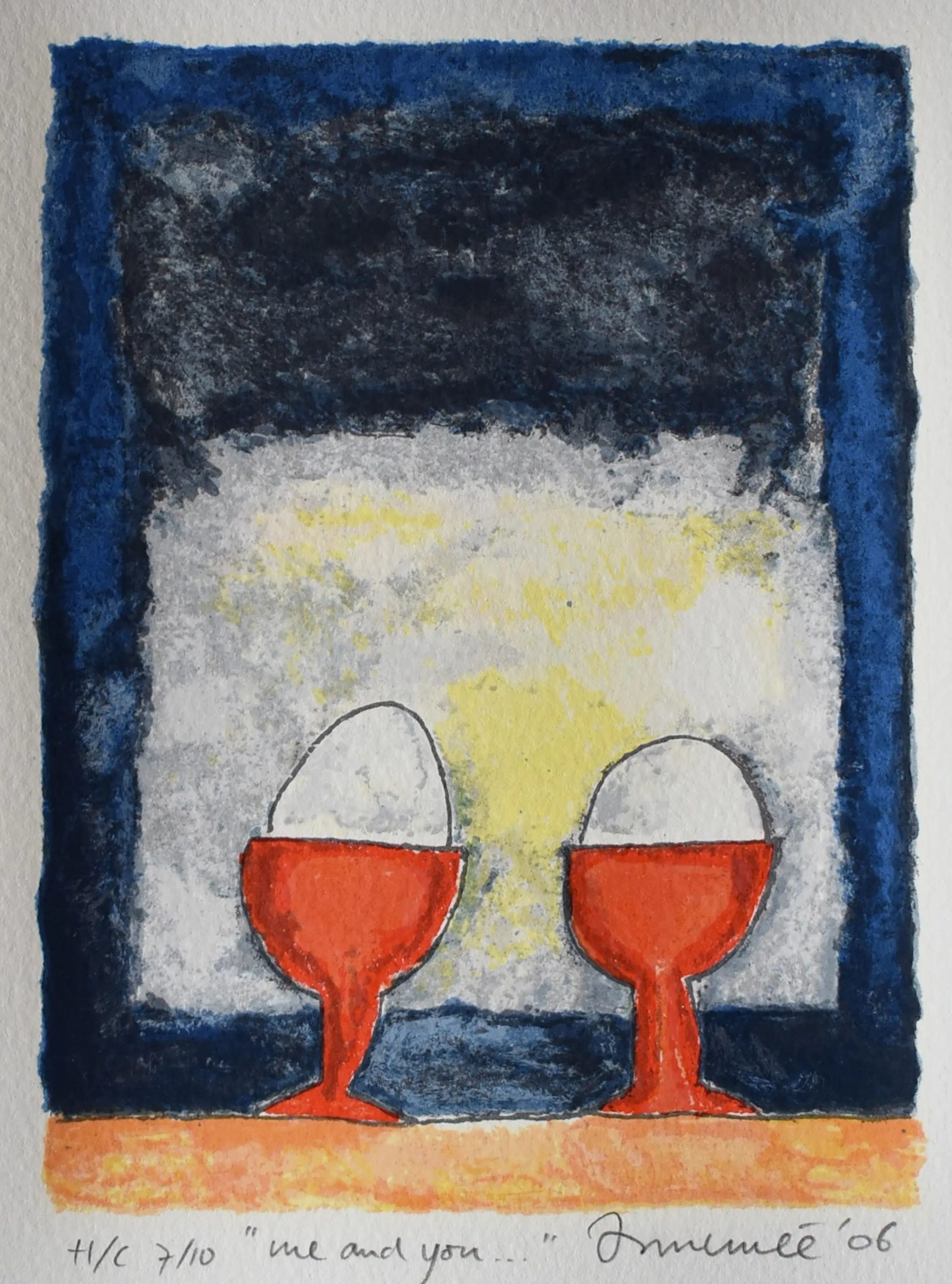 Me and You is onderdeel van een in 2006 door Hans Innemee gemaakte serie (9) verfijnde tekeningen die met waterverf werden ingekleurd. Daarvan zijn in een oplage van 50 st. zeefdrukken gemaakt, o.a. voor de Japanse markt. U zult ze in Nederland niet of zelden aantreffen. Mooie werkjes ( inclusief boord 26 x 21 cm) die qua afwerking en materiaal afwijken van het meer reguliere werk. Van deze series zijn meerdere HC's gemaakt (Hors du Commerce). HC's gaan in eerste instantie meestal naar vrienden, relaties en/of de zeefdrukker maar komen vaak later ook in de handel terecht en vormen dan een collectors item (net als EA's). Wij hebben van deze serie meerdere HC's in collectie. Het HC nummer kan afwijken van het nummeropde afbeelding. Ze komen uit een map en zijn nooit eerder ingelijst geweest (dus als nieuw).