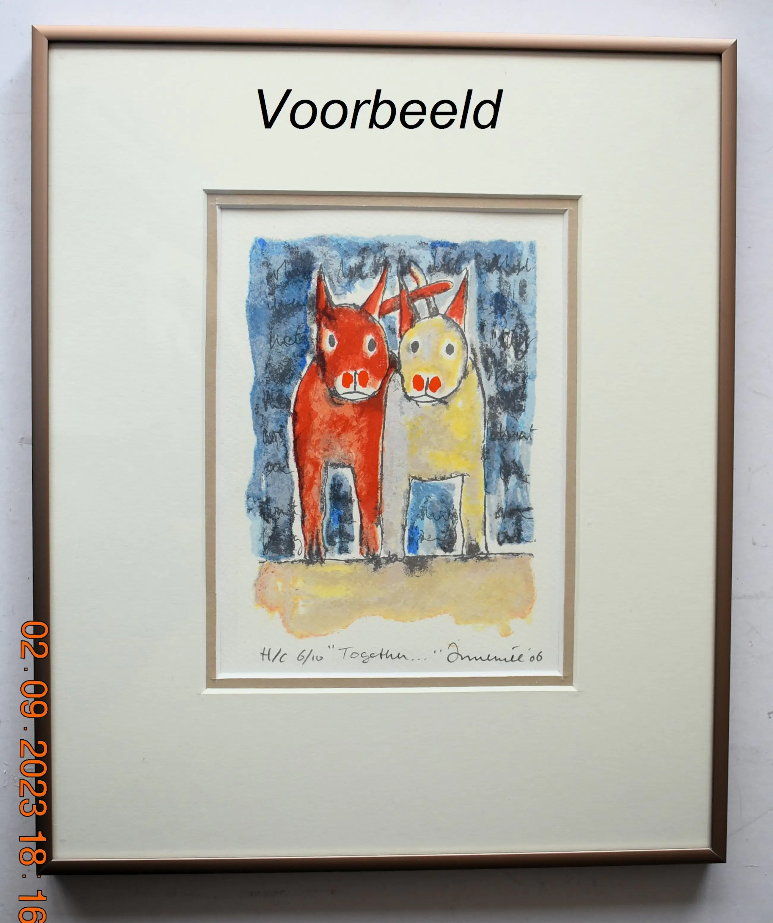 Let op : het werk is niet ingelijst. We hebben een lijstenmakerij en kunnen deze werkjes zeer voordelig voor u inlijsten. Zie het voorbeeld hoe een ingelijst werk eruit kan zien. Informeer naar de prijs en mogelijkheden.