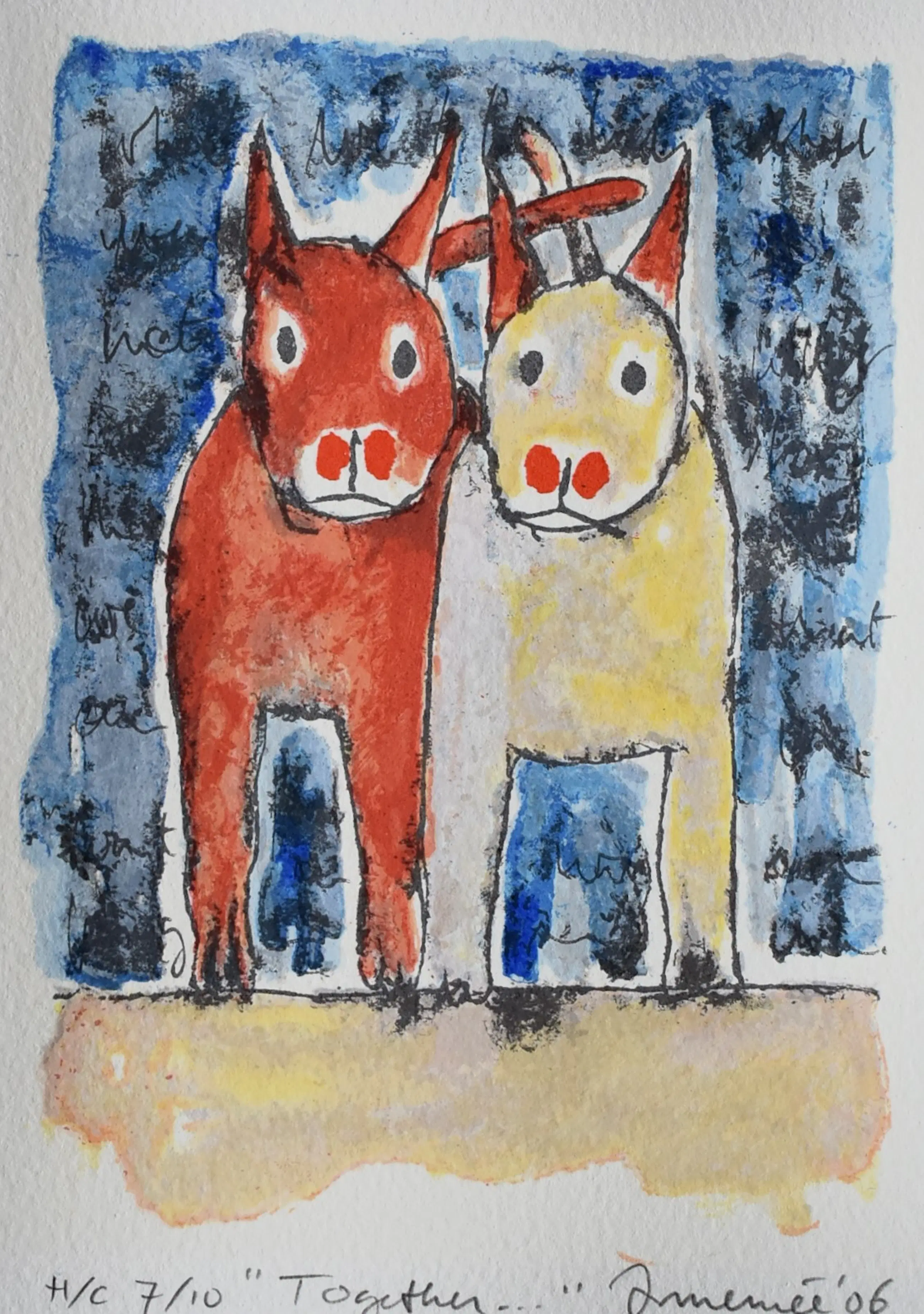 Together is onderdeel van een in 2006 door Hans Innemee gemaakte serie (9) verfijnde tekeningen die met waterverf werden ingekleurd. Daarvan zijn in een oplage van 50 st. zeefdrukken gemaakt, o.a. voor de Japanse markt. U zult ze in Nederland niet of zelden aantreffen. Mooie werkjes ( inclusief boord 26 x 21 cm) die qua afwerking en materiaal afwijken van het meer reguliere werk. Van deze series zijn meerdere HC's gemaakt (Hors du Commerce). HC's gaan in eerste instantie meestal naar vrienden, relaties en/of de zeefdrukker maar komen vaak later ook in de handel terecht en vormen dan een collectors item (net als EA's). Wij hebben van deze serie meerdere HC's in collectie. Het HC nummer kan afwijken van het nummer op de afbeelding. Ze komen uit een map en zijn nooit eerder ingelijst geweest (dus als nieuw).