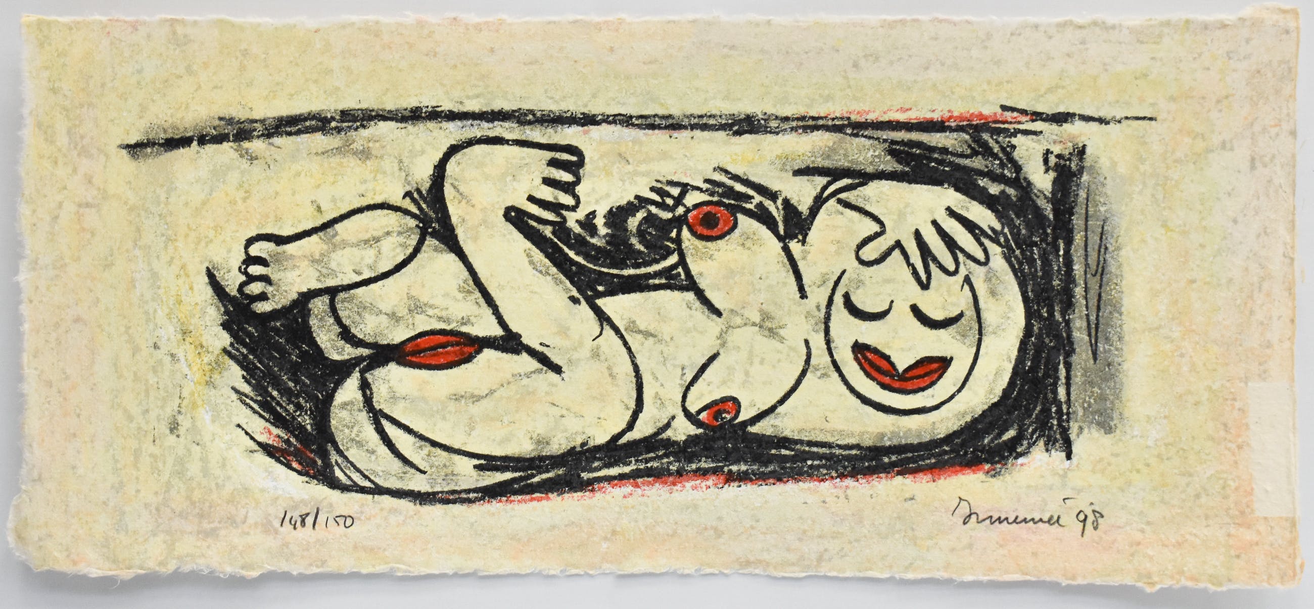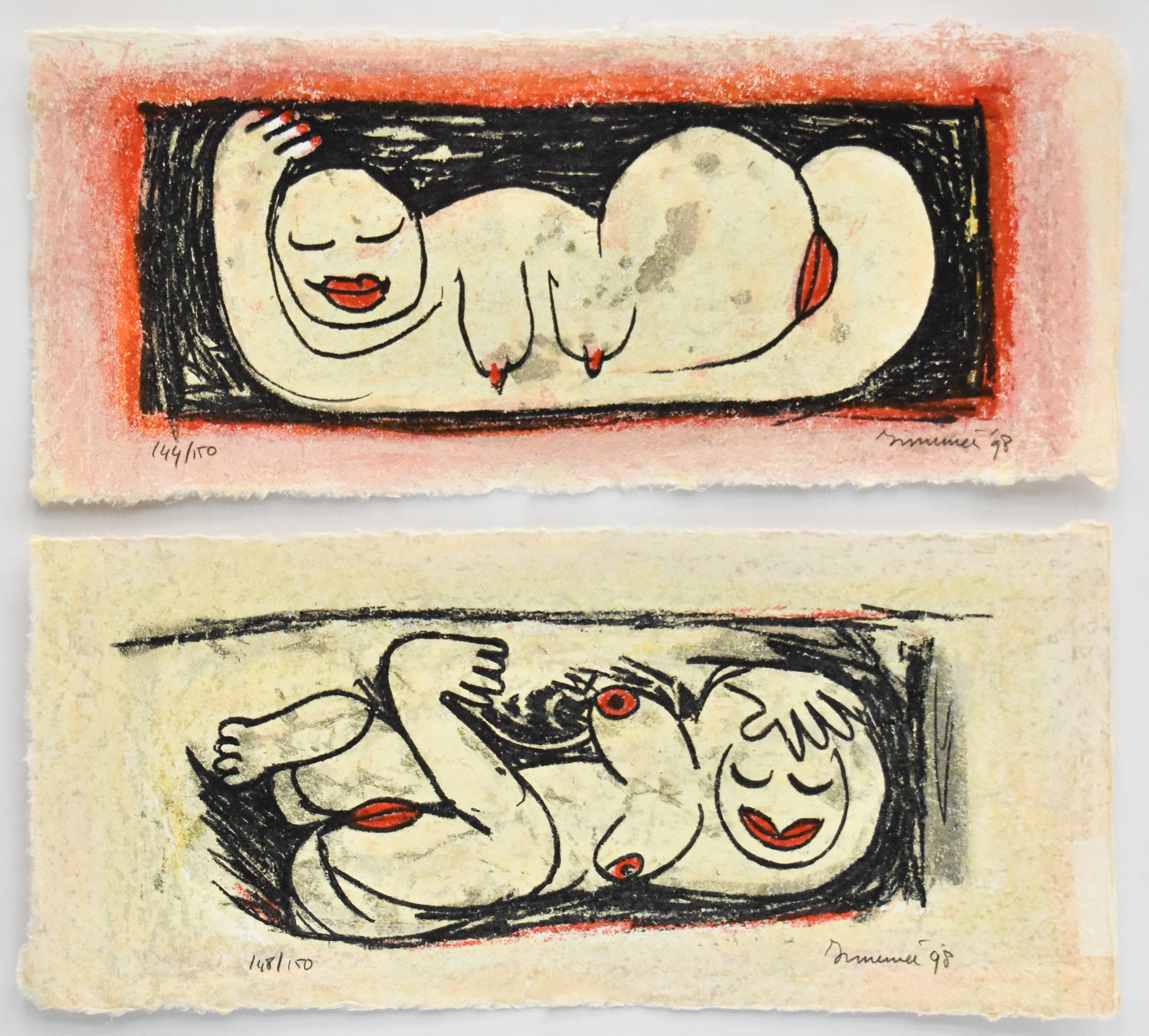 Twee leuke werken van Hans Innemee op handgeschept papier. Doordat ze ongelijst zijn kunt u achteraf altijd nog zelf bepalen om deze dames apert of gezellig samen in te lijsten.