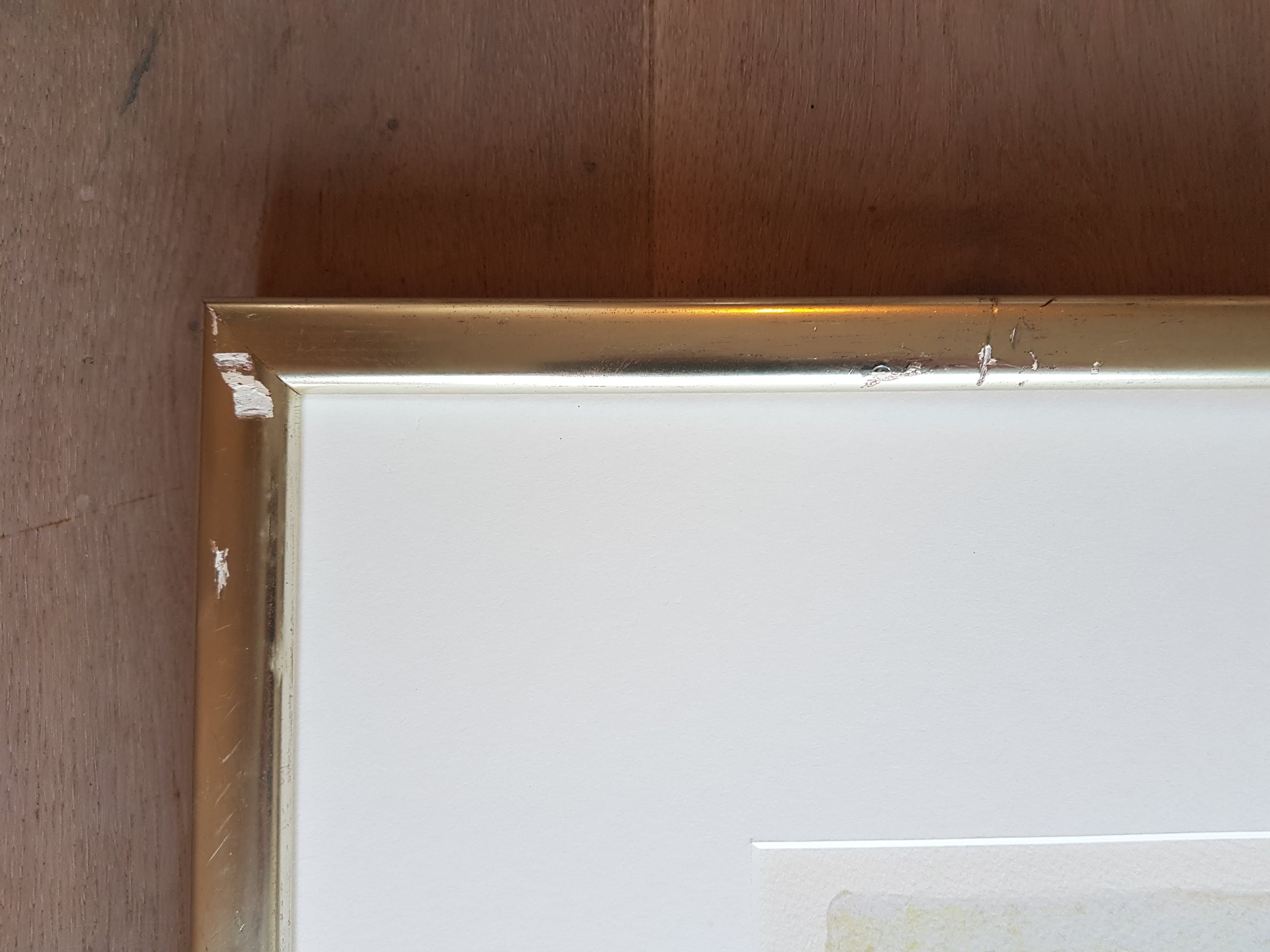 | Het werk is in goede staat. De lijst heeft lichte beschadigingen en het glas ontbreekt. | |||