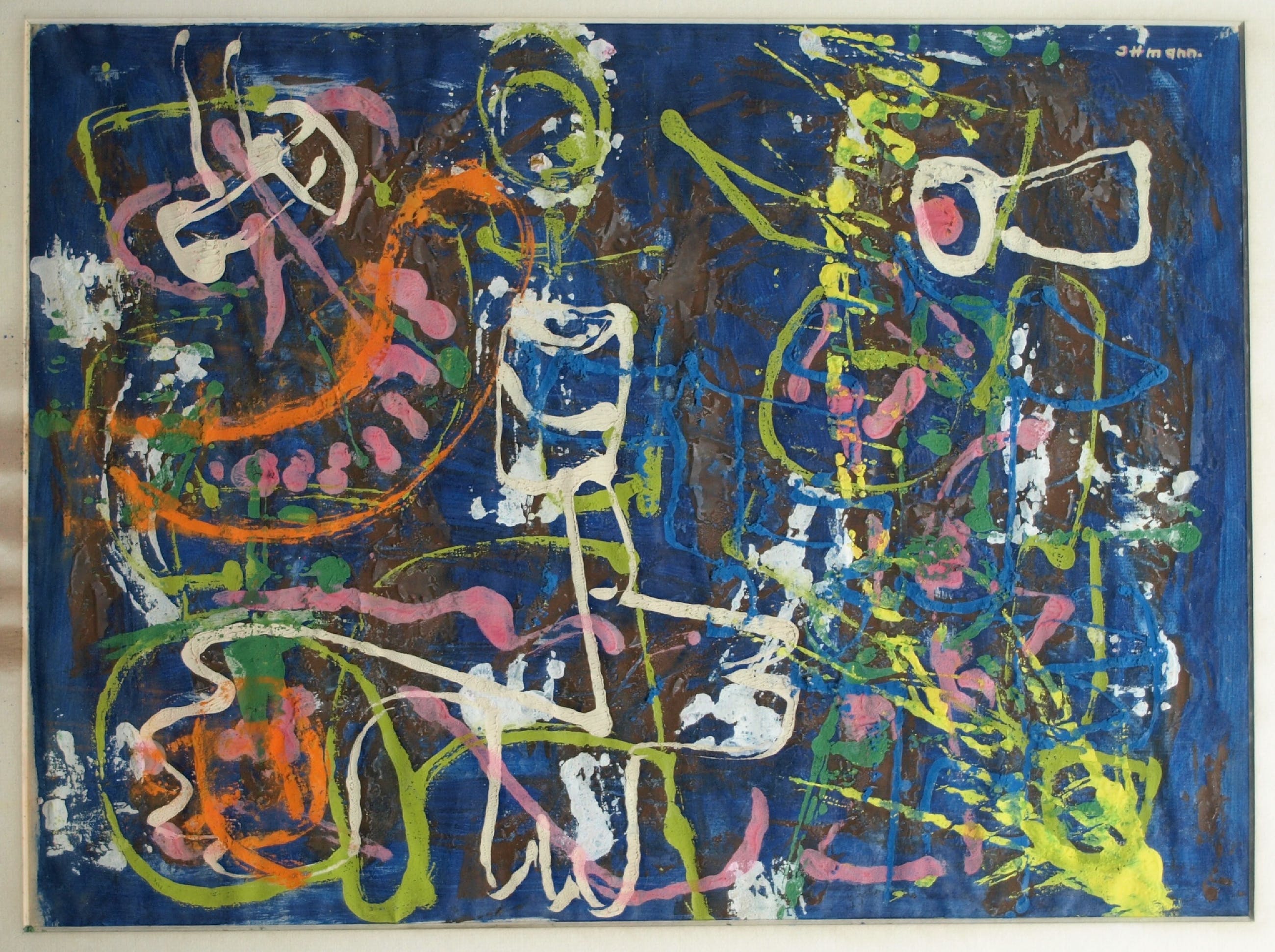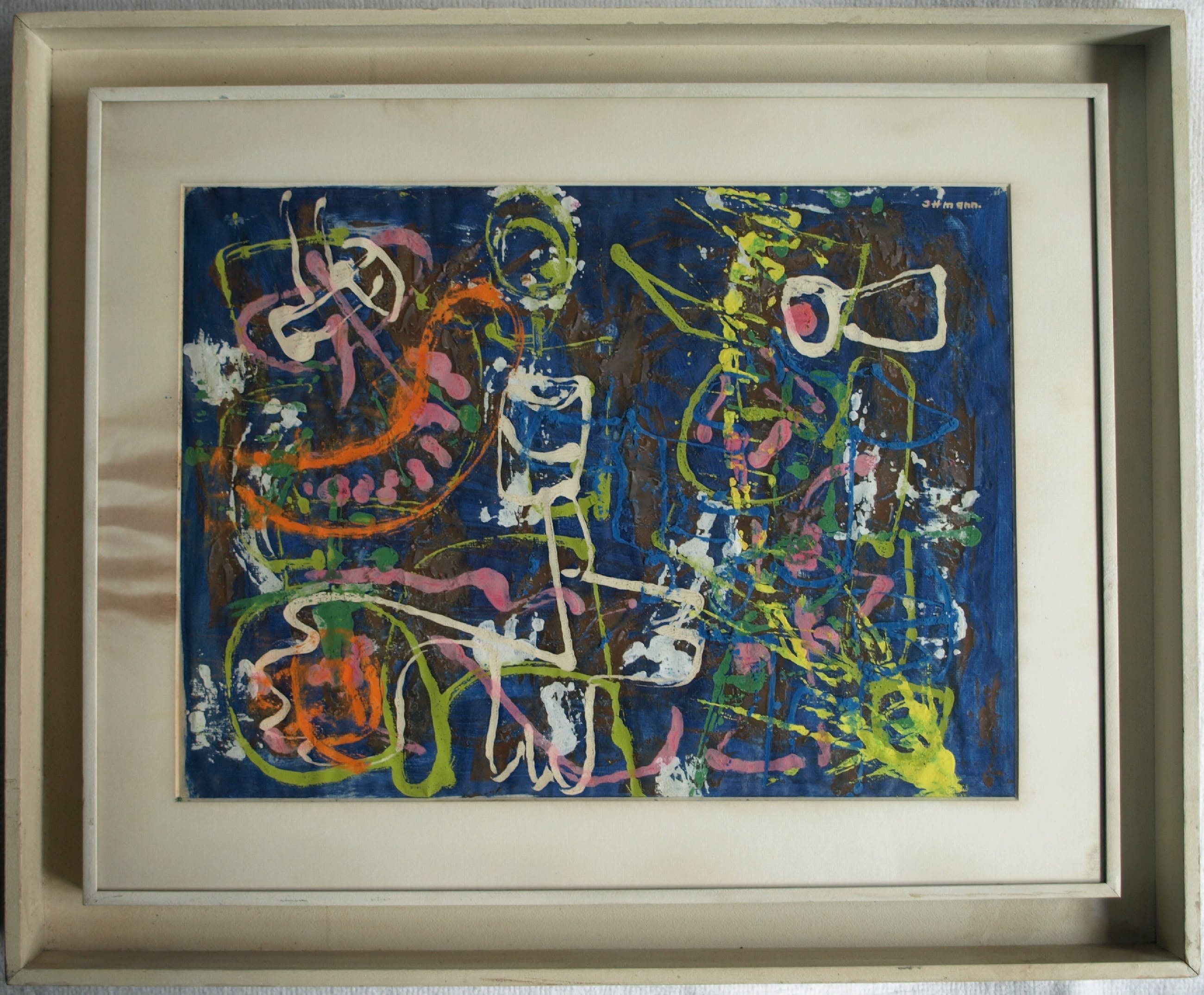Een ingelijst schilderij uit (waarschijnlijk) de late jaren ‘50 van de Nederlandse kunstenaar Hans Ittmann (1914-1972). -Gesigneerd rechtsboven. Op de achterkant van de lijst staat de titel (?) geschreven: "Optie". -‘Dubbel’ ingelijst in een houten lijst met kartonnen passe-partout en glasplaat en ook nog in een houten baklijst. -Afmetingen: Baklijst, 47 x 57 x 4 cm. 2e Lijst, 39,5 x 50 cm. Beeld, 30 x 40 cm. -Herkomst: Uit een inboedel. -Conditie: Het werk is in goede staat. Het passe-partout heeft aan de linkerrand vlekken. De lijst heeft slijtplekken en de baklijst heeft ook slijtplekken. Zie ook de foto’s voor een eigen indruk. Kan zo aan de muur.