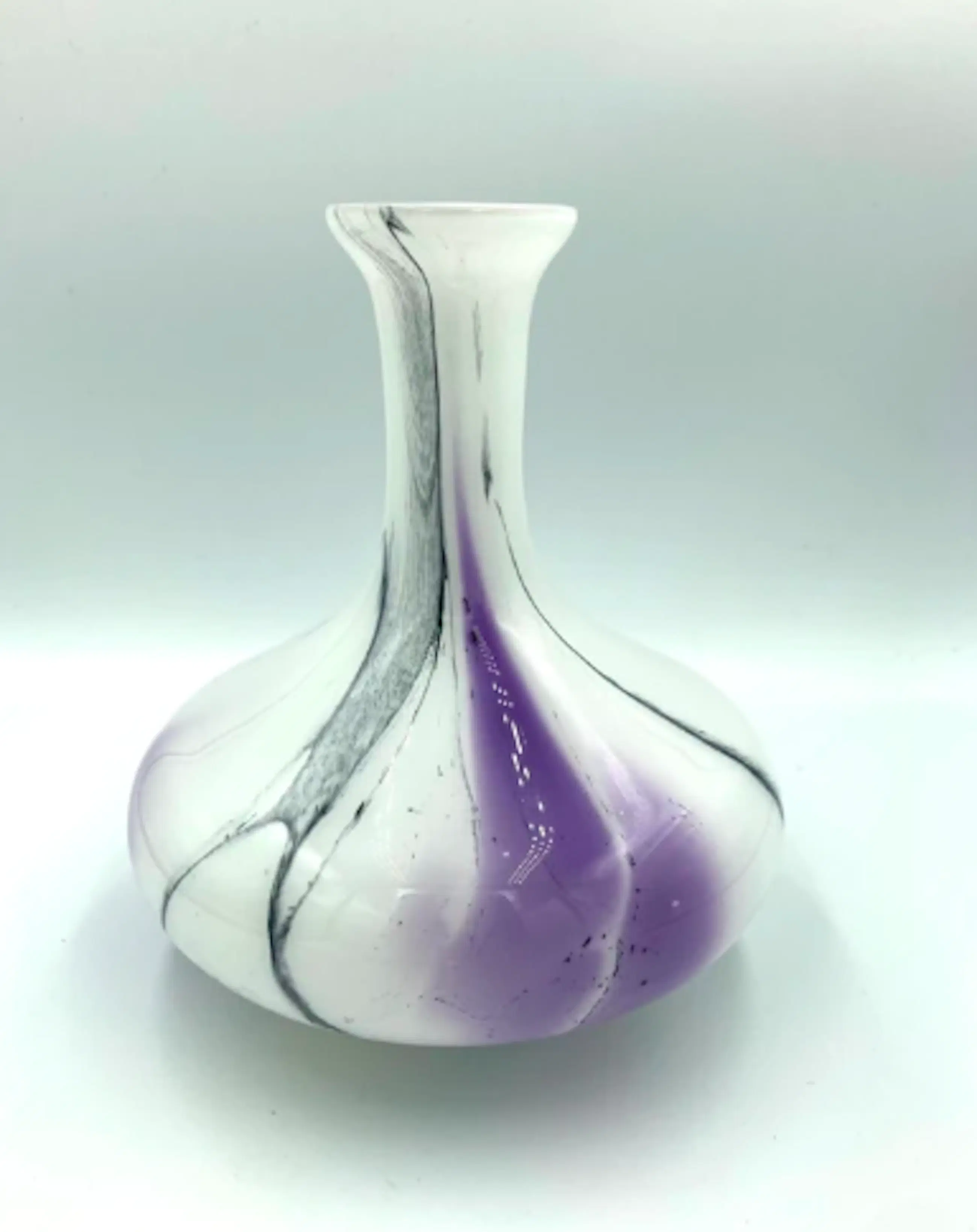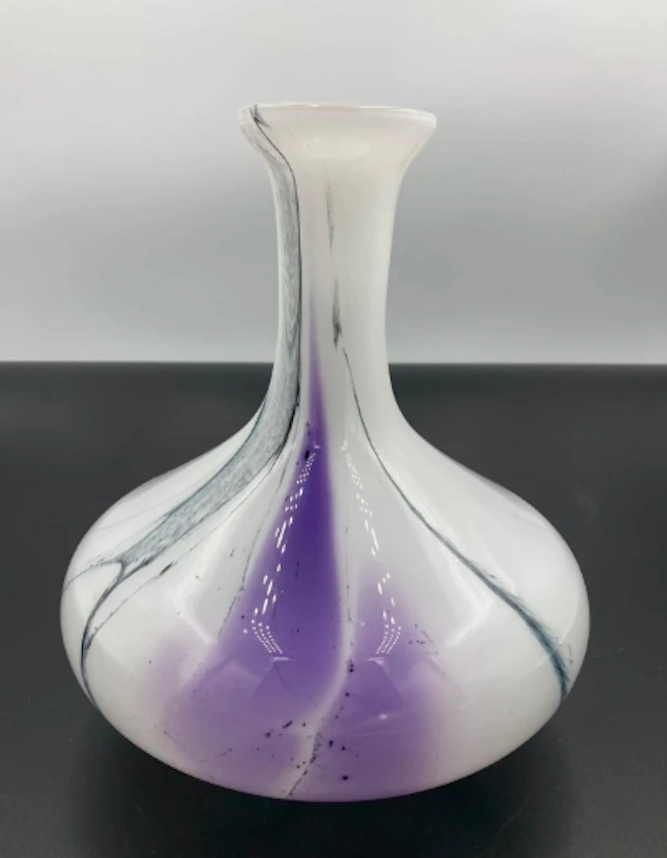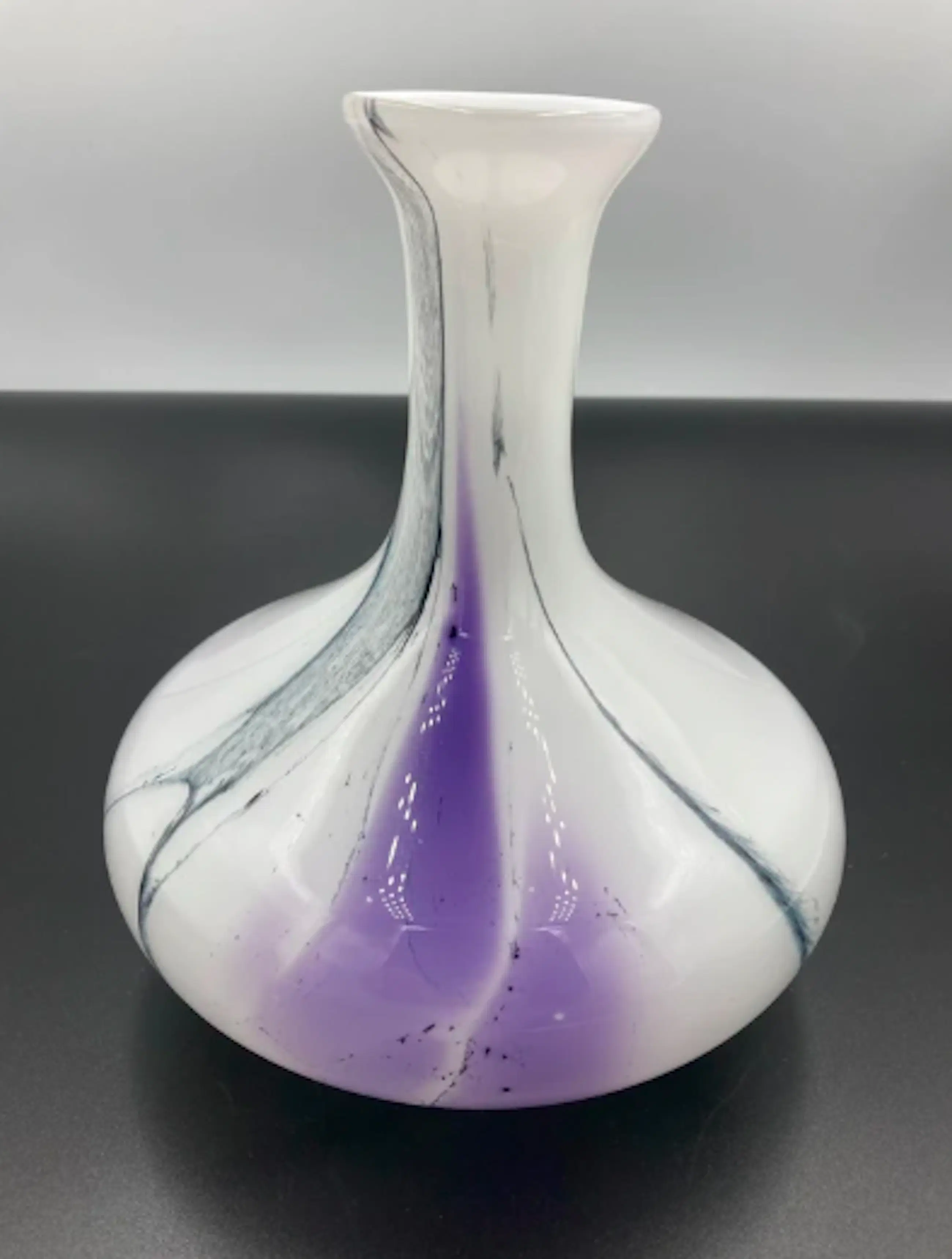 Prachtige vaas in wit opaline glas met een abstract decor van kleuren. De organische, vrij geblazen vorm met ingesmolten kleurbanen (paars en zwart in helder glas) is typisch voor het studioglas uit de jaren 1970, soms nog begin jaren ’80. De vaas is ontworpen voor de Reichard Art collection! De vaas in onderaan gesigneerd.