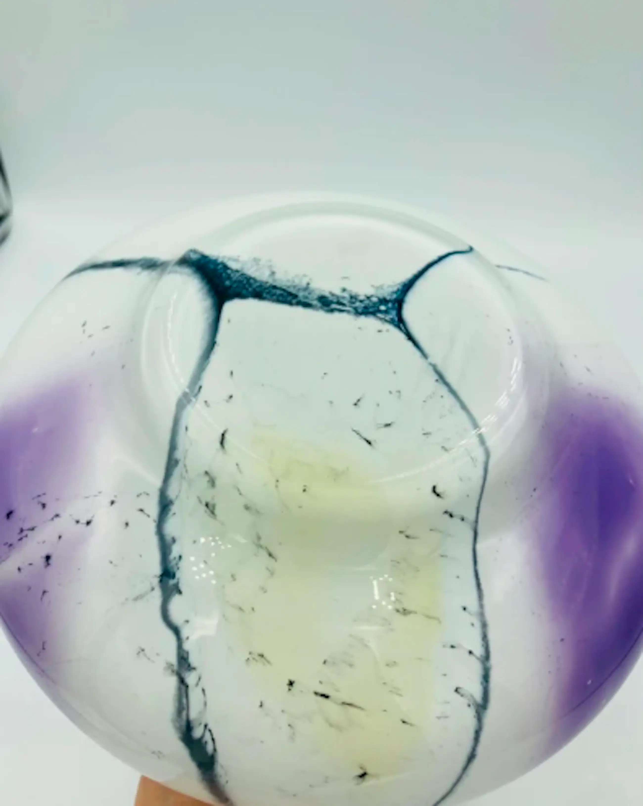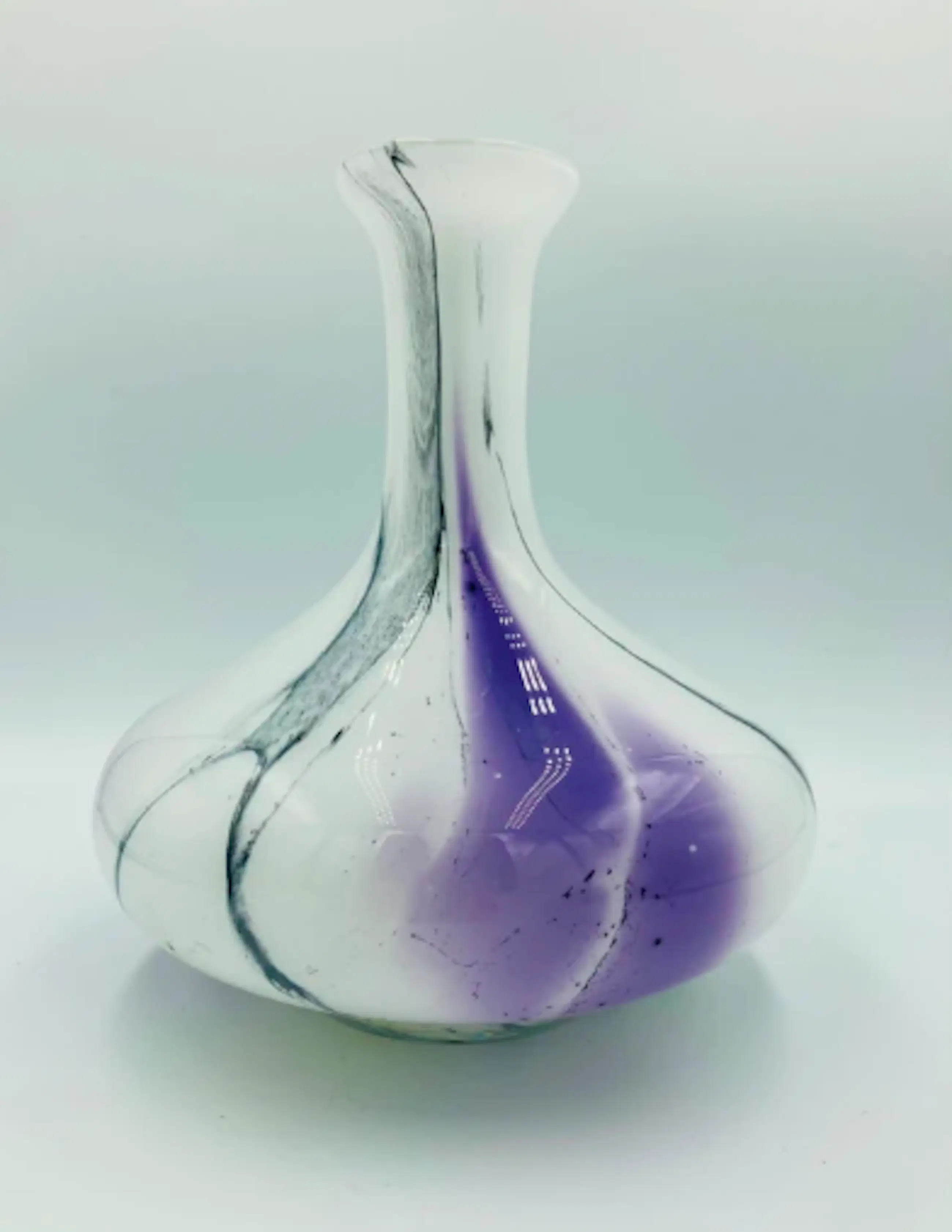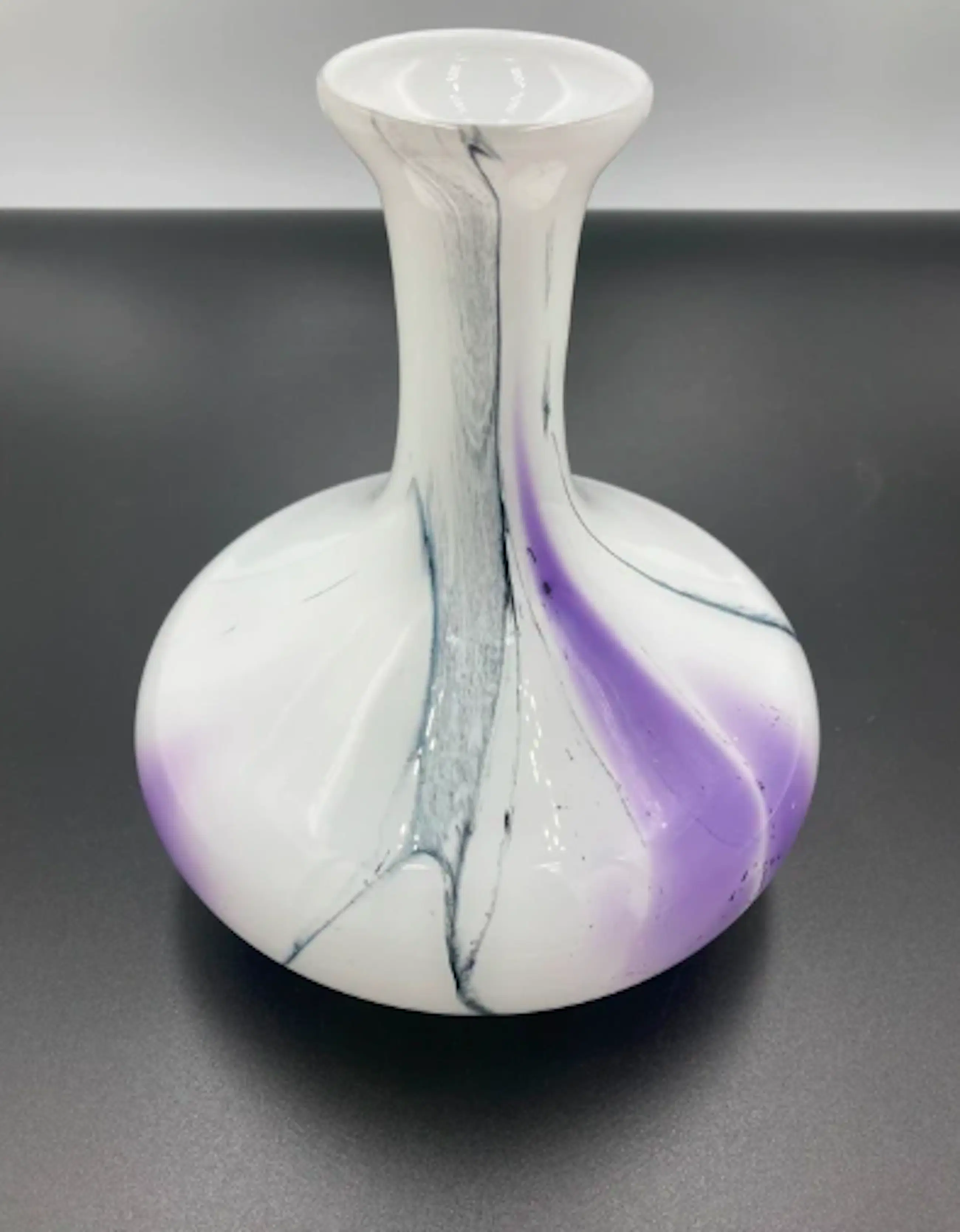 Prachtige vaas in wit opaline glas met een abstract decor van kleuren. De organische, vrij geblazen vorm met ingesmolten kleurbanen (paars en zwart in helder glas) is typisch voor het studioglas uit de jaren 1970, soms nog begin jaren ’80. De vaas is ontworpen voor de Reichard Art collection! De vaas in onderaan gesigneerd.