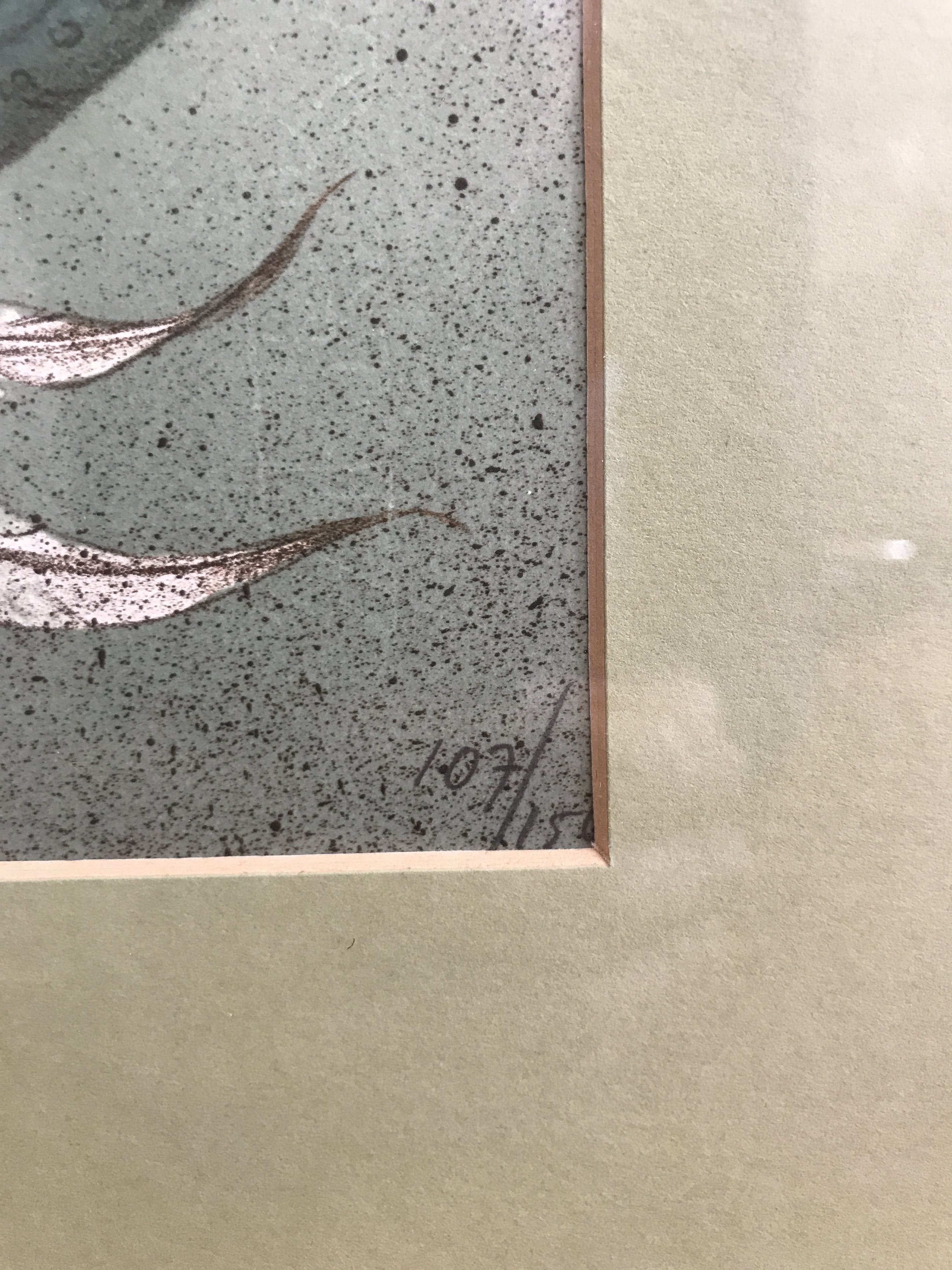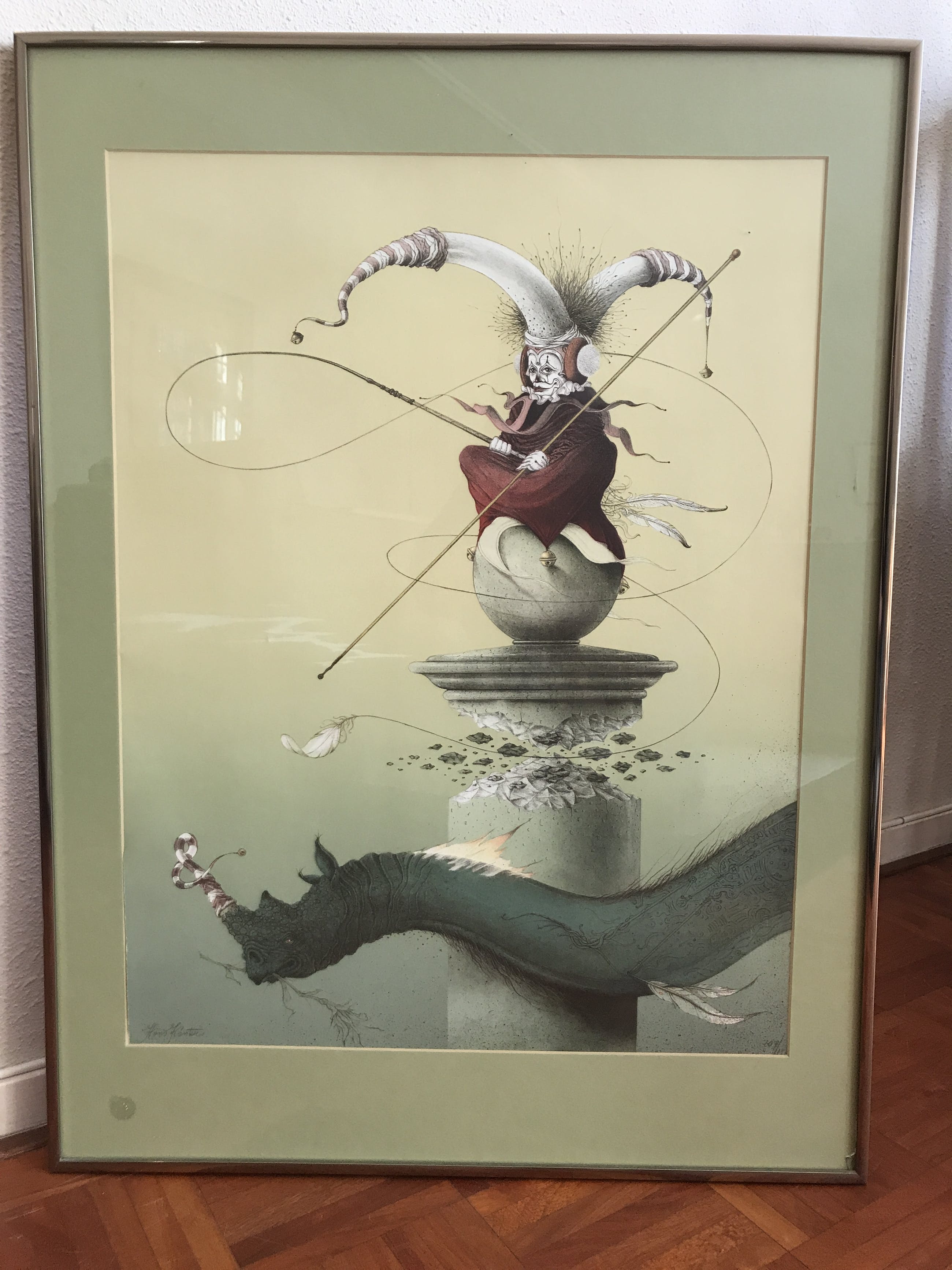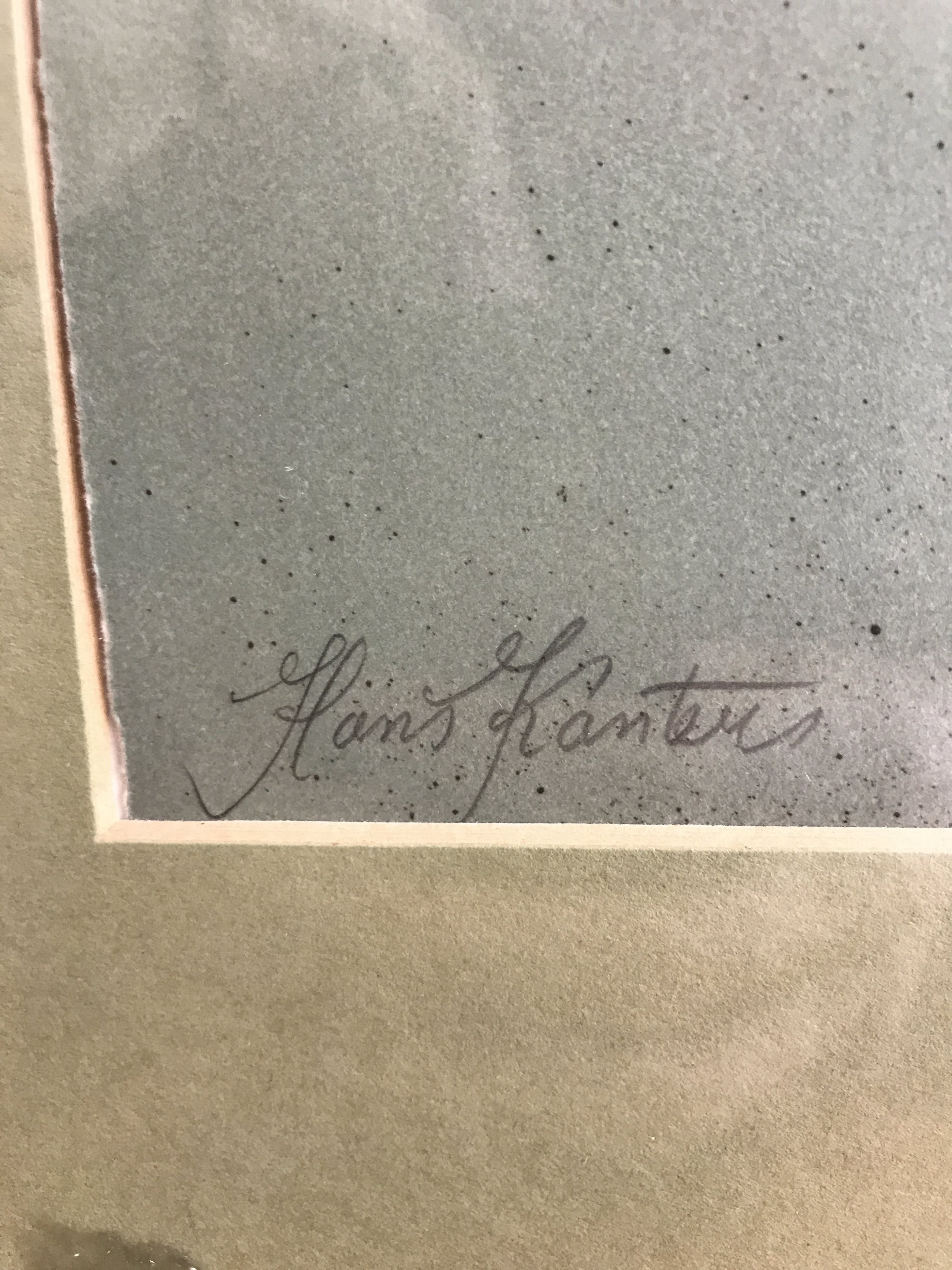 Groot formaat lithografie (steendruk) van Hans Kanters in zijn kenmerkende creatieve stijl. Dit werk is nr. 107 uit een oplage van 150 stuks. Aangeschaft en ingelijst in 1987. Bronzen lijsten.