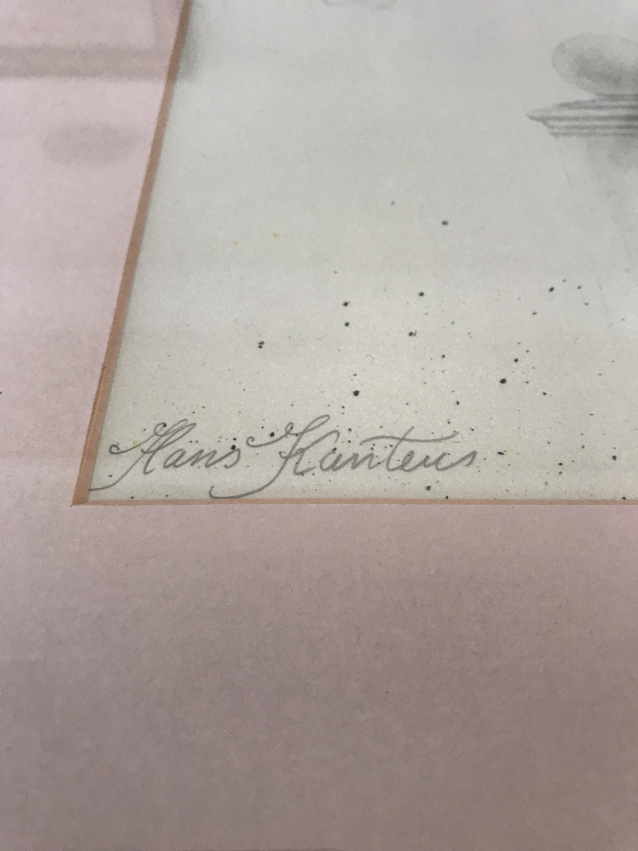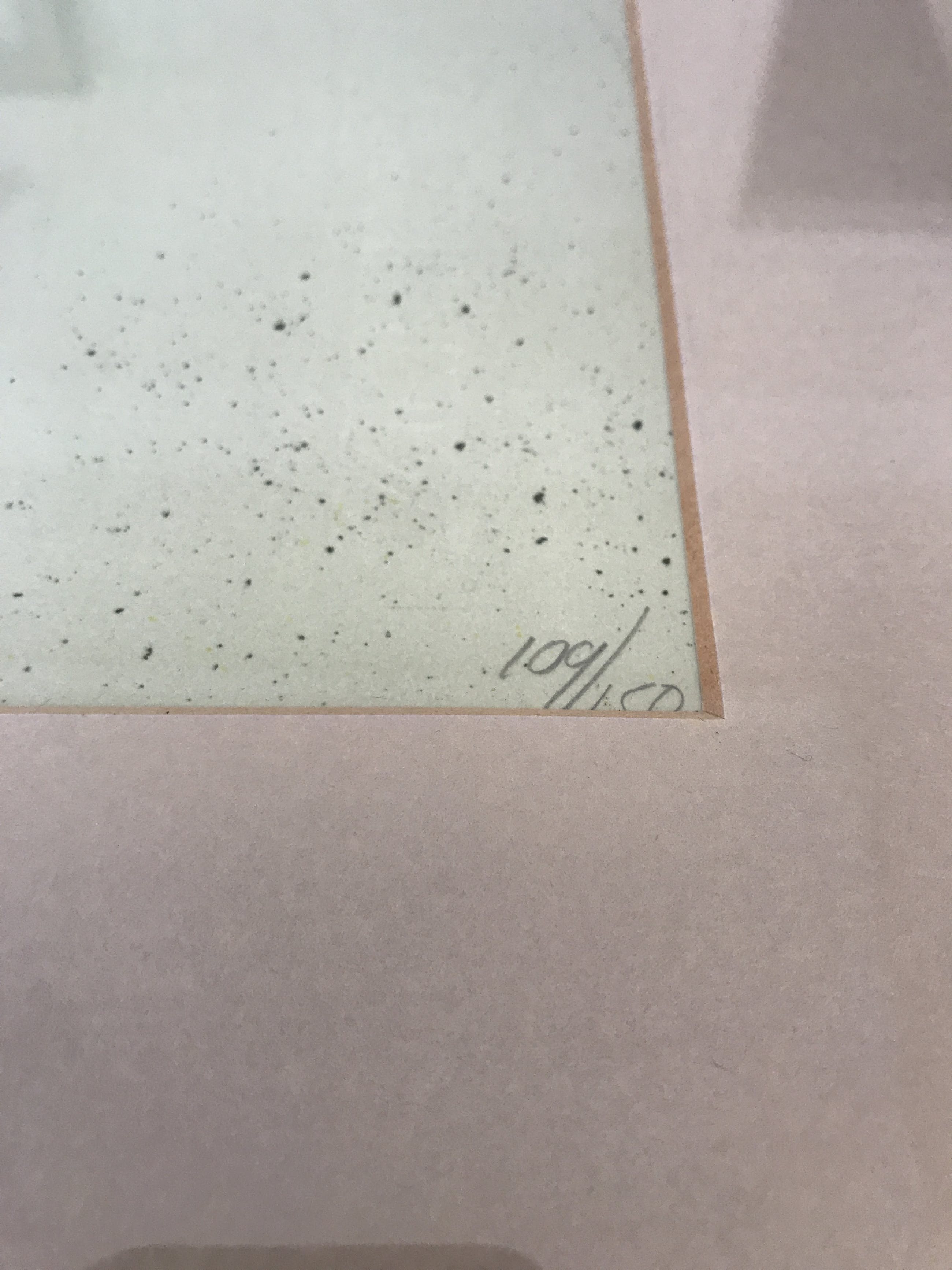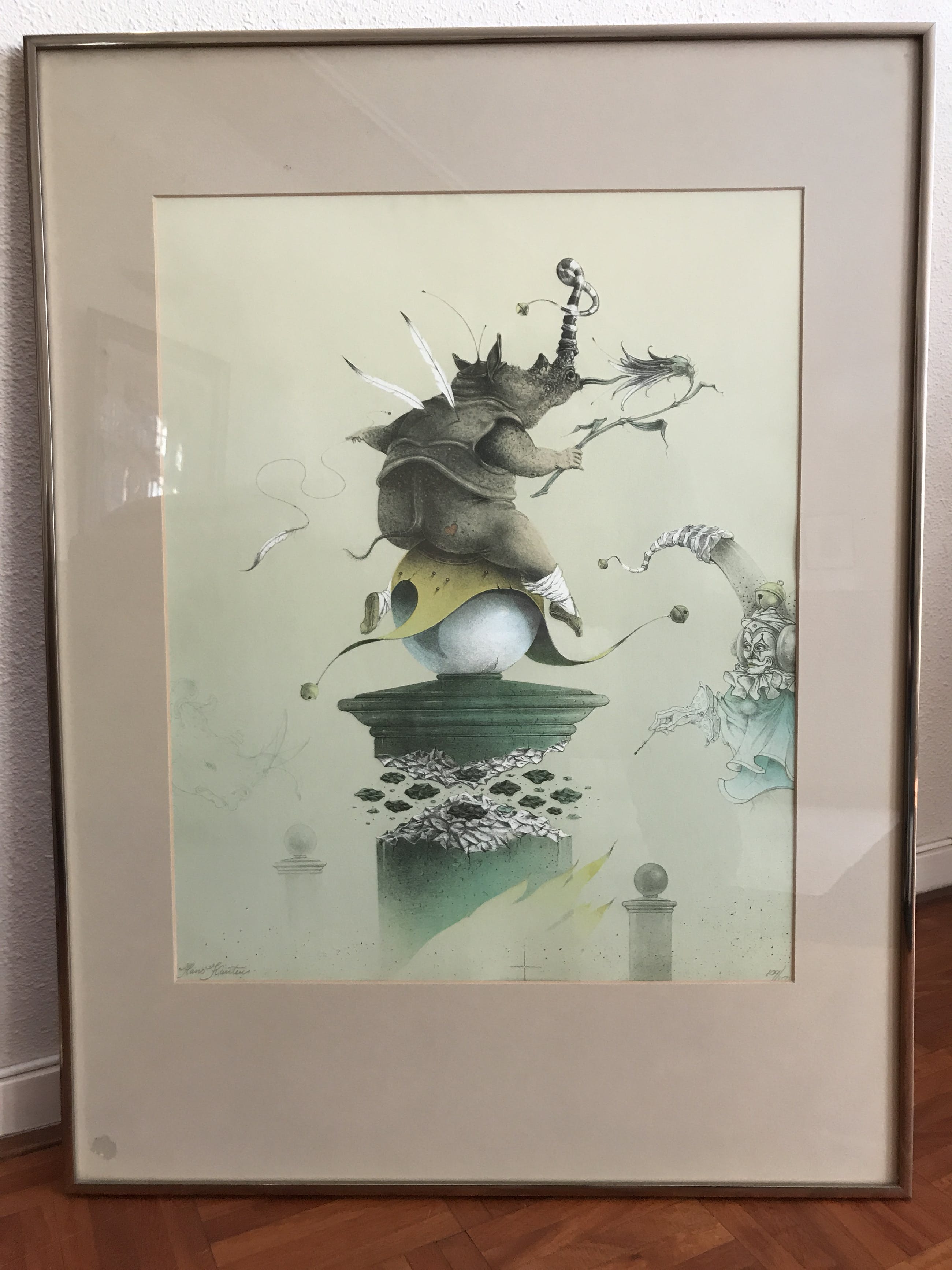 Groot formaat lithografie (steendruk) van Hans Kanters in zijn kenmerkende creatieve stijl. Dit werk is nr. 109 uit een oplage van 150 stuks. Aangeschaft en ingelijst in 1987. Het materiaal van de lijst is brons.