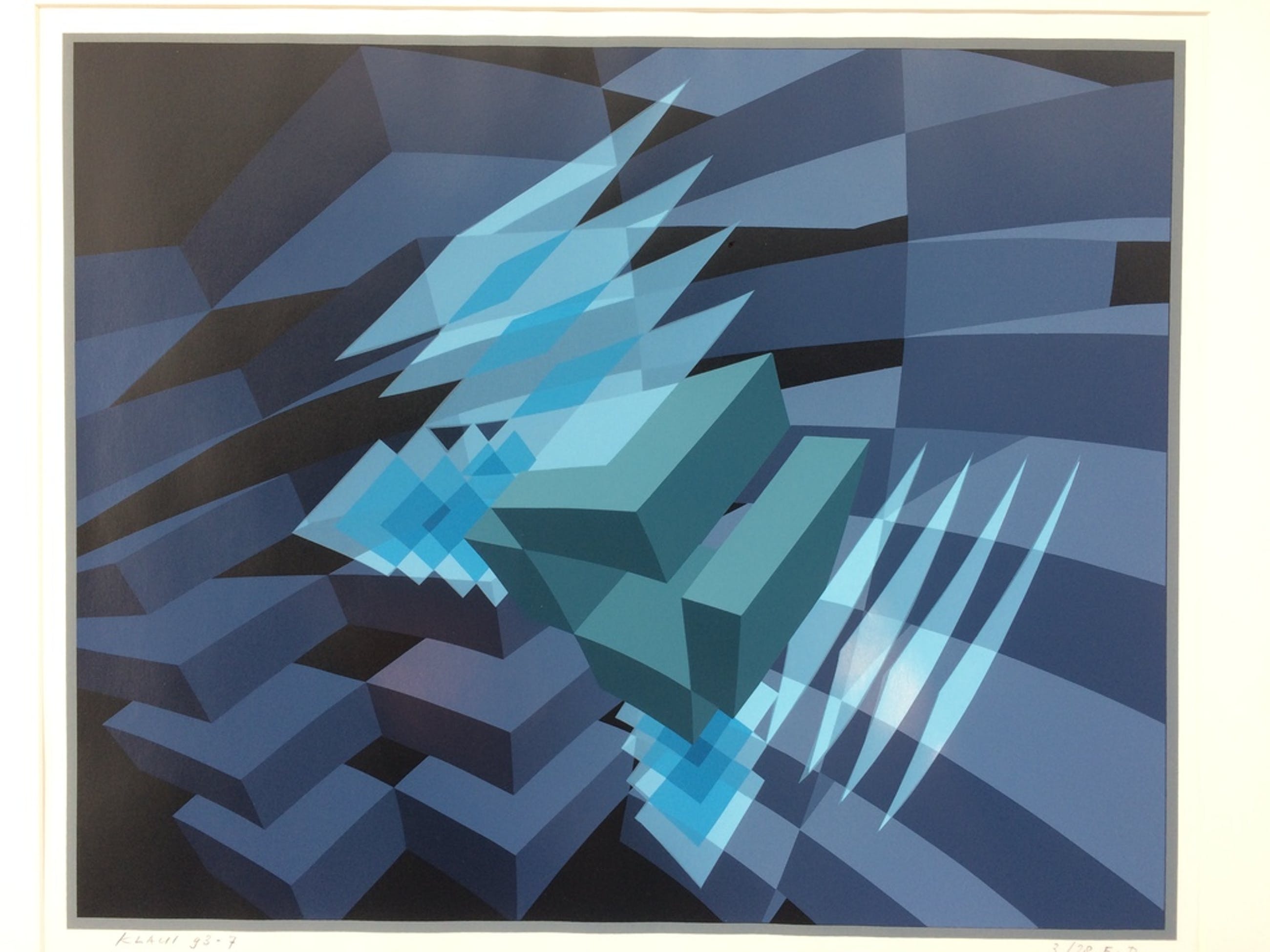 Mooie geometrische zeefdruk van Hans Klaui, prentmaat 50 x 60 cm en met passe partout 60 x 80 cm. Verkeert in perfecte staat. Gedrukt in een oplage van 28 exemplaren, dit is nummer 3. Kan worden afgehaald met passe partout in onze galerie in Arkel of verzonden worden zonder passe partout per aangetekende post in een stevige kartonnen verpakking. In verband met onze grote collectie Hans Klaui kan de nummering op de foto afwijken van het beschreven werk. De beschreven nummering is de juiste. QQGEO