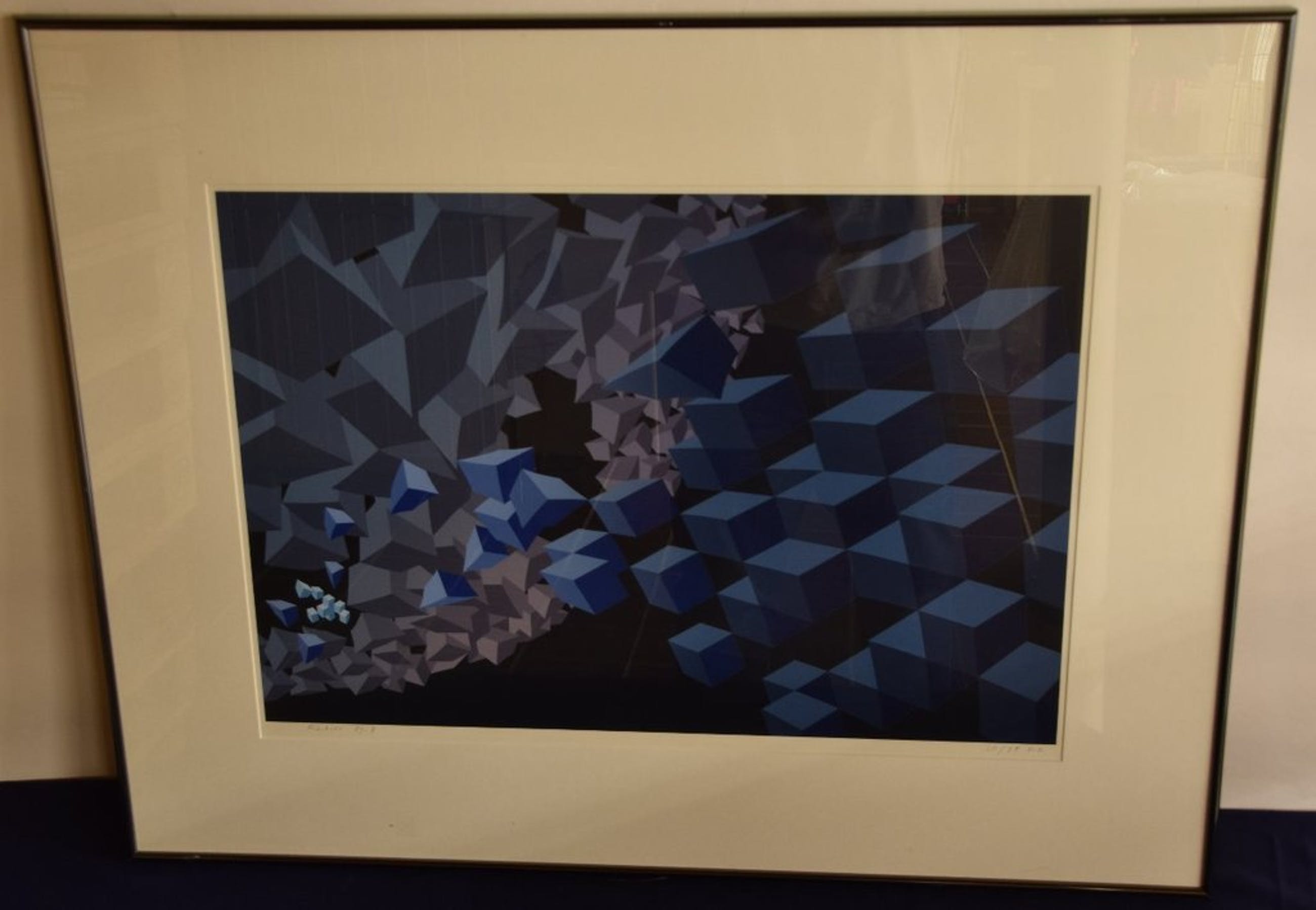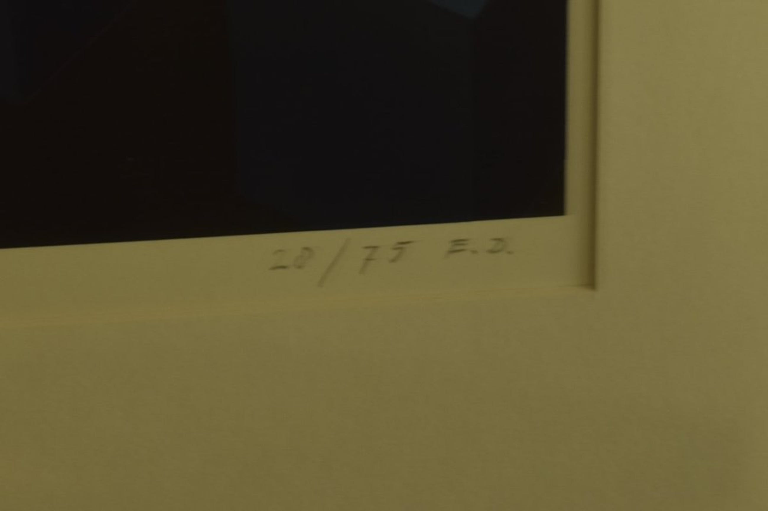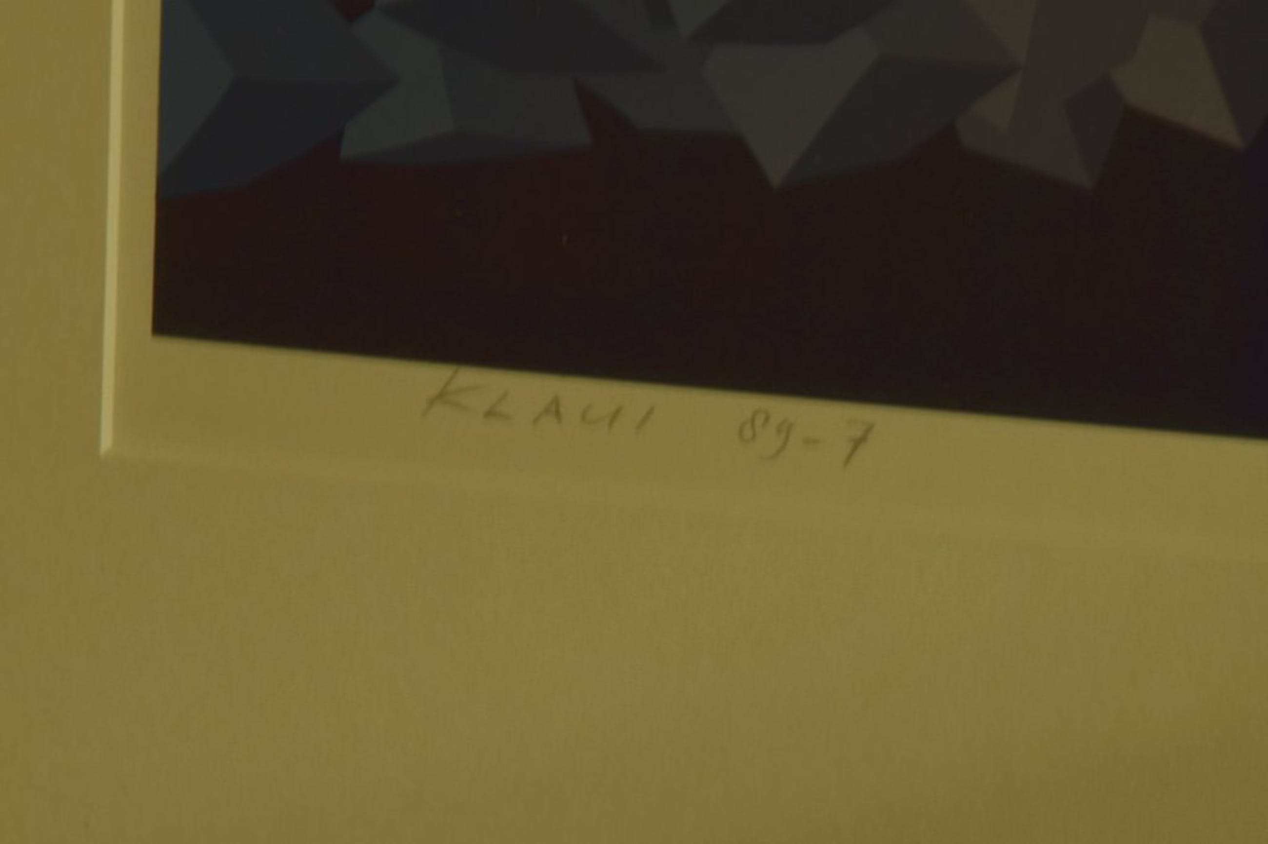 Nette zeefdruk in beperkte oplage van Hans Klaui uit 1989. Werk is ingelijst in zwarte aluminium lijst met passe-partout en voorzien van glasplaat.