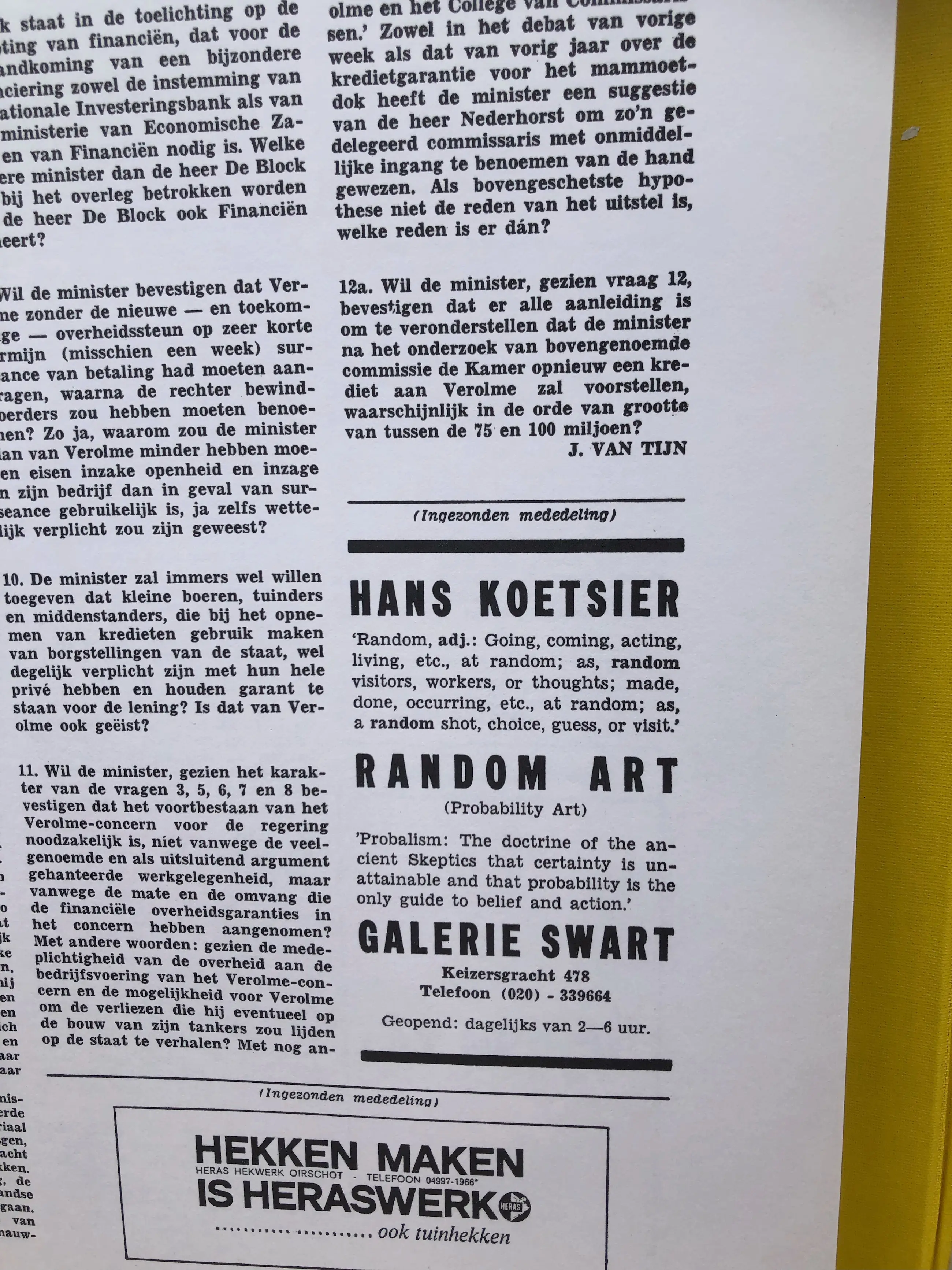 Curious collection of artwork originally exhibited in the form of advertisements in the Dutch newspapers Vrij Nederland, Het Parool and NRC Handelsblad.